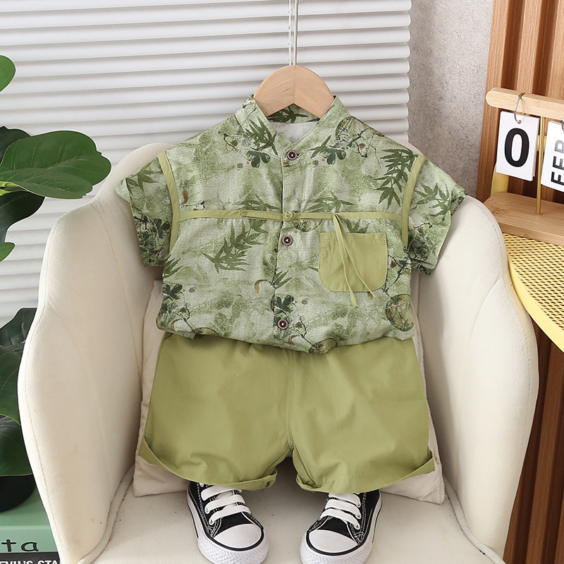 2024 년 여름 새로운 소년 소녀 국가 스타일 반팔 아동복 민족 스타일 투피스 어린이 세트 유아 여름복
