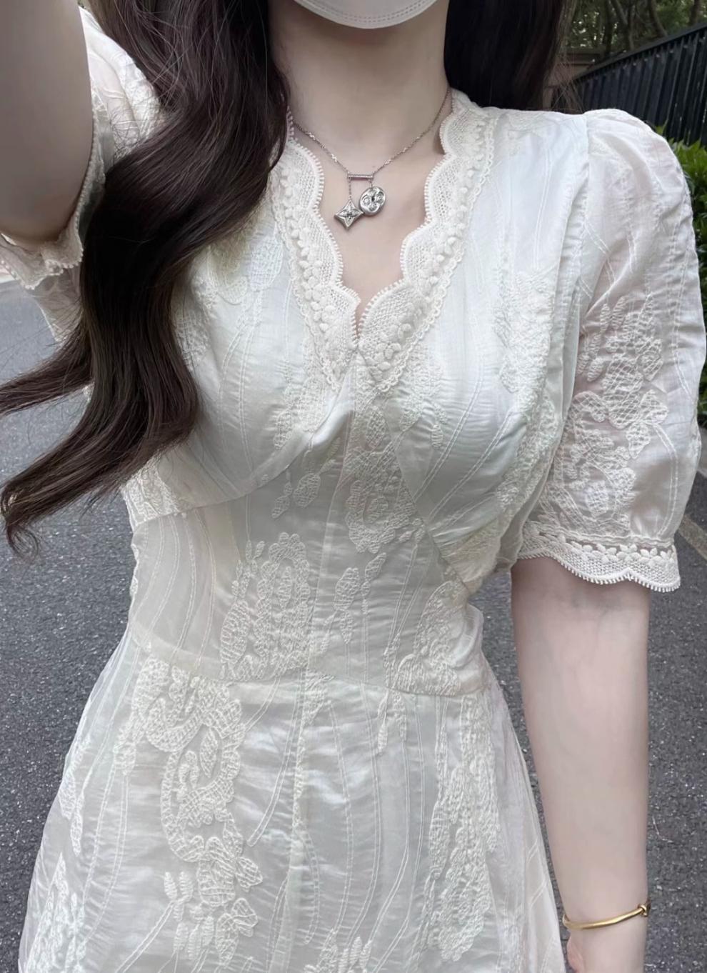 디자인 센스 레이스 퍼프 슬리브 원피스 여름 프랑스 기질 허리 디자인 센스 V-넥 화이트 롱 원피스 여성 패션스토어 가기