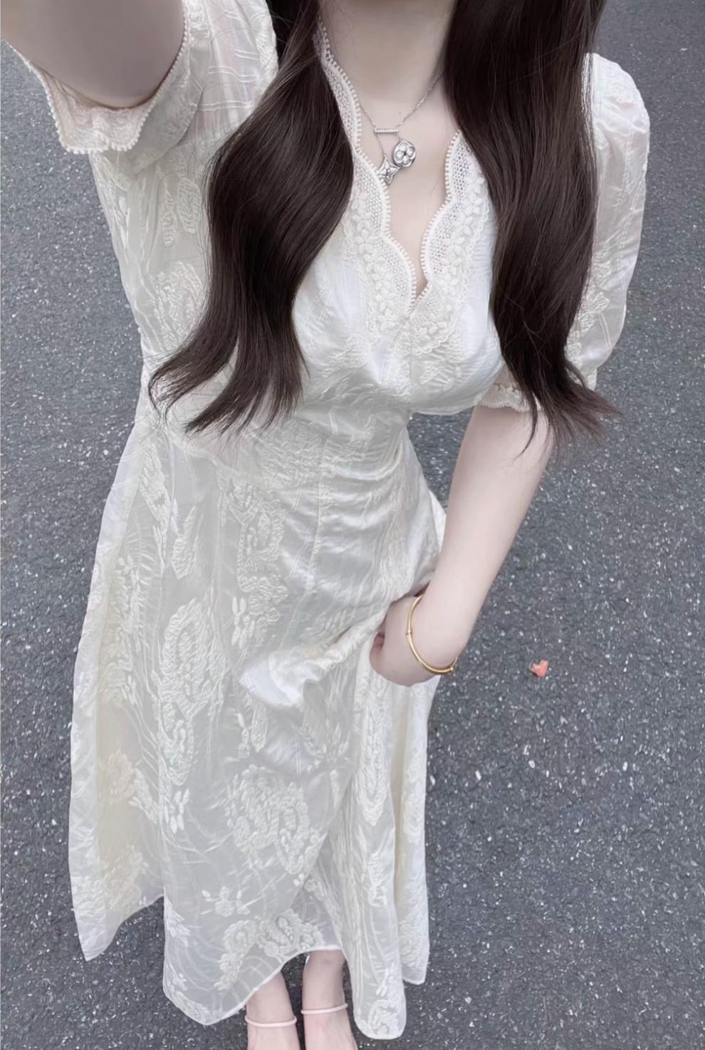 디자인 센스 레이스 퍼프 슬리브 원피스 여름 프랑스 기질 허리 디자인 센스 V-넥 화이트 롱 원피스 여성 패션