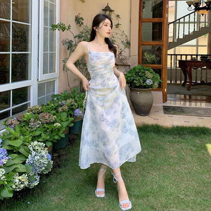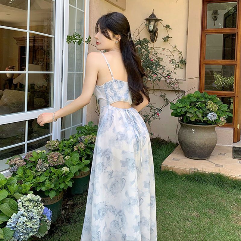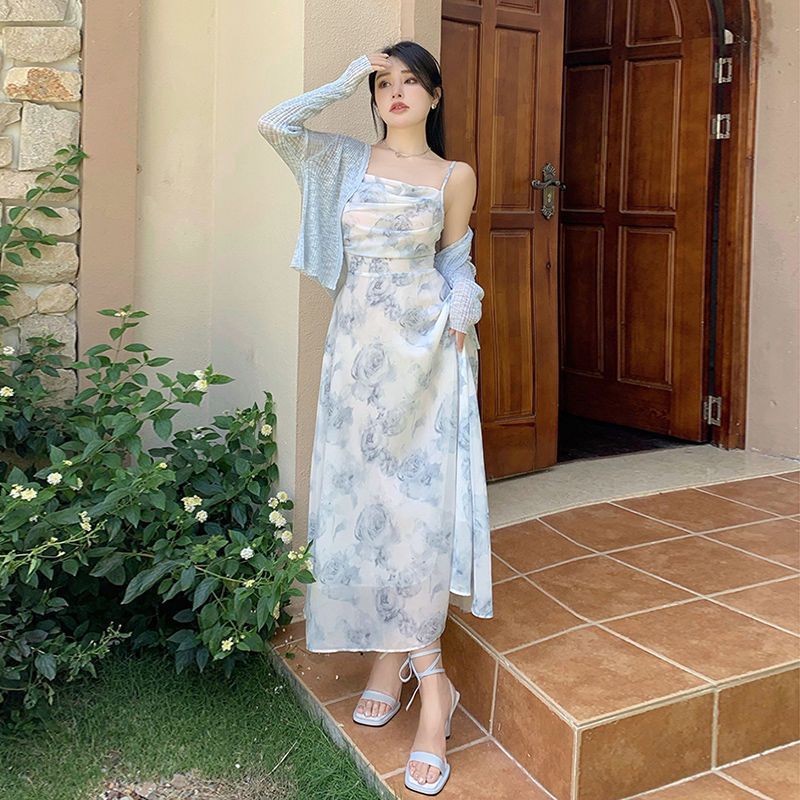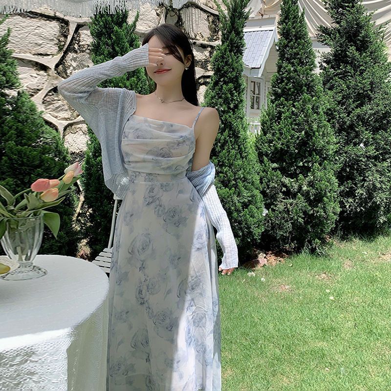 여성용 여행복 투피스 세트, 꽃무늬 끈 원피스와 니트 가디건, 패셔너블한 비치 드레스스토어 가기