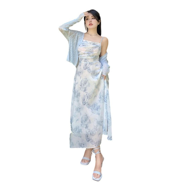 여성용 여행복 투피스 세트, 꽃무늬 끈 원피스와 니트 가디건, 패셔너블한 비치 드레스