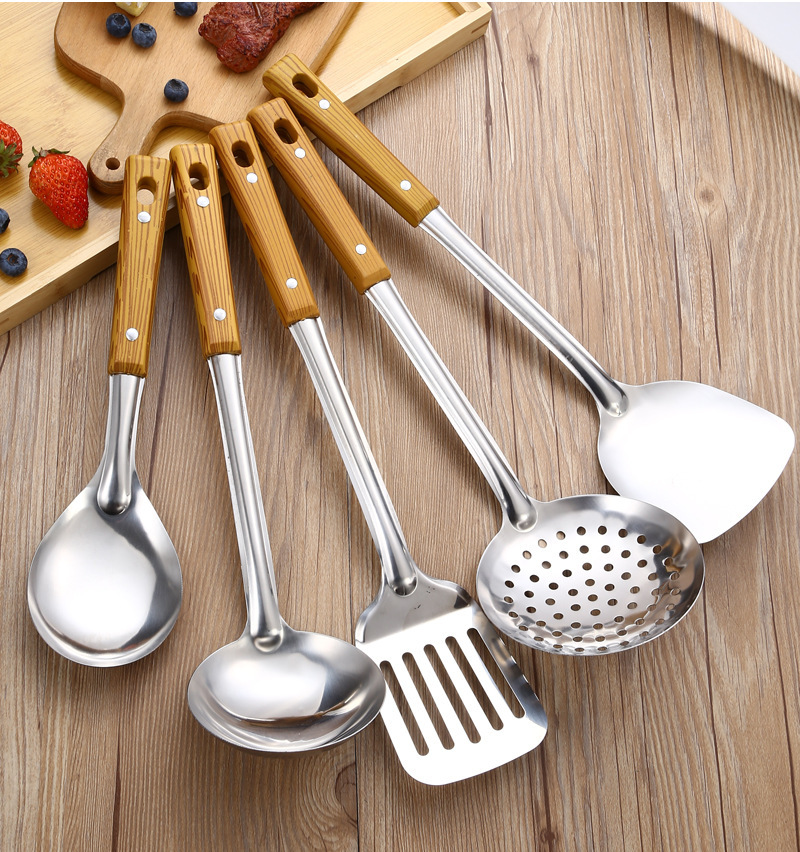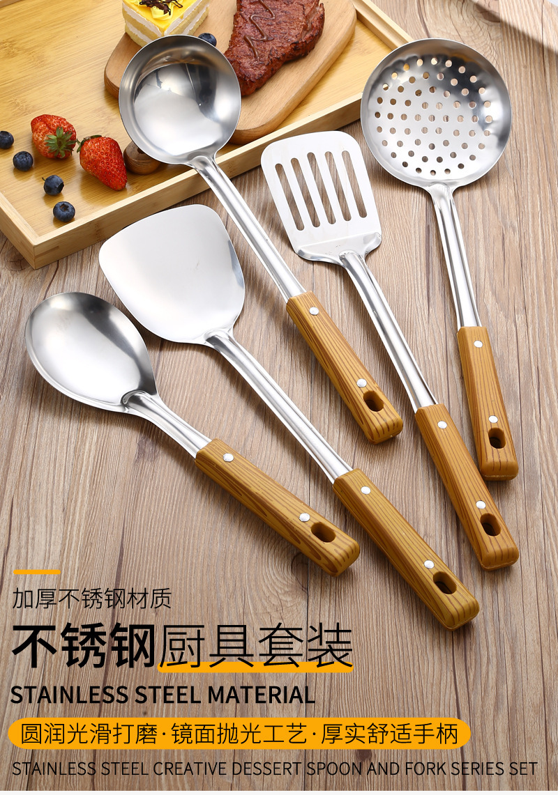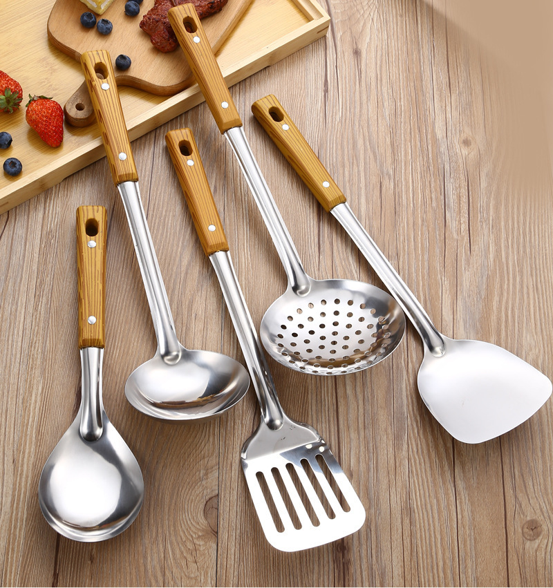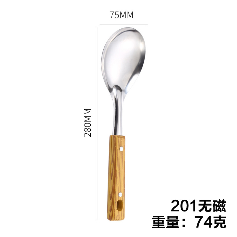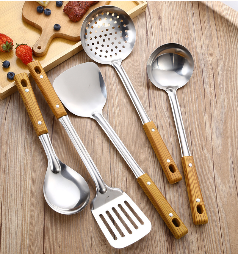 1.2 비 자성 스테인레스 스틸 냄비 삽 수프 스푼 우드 그레인 핸들 볶음 삽 스푼 색소 가구 요리 주방용품 5 피스 세트
