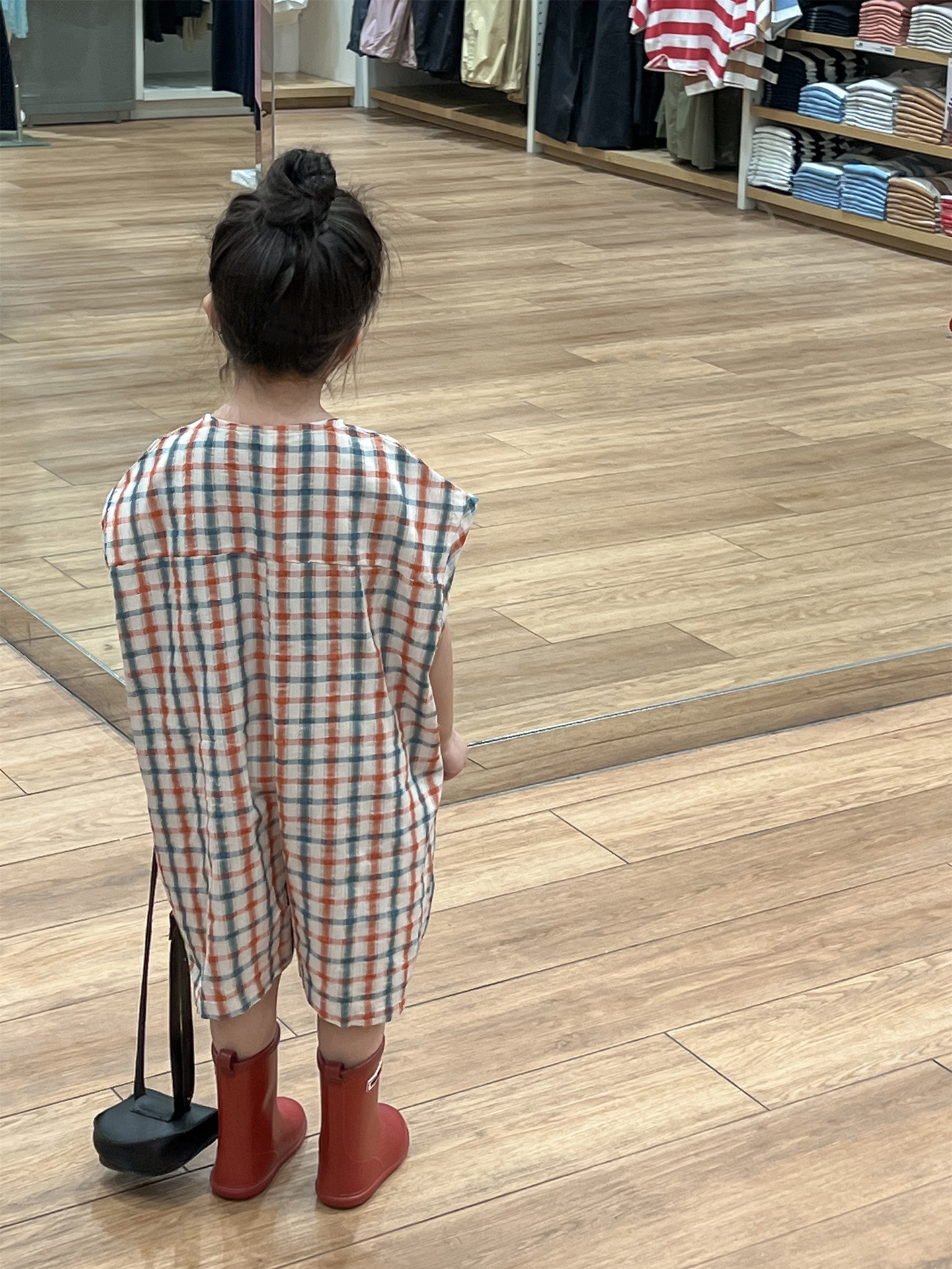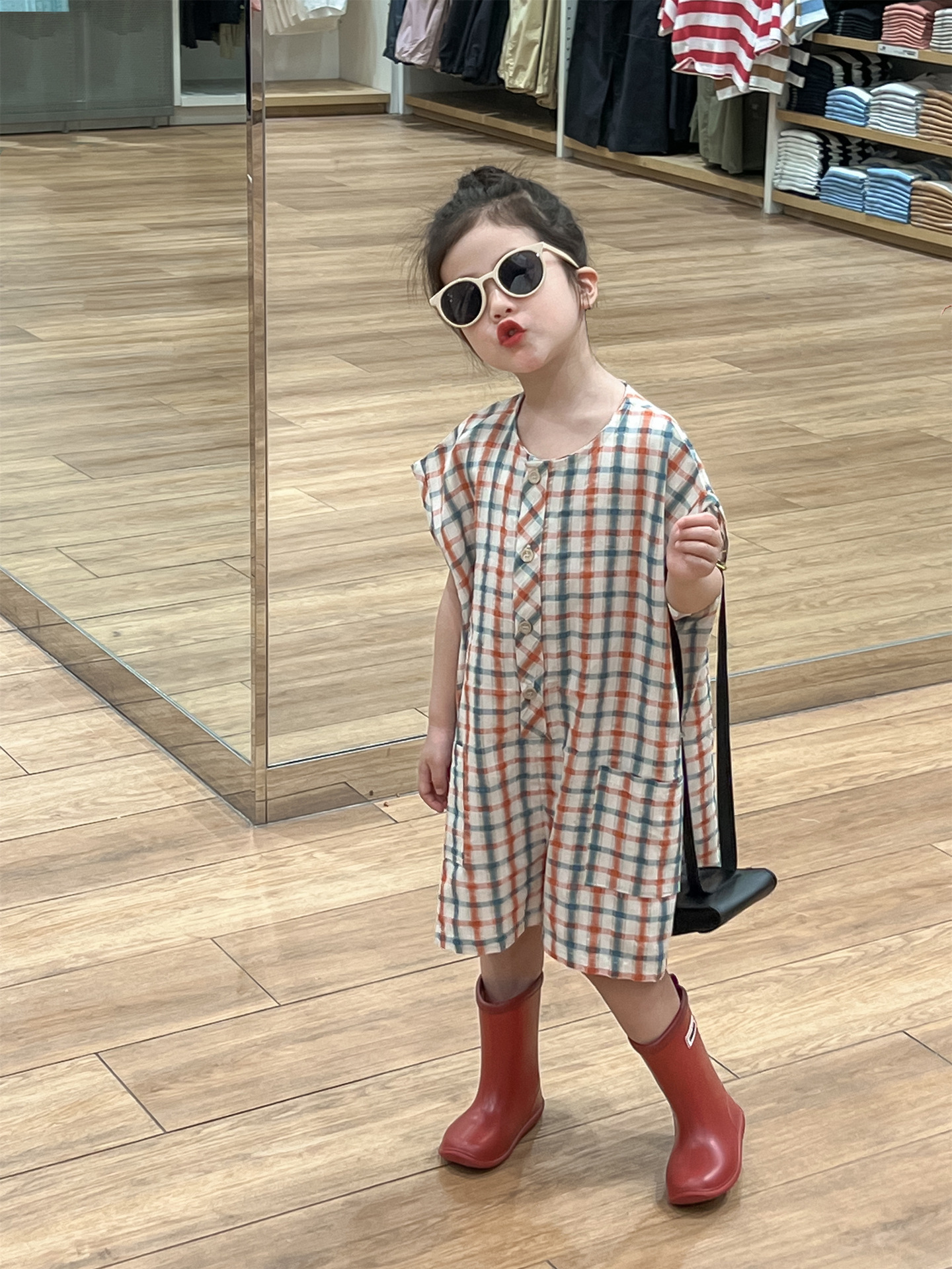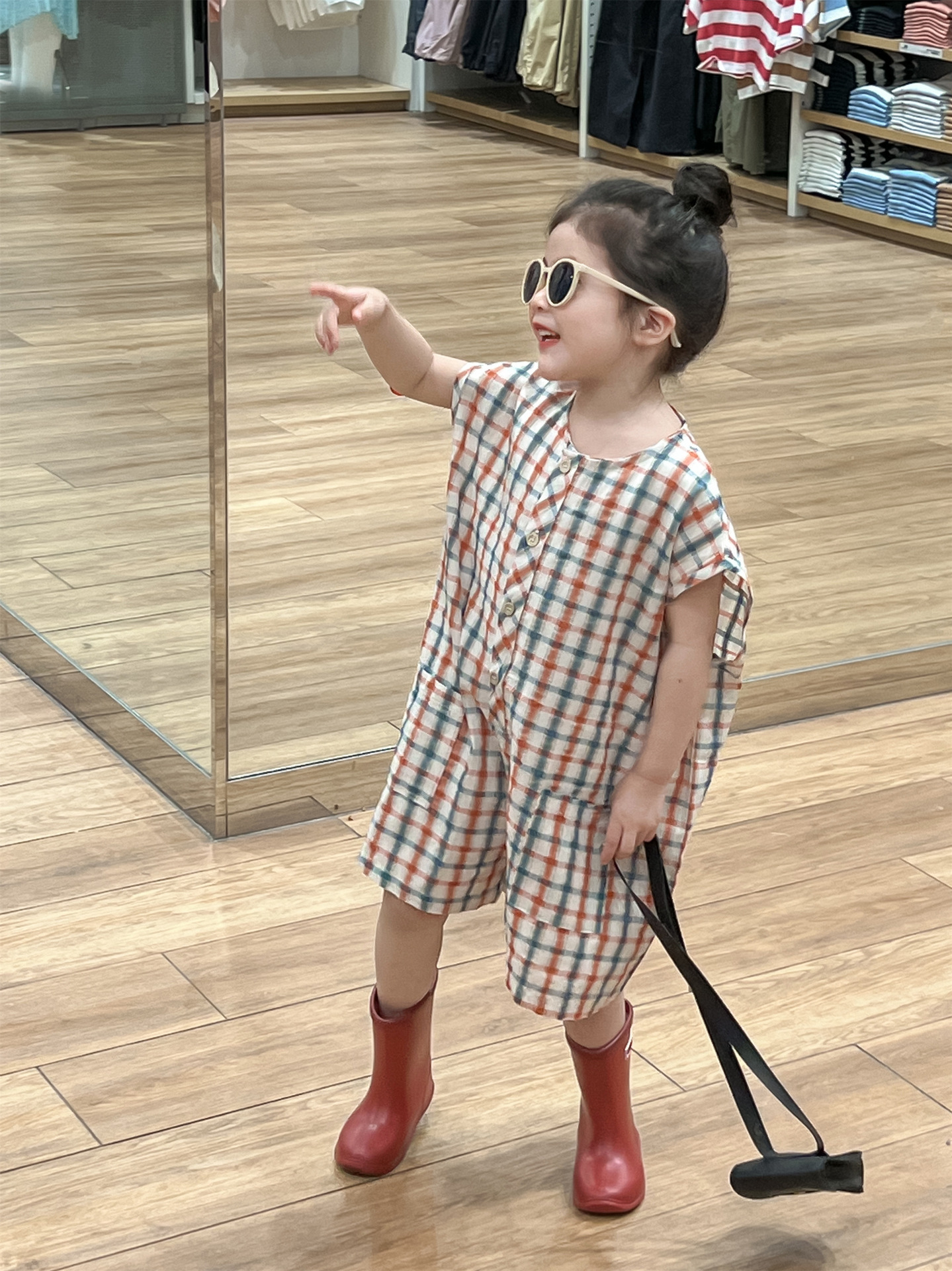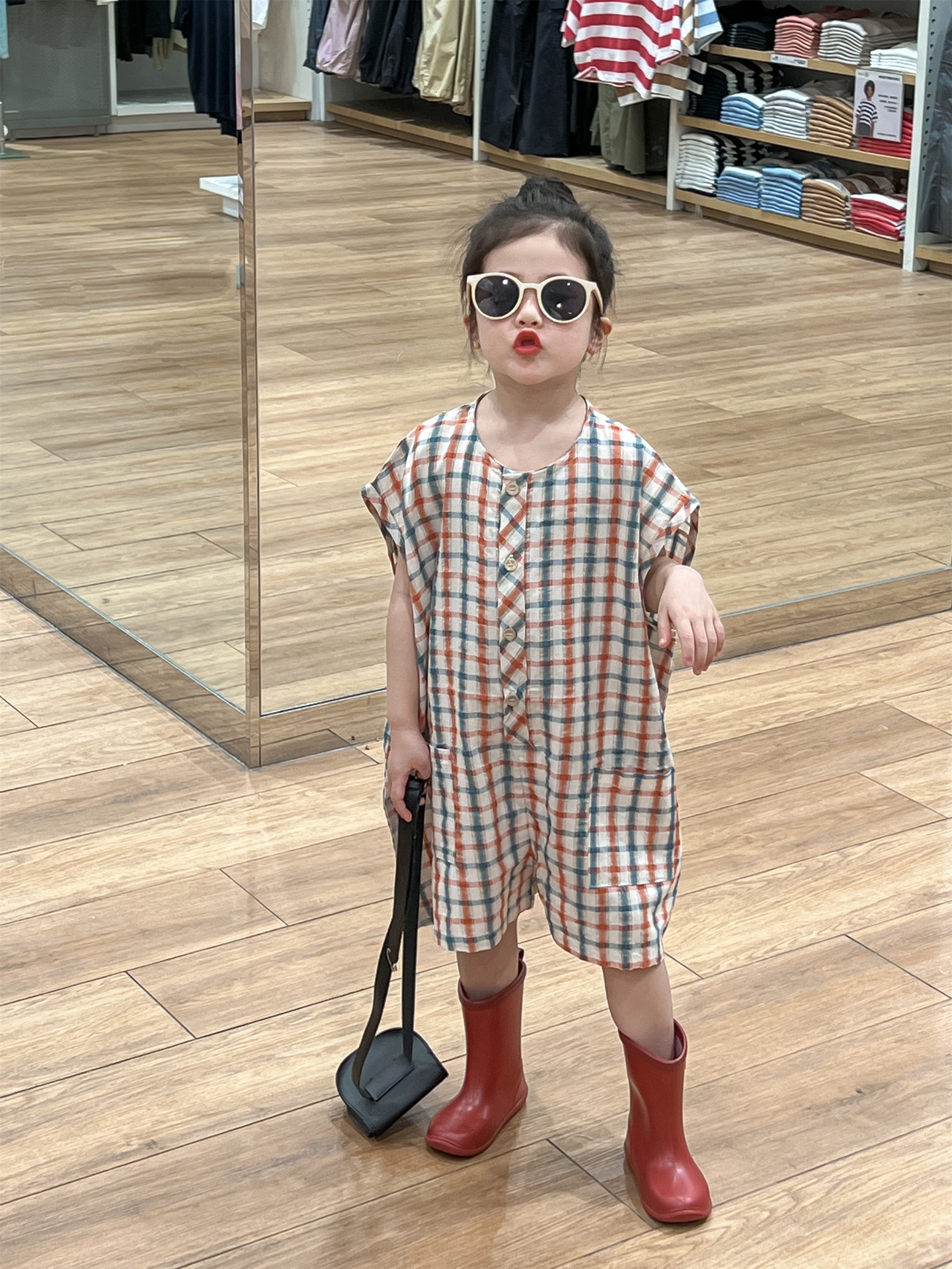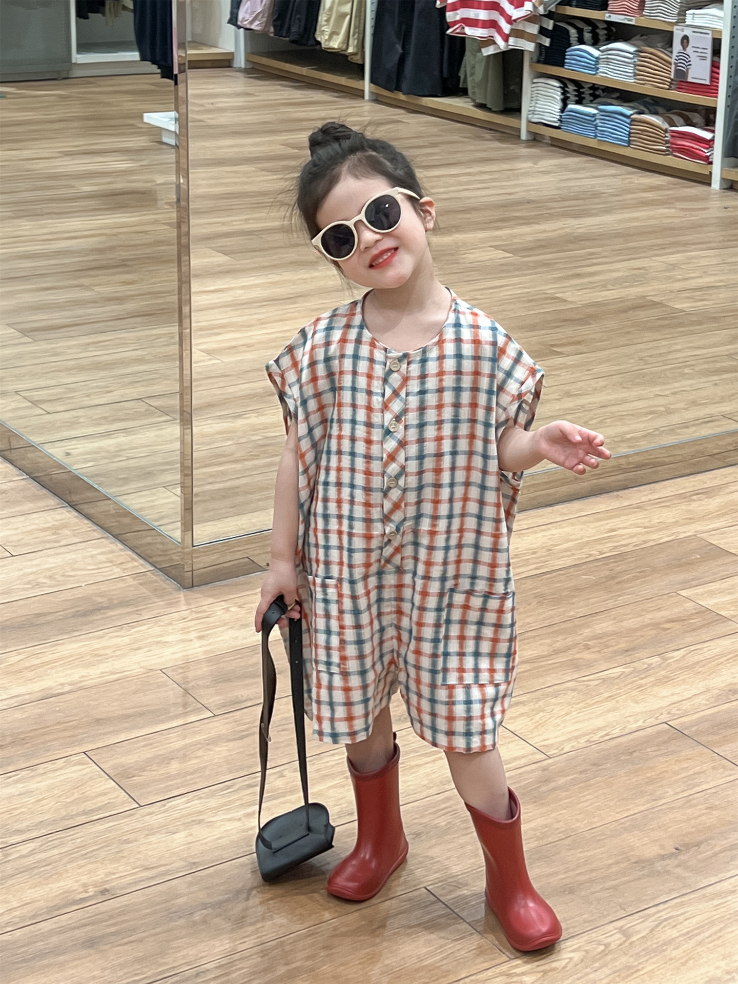 소년 소녀 아기의 여름 땀 흡수성 통기성 버블 체크 무늬 느슨한 와이드 레그 점프 수트 반바지를위한 아기와 유아의 점프 수트스토어 가기