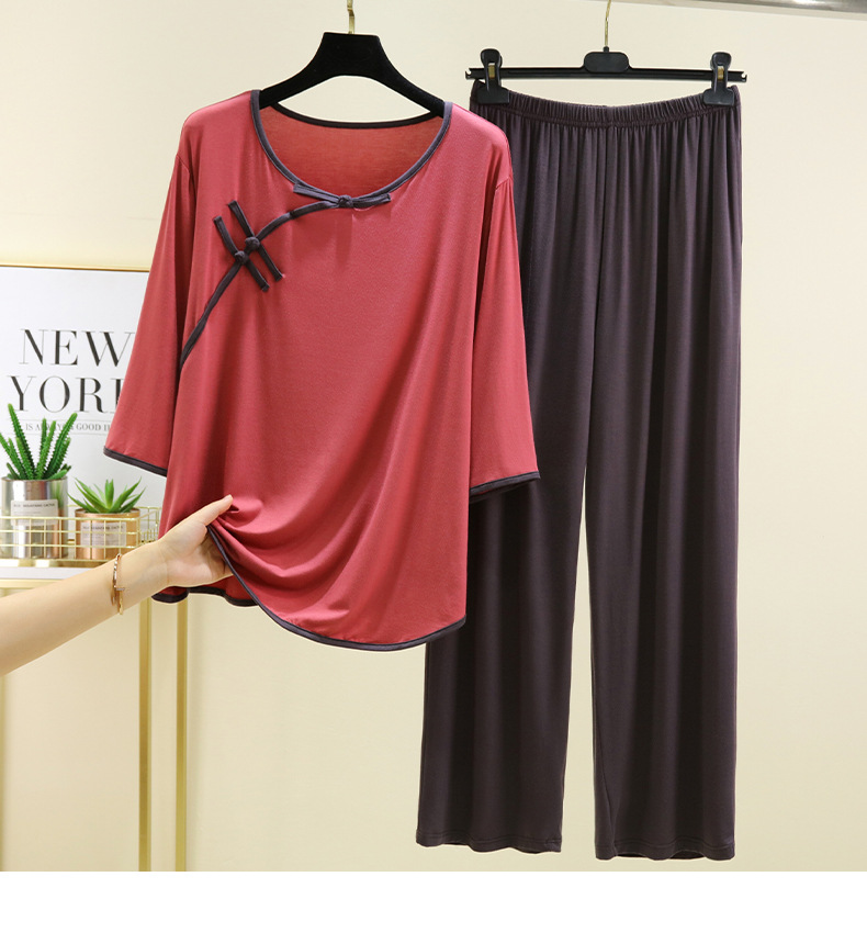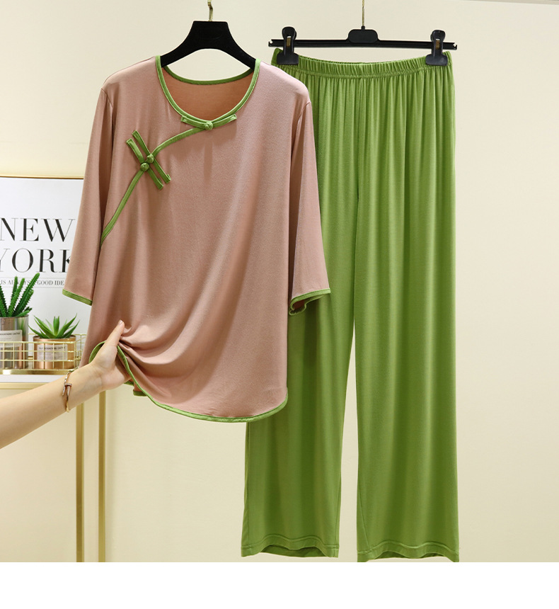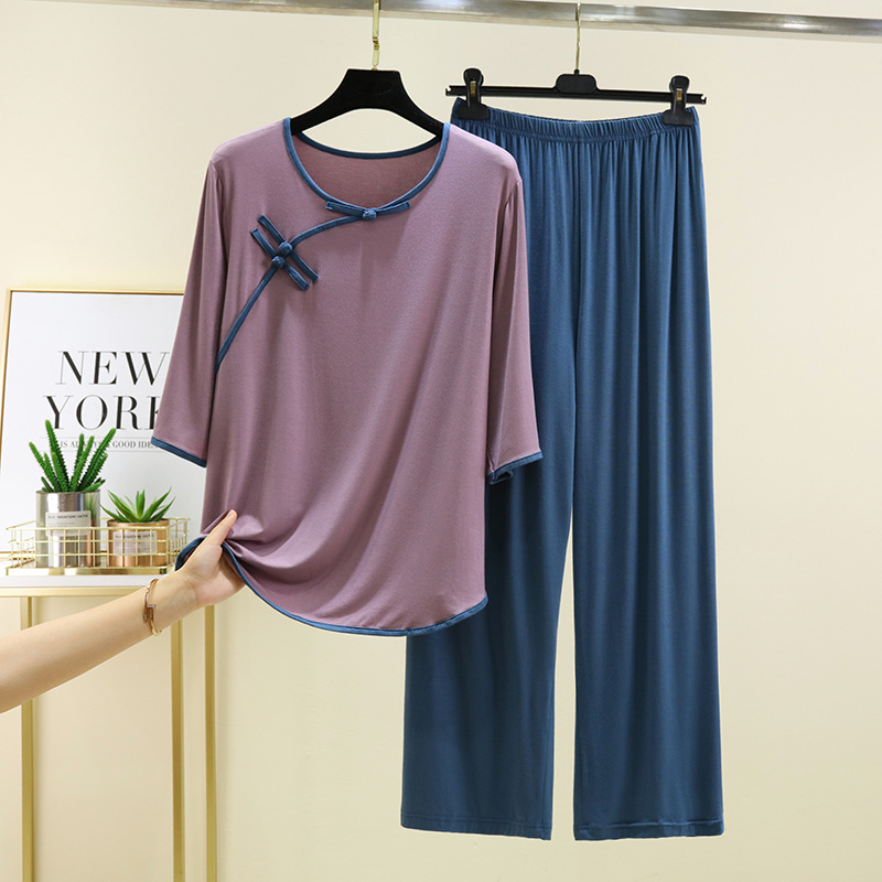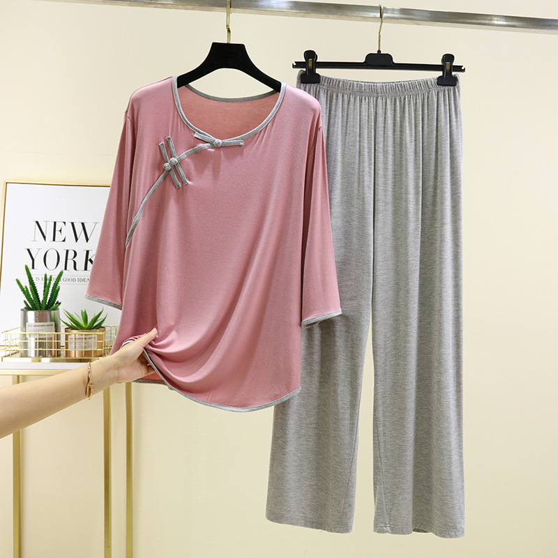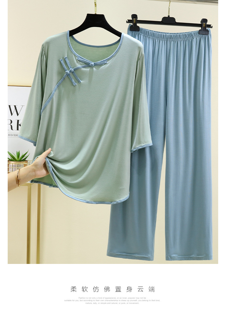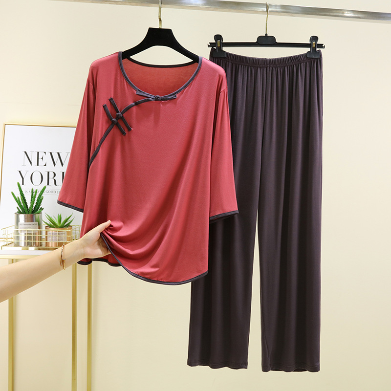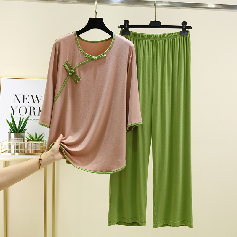 새로운 중국 스타일 국가 스타일 잠옷 세트 여성의 봄과 여름 모달 홈 의류 외부 착용 대형 느슨한 투피스 얇은 세트