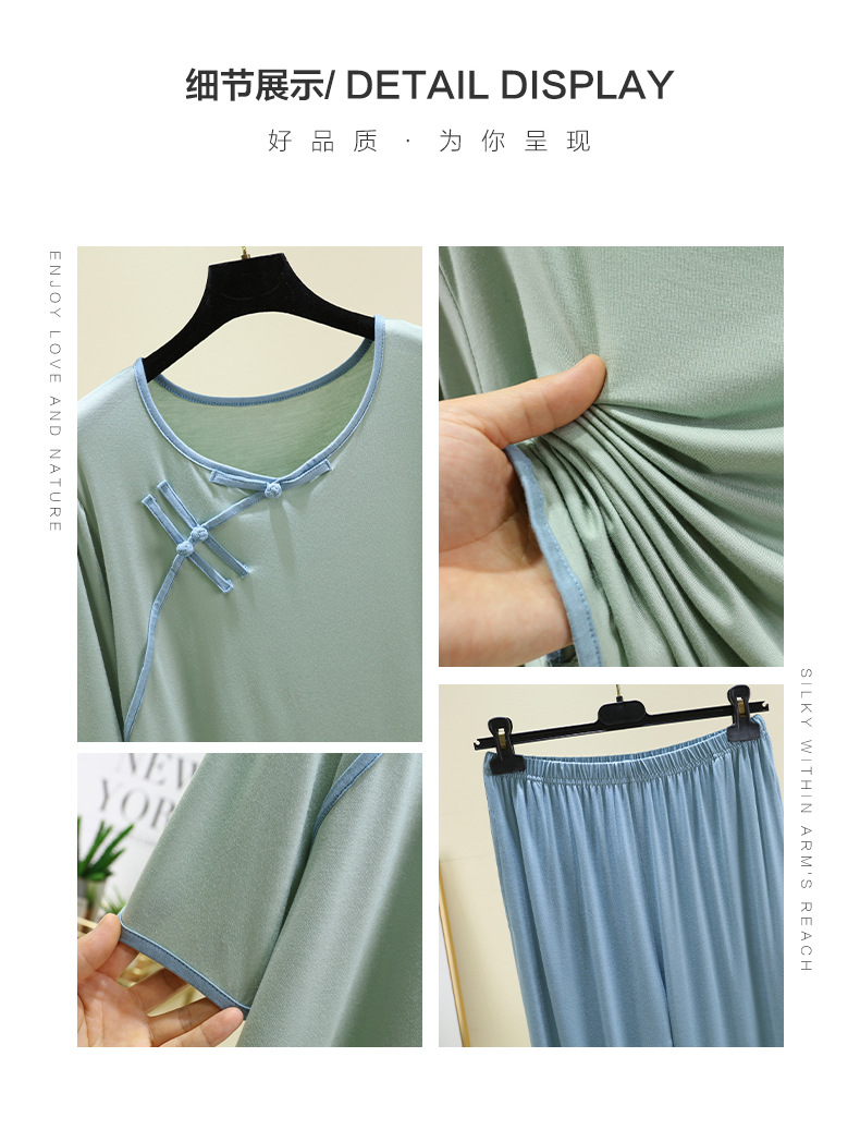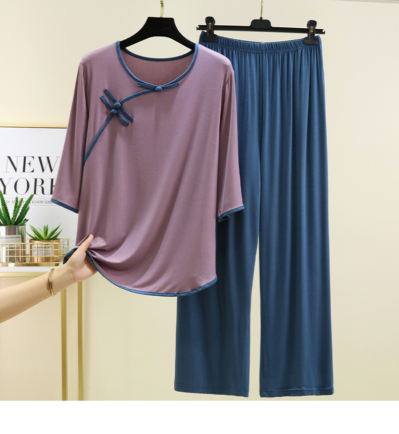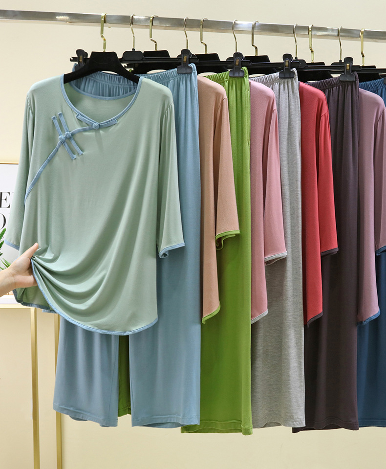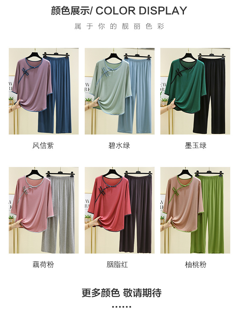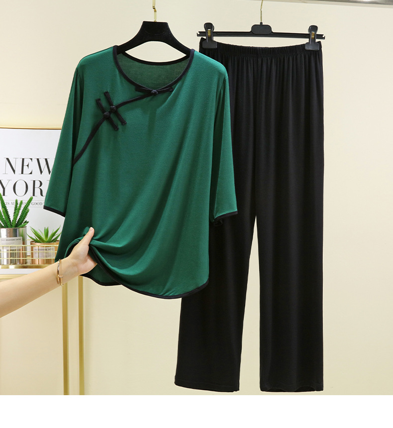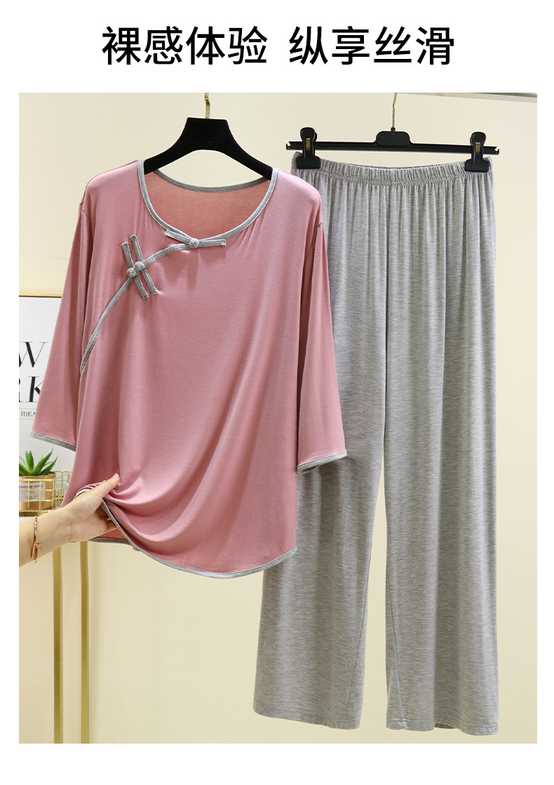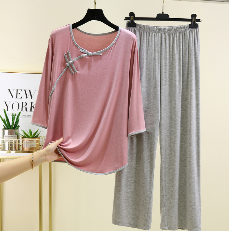 새로운 중국 스타일 국가 스타일 잠옷 세트 여성의 봄과 여름 모달 홈 의류 외부 착용 대형 느슨한 투피스 얇은 세트