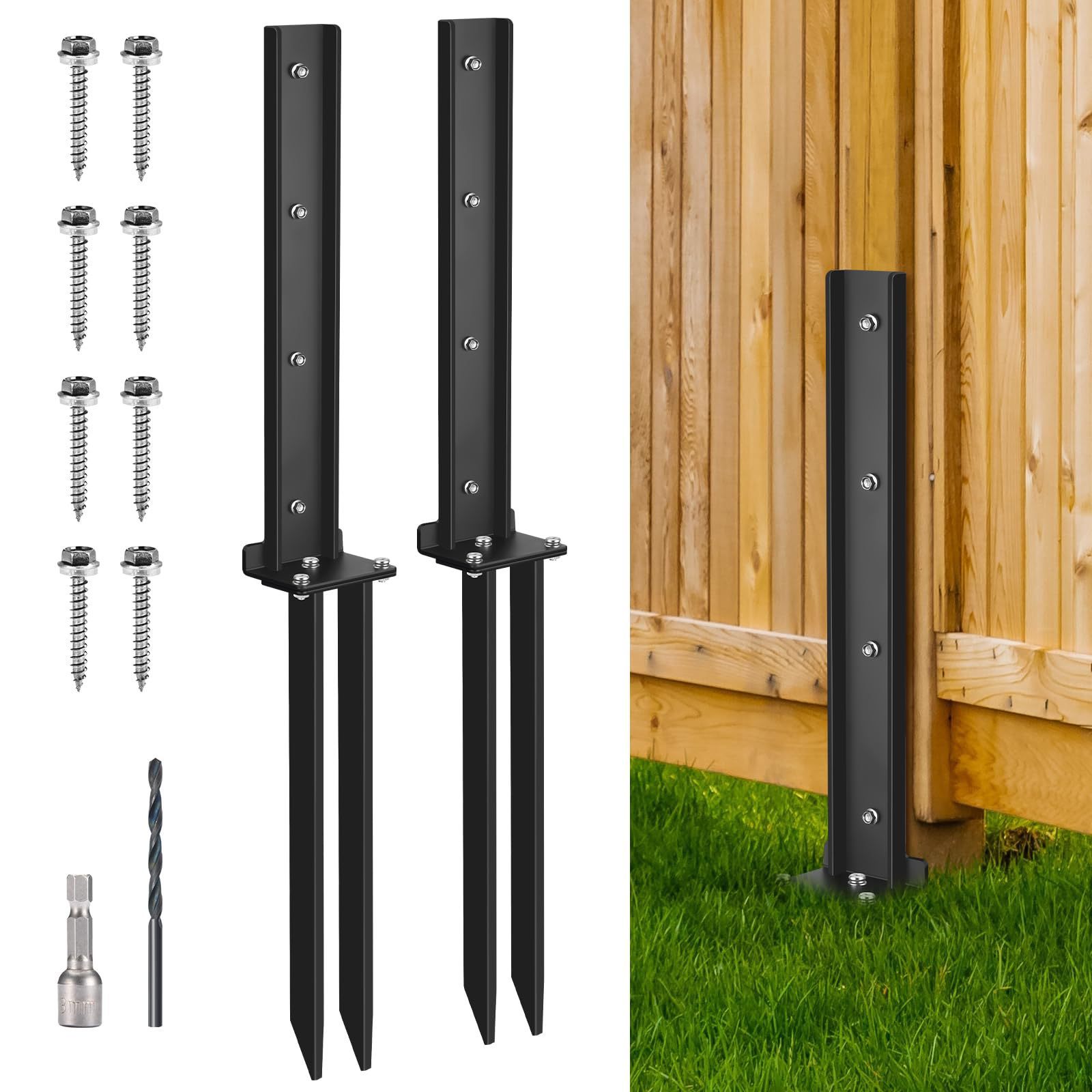 2 조각 울타리 포스트 앵커 키트, 무거운 강철 울타리 포스트 수리 더미, 울타리 포스트 앵커 그라운드 네일, 블랙