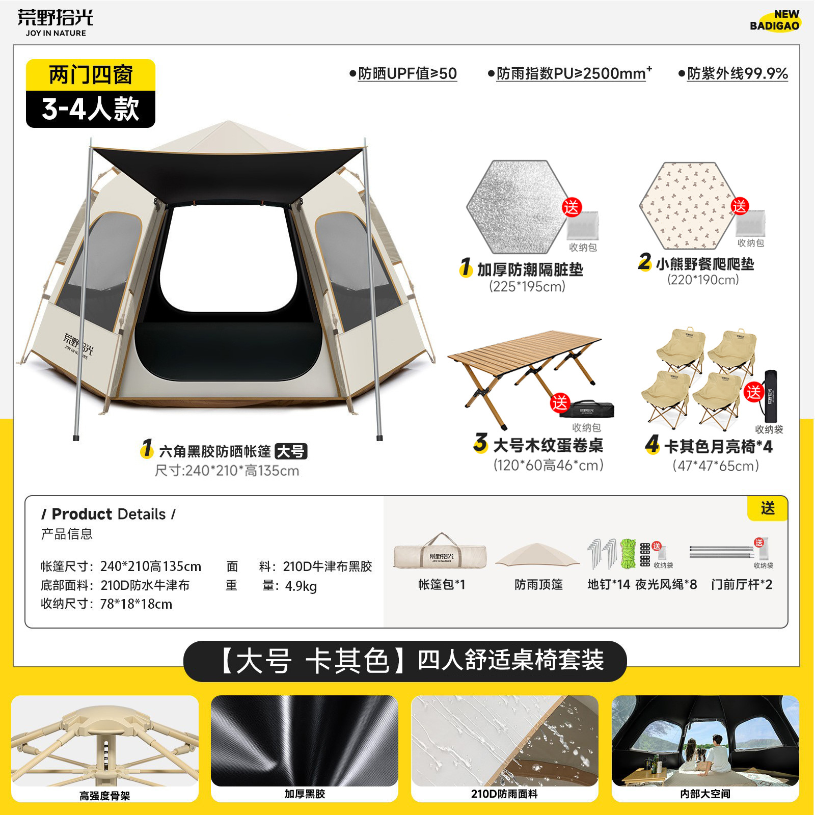 • 3~4인 살구쌀 흰색 [비닐] 텐트 - 4인 편안한 테이블과 의자 패키지
