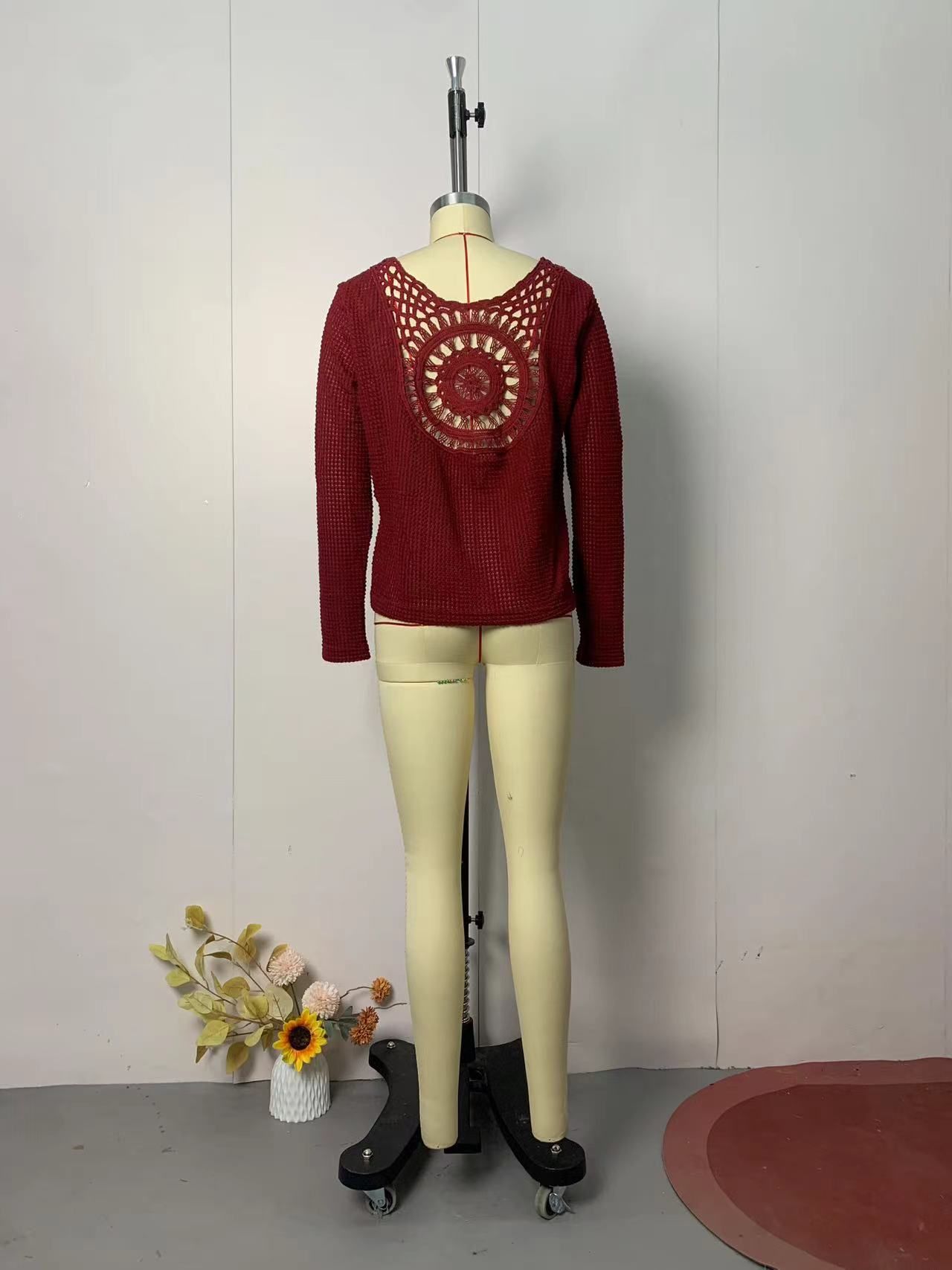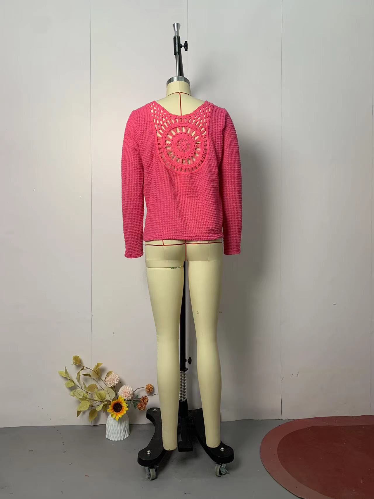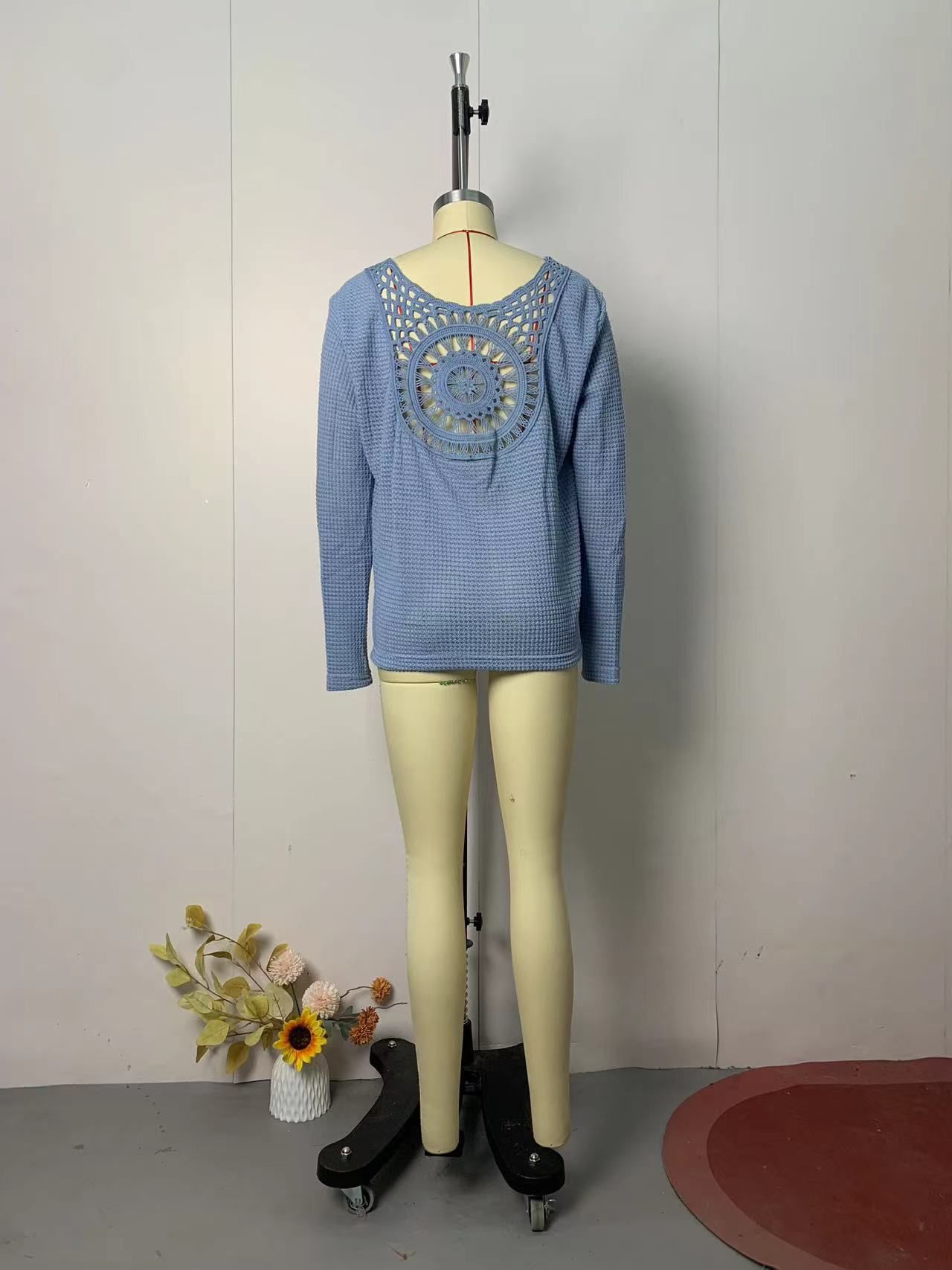 2024 년 여름 새로운 유럽과 미국의 아마존 국경 단색 패션 중공 V-Neck 섹시한 백리스 니트 블라우스스토어 가기