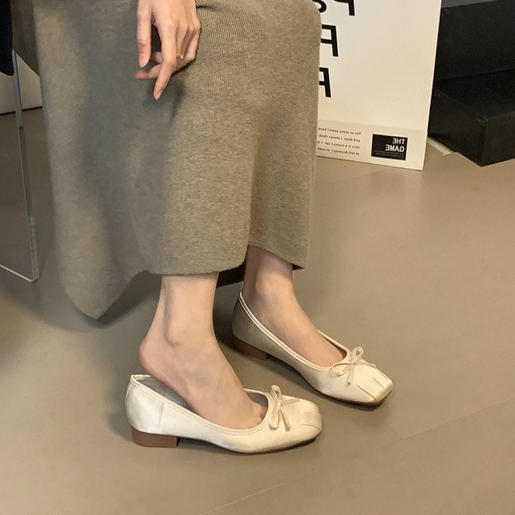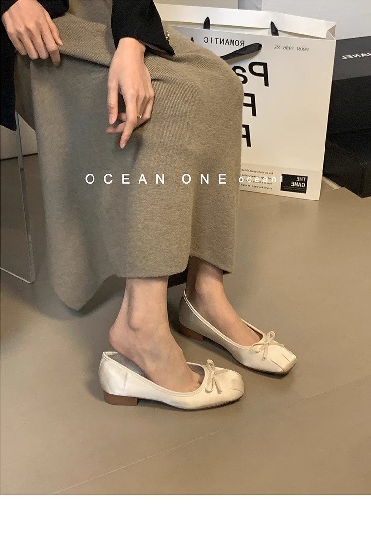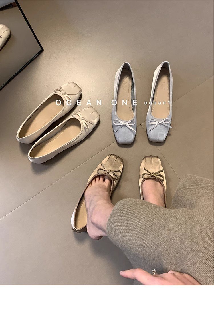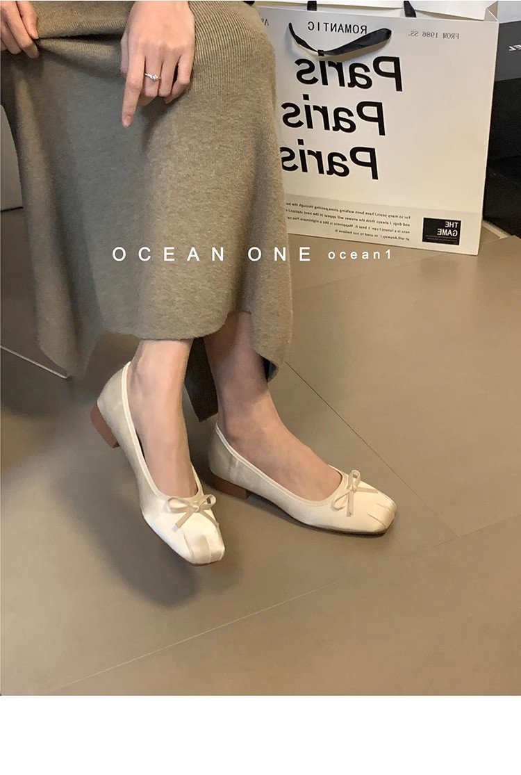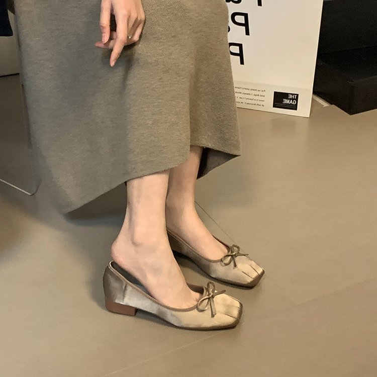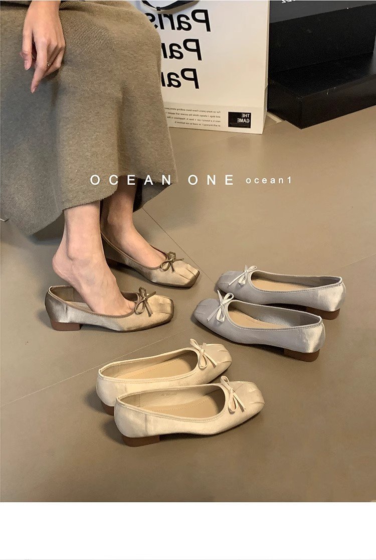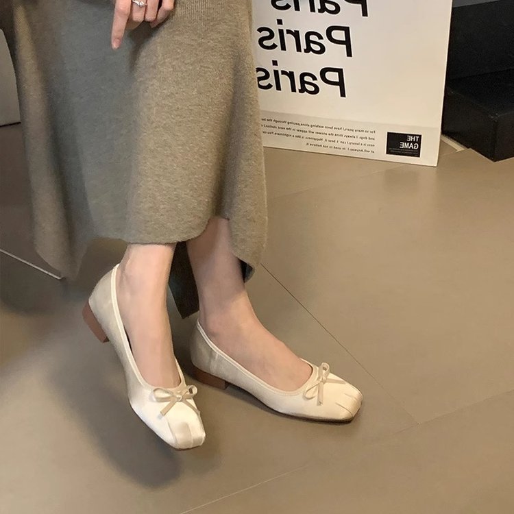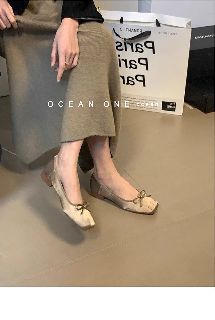 Yan Ju ~ Gentle Satin Square Toe Ballet Shoes 2024 봄 새로운 틈새 활 두꺼운 힐 얕은 입 펌프