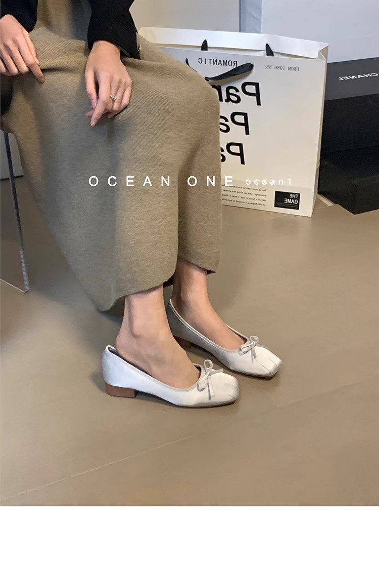 Yan Ju ~ Gentle Satin Square Toe Ballet Shoes 2024 봄 새로운 틈새 활 두꺼운 힐 얕은 입 펌프스토어 가기