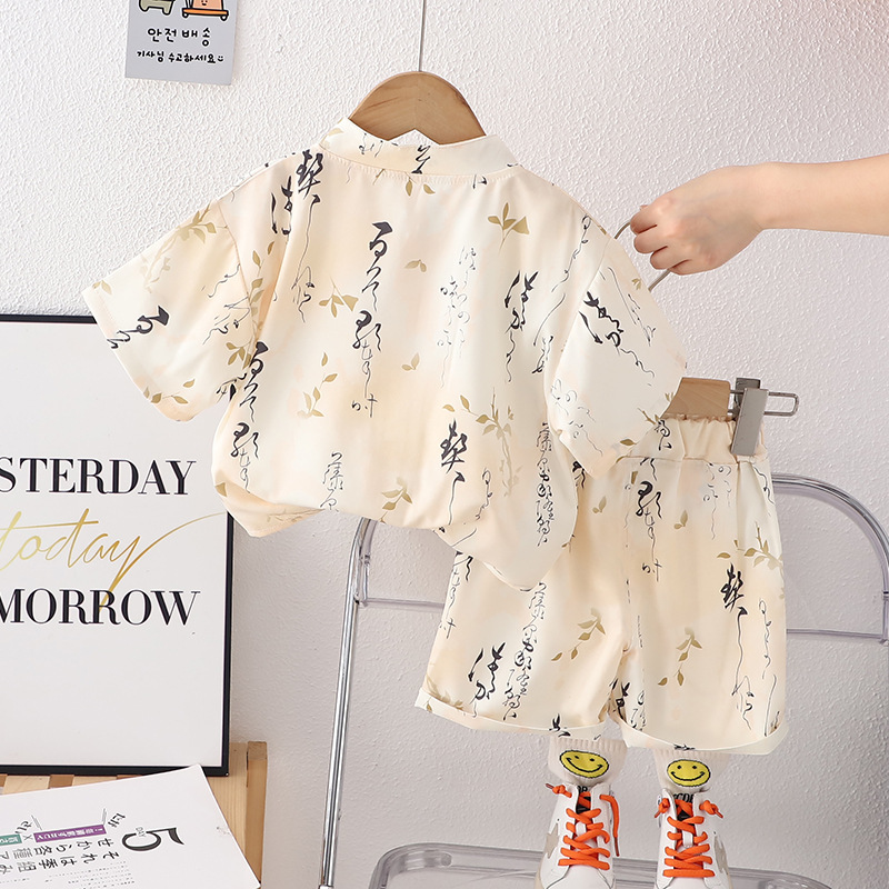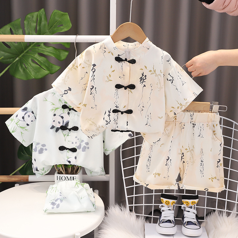 무료 배송 Yikids 여름 새 소년 중국 스타일 셔츠 짧은 소매 세트 2 조각 캐주얼 반바지 소년 아기