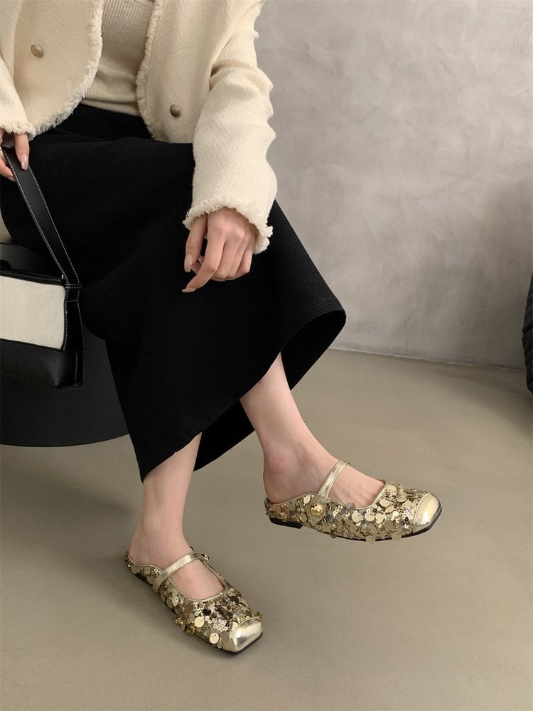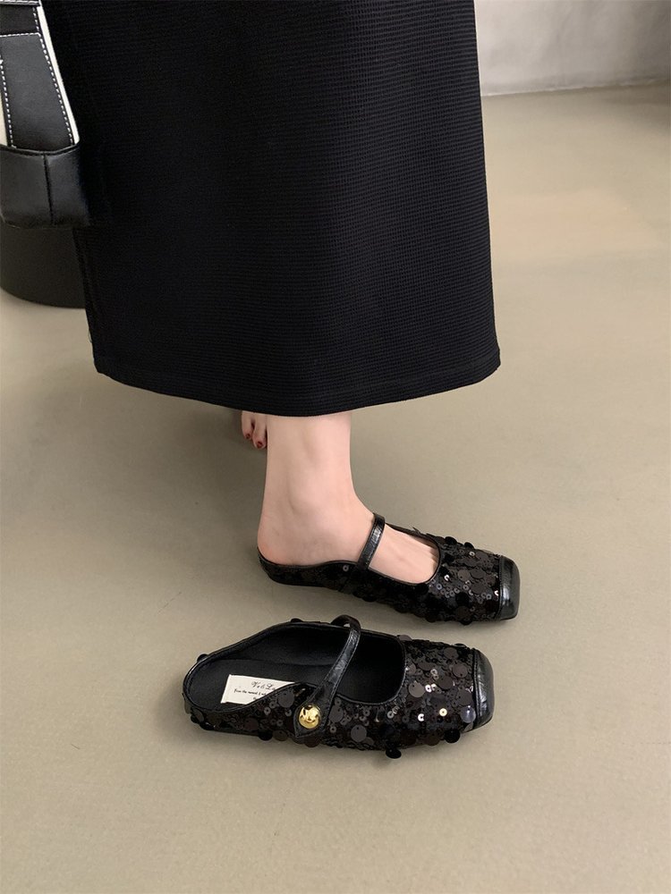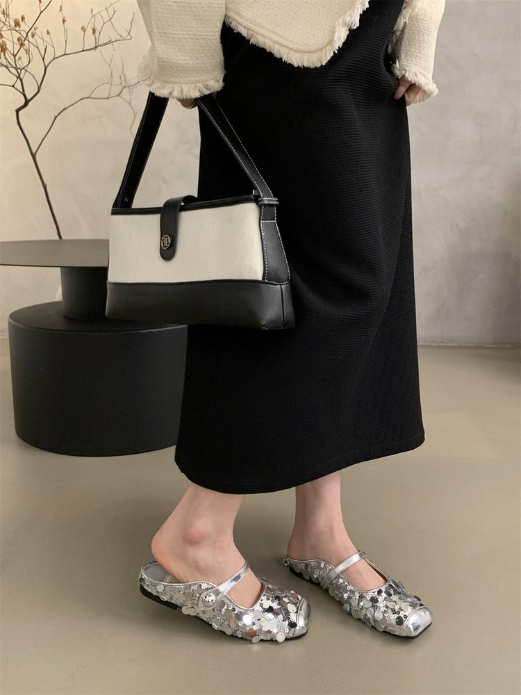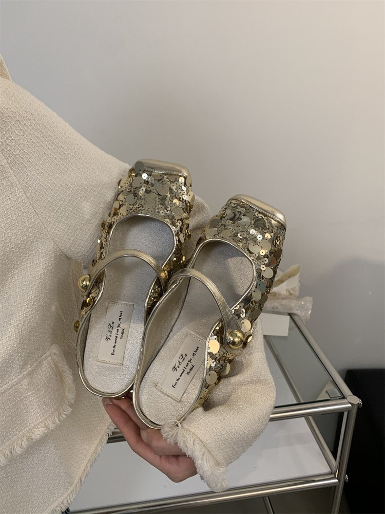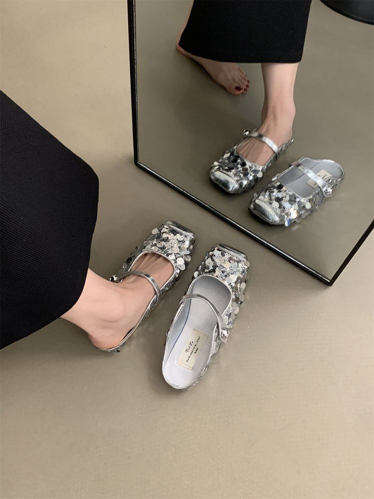 실버 Sequin Baotou 하프 슬리퍼 여성용 여름 아우터 부드러운 우아한 페어리 스타일 저녁 부드러운 플랫 뮬러 샌들
