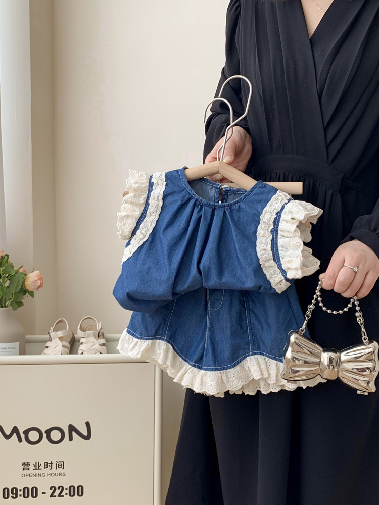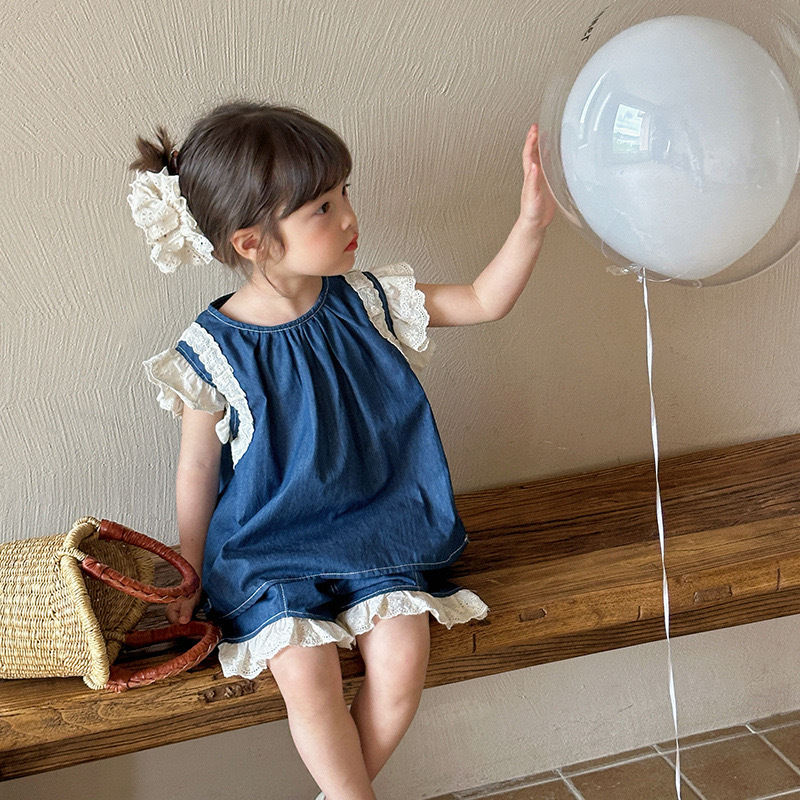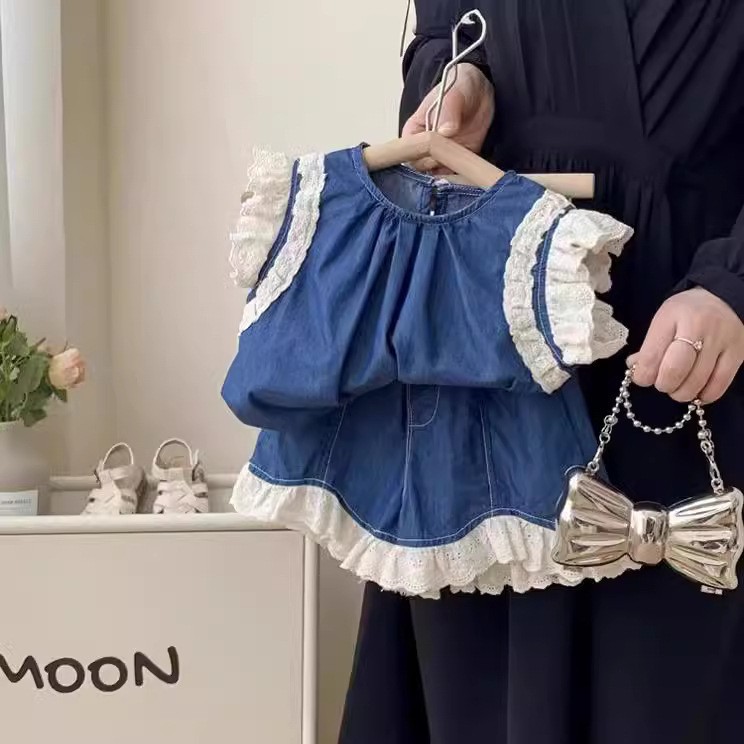 소녀의 데님 세트 얇은 여름 2024 새로운 어린이 유행 서양식 아기 소녀의 여름 반바지 투피스 세트스토어 가기