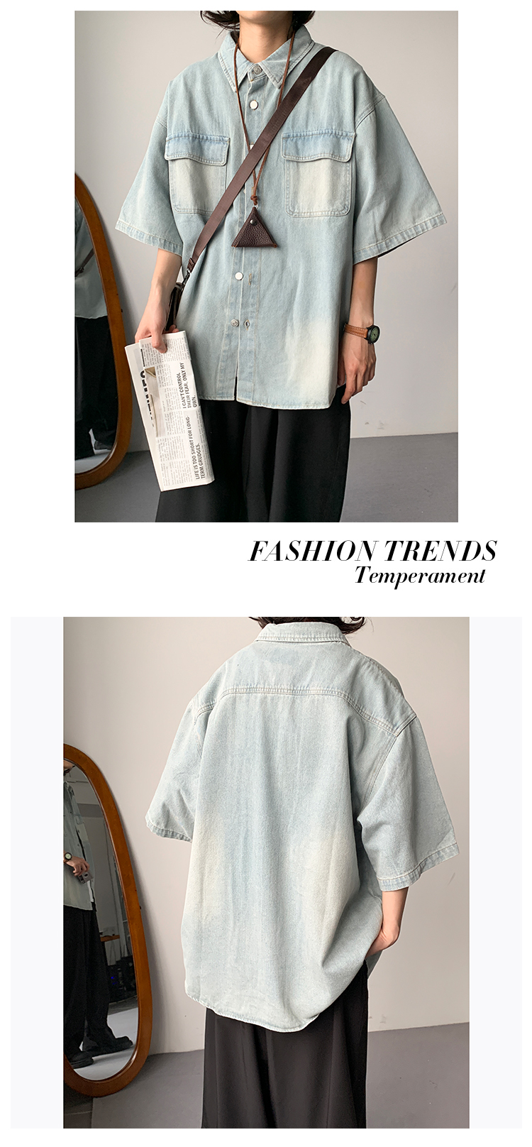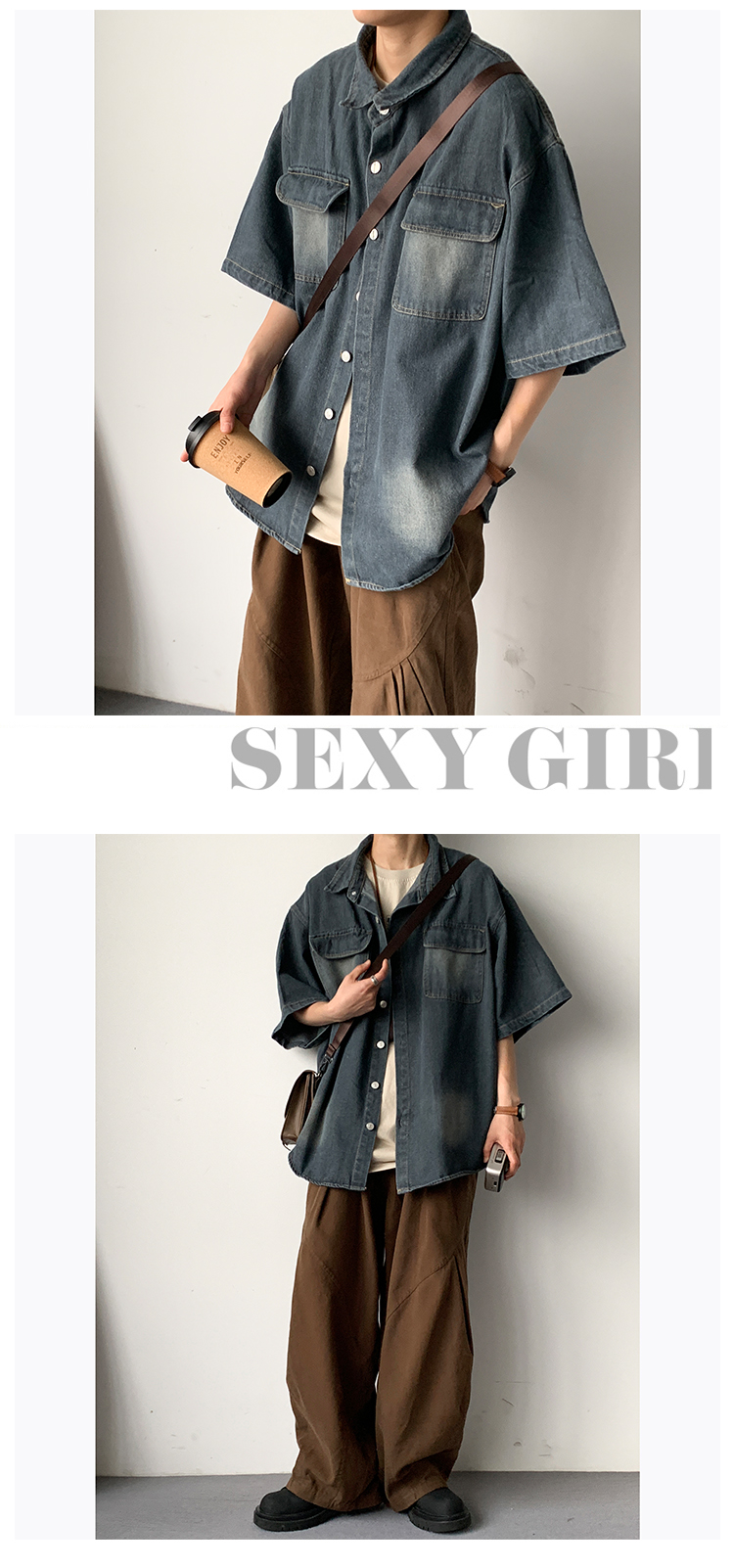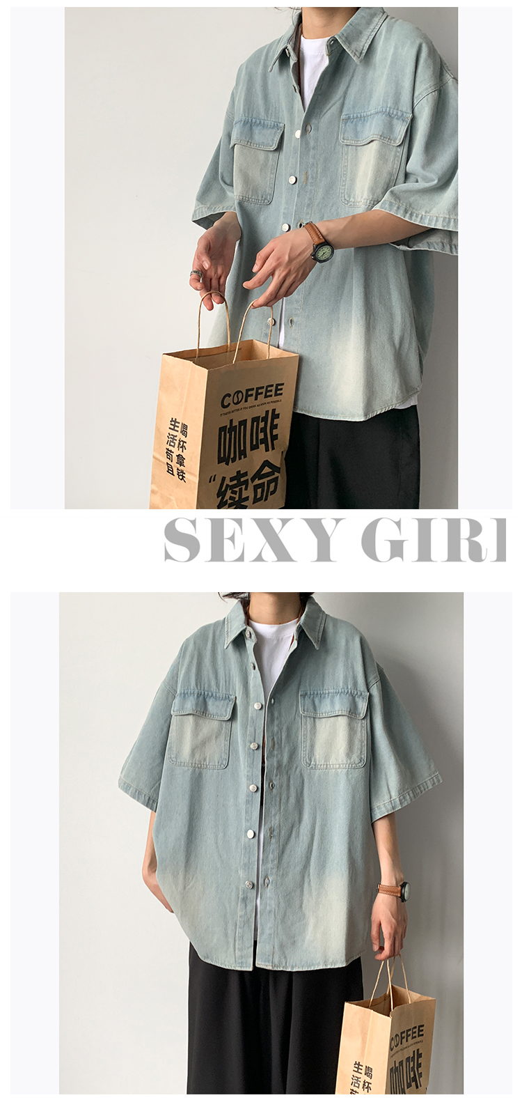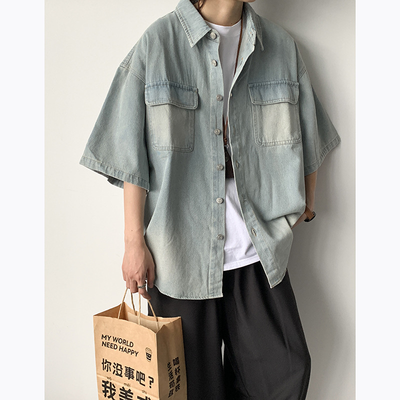 남학생과 여자를위한 여름 일본식 씻은 오래된 반팔 데님 셔츠 복고풍 유행 두꺼운 잘 생긴 작업복 셔츠 코트 트렌디스토어 가기