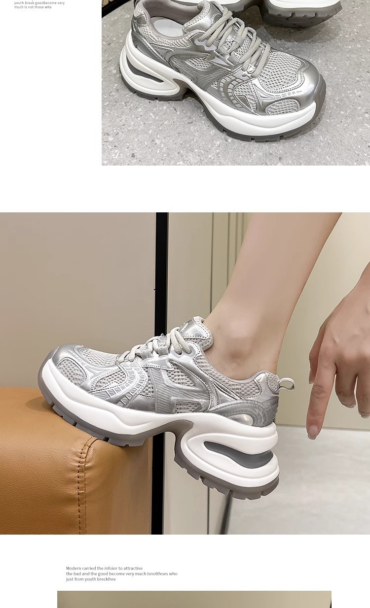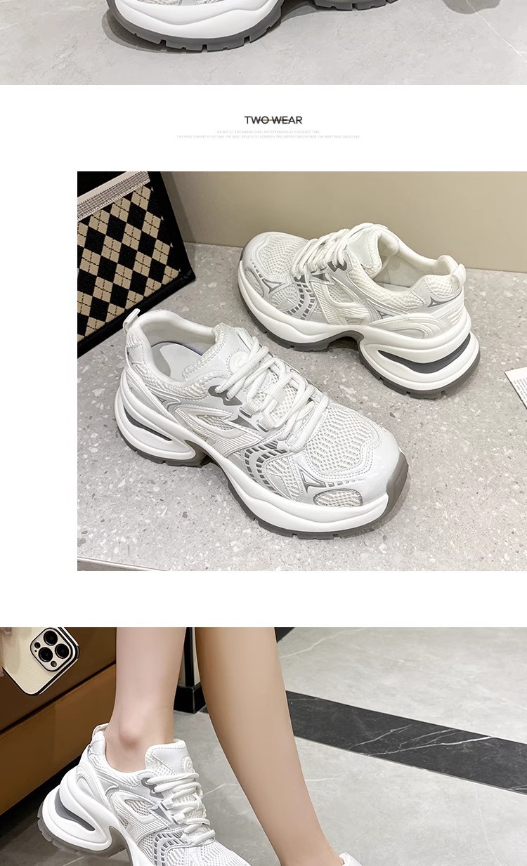 여성을위한 유럽 역 정품 가죽 아빠 신발 봄, 여름 메쉬 통기성 흰색 신발 두꺼운 밑창 캐주얼 스포츠 신발 유행