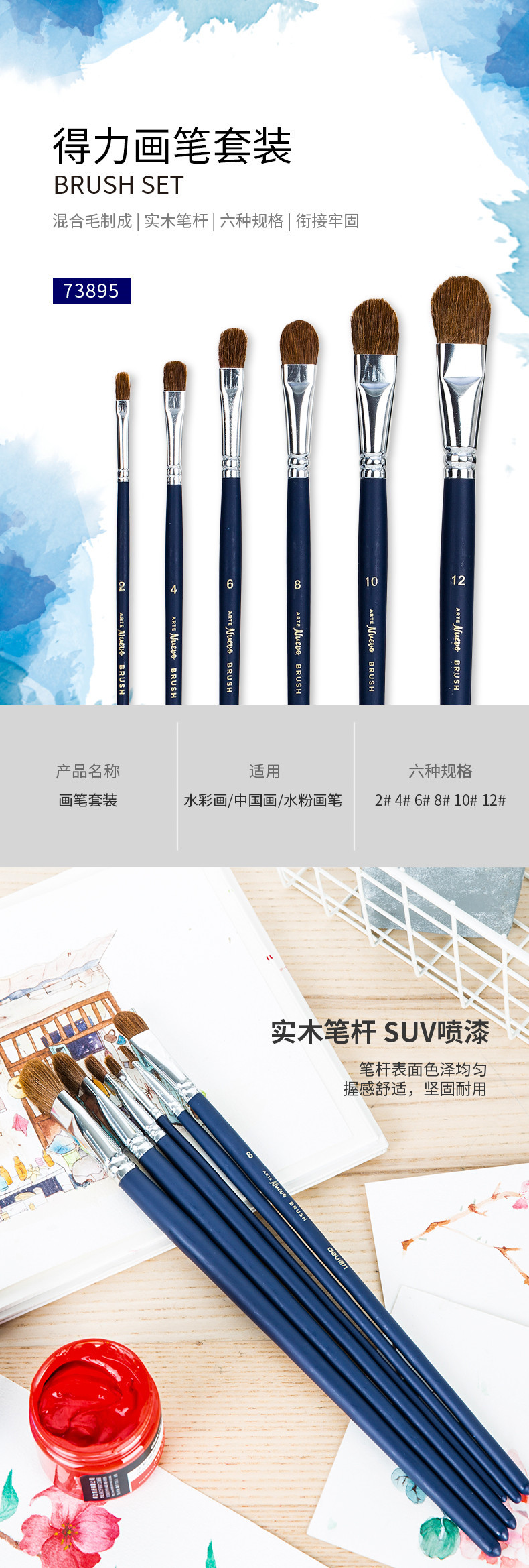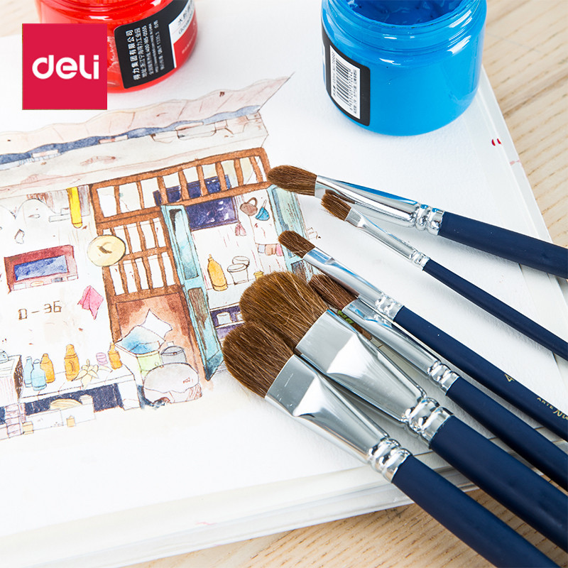 델리 73895 혀 모양의 혼합 양모 브러시 6 팩 학생 손으로 그린 그림 구 아슈 아크릴 유화 브러시 도매스토어 가기