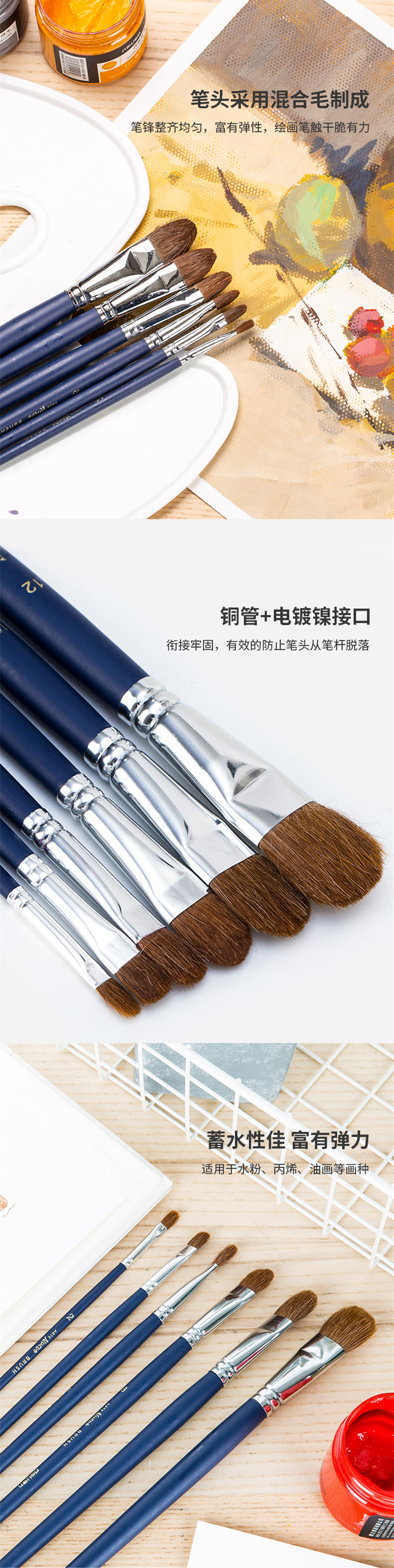 델리 73895 혀 모양의 혼합 양모 브러시 6 팩 학생 손으로 그린 그림 구 아슈 아크릴 유화 브러시 도매