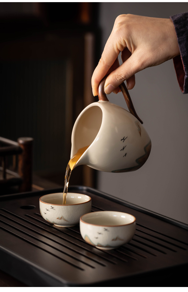 • Beige Ruyao "Far Mountain" 리프팅 주전자 뚜껑 그릇 6 컵 11 피스 선물 상자