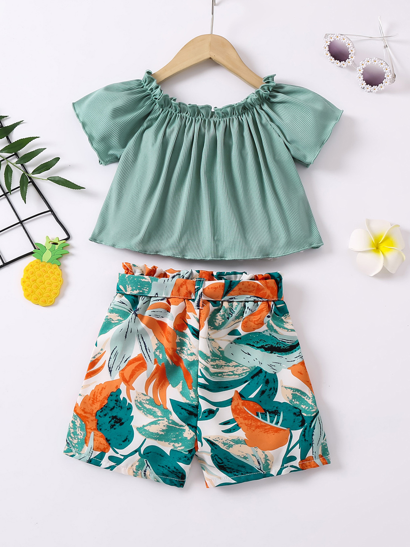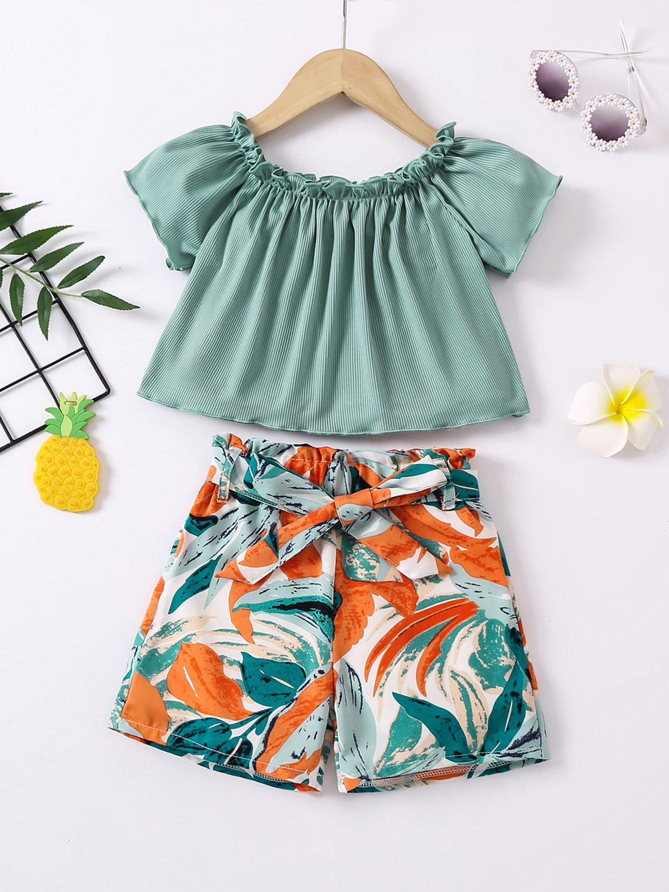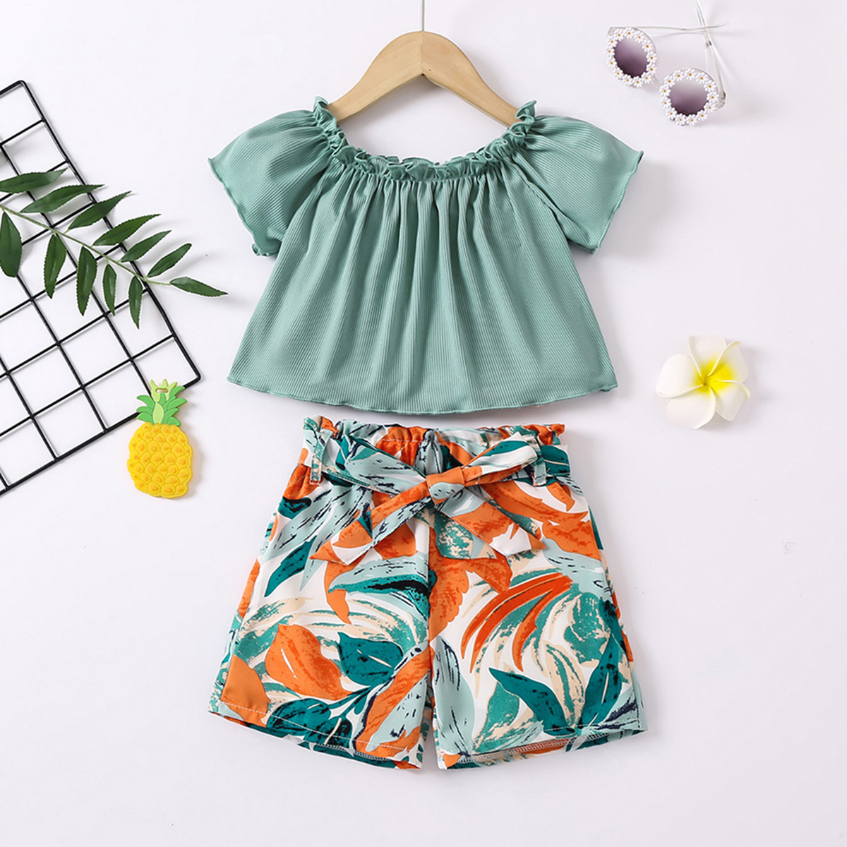 2024 새로운 아동복 소녀, 벨트 3 피스 국경 도매로 오프 숄더 재킷 쉬폰 반바지