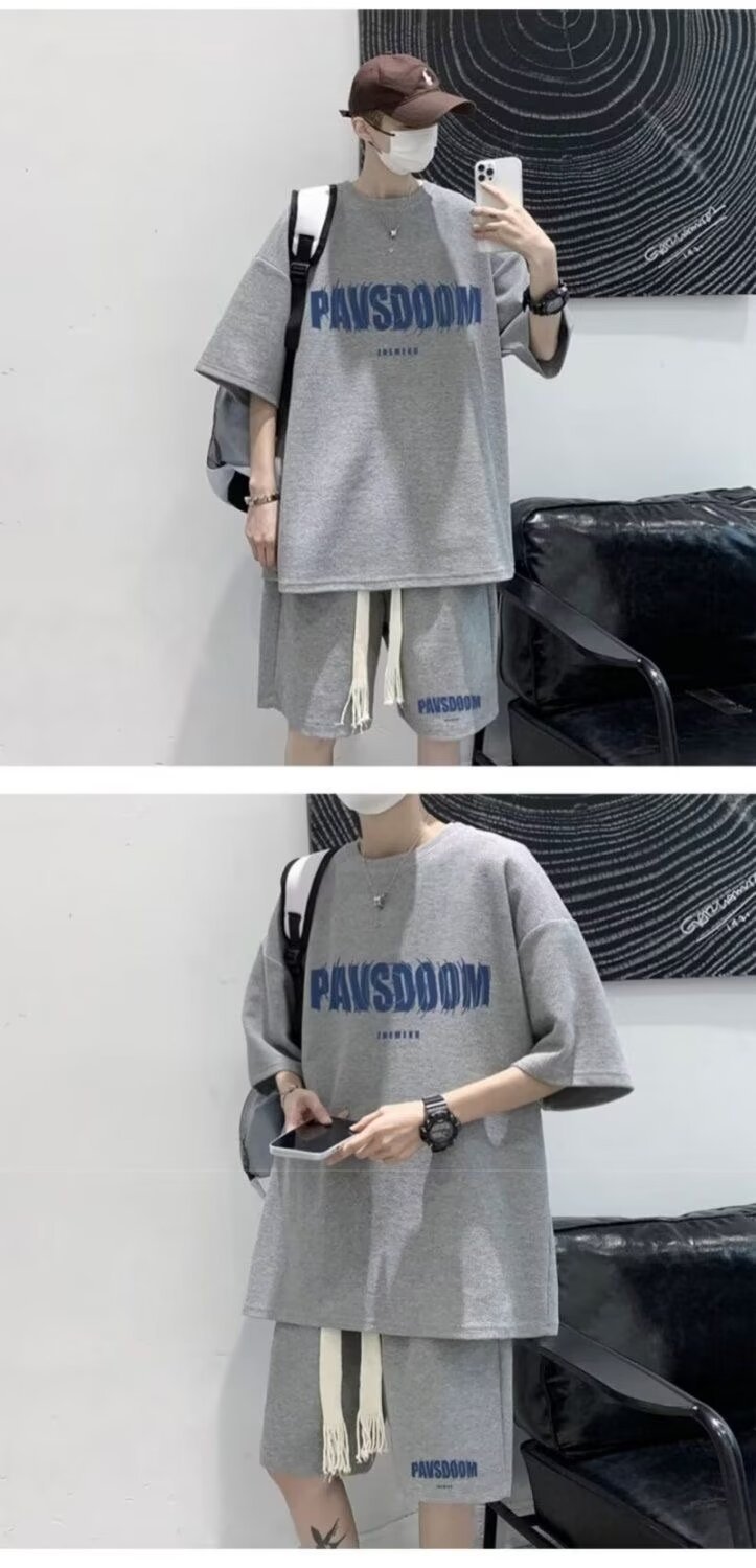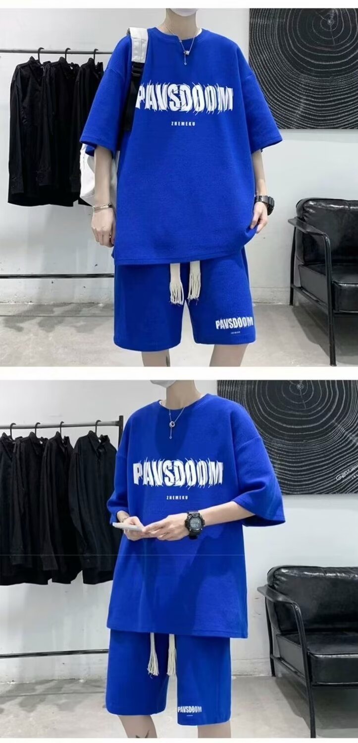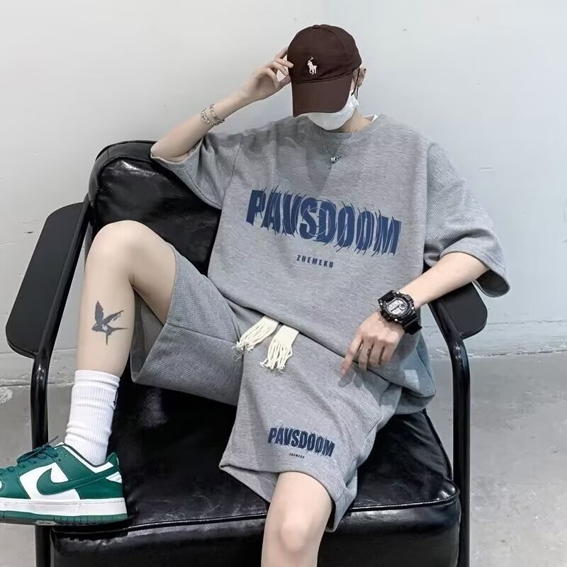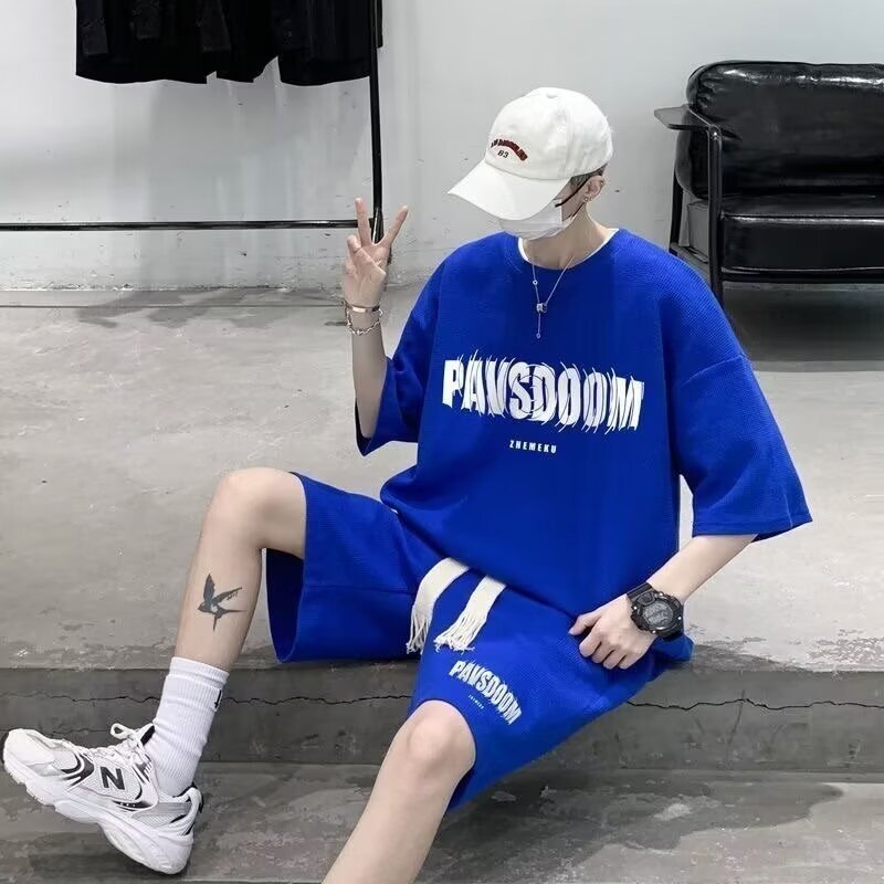 힙합 와플 캐주얼 스포츠 세트 남자 여름 아메리칸 스타일 레트로 트렌디 브랜드 Ins 2 피스 반팔 티셔츠스토어 가기