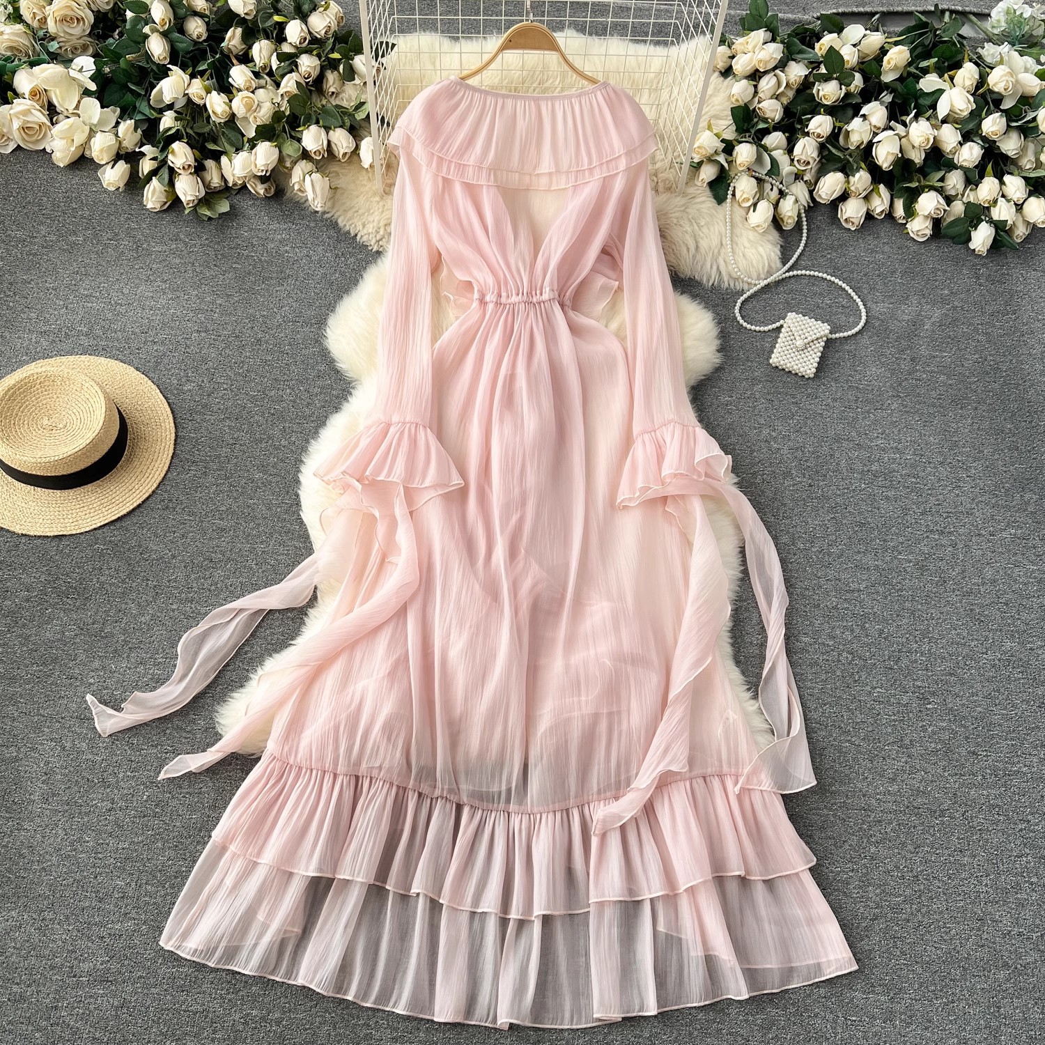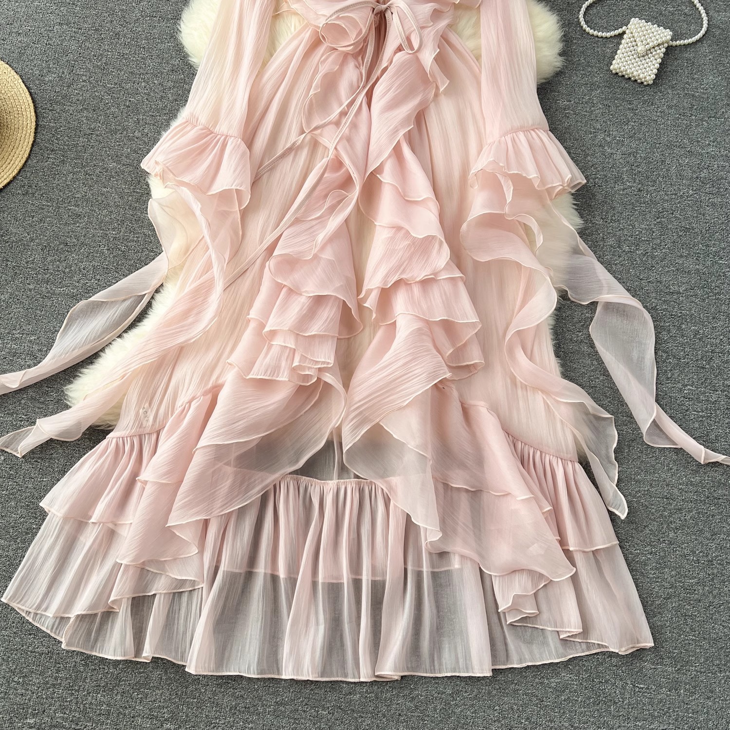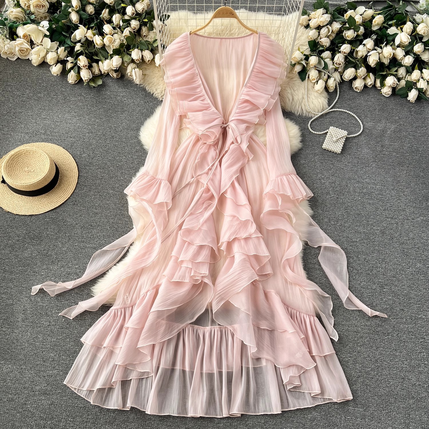 국경 간 휴일 2024 새로운 폭발 봄 하이 엔드 센스 중공업 러플 슬림 핏 긴 쉬폰 셔츠 트렌디
