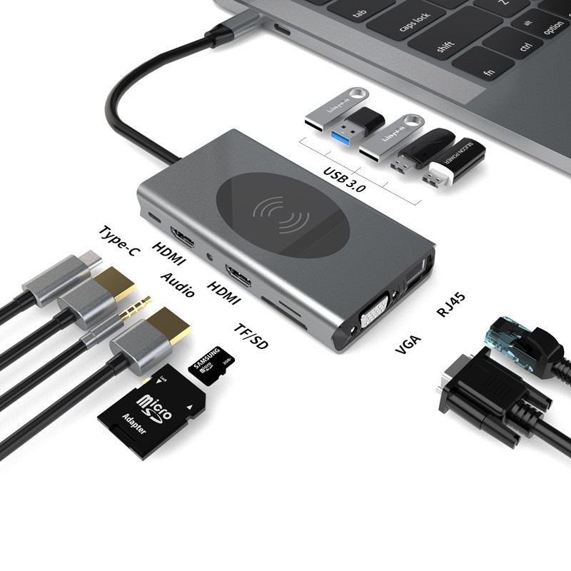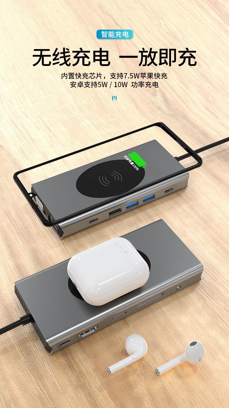 13-in-1 Type c 도킹 스테이션 USB 허브 15W 휴대폰 무선 충전 RJ45 100M 확장 스테이션