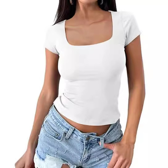 국경 유럽과 미국의 아마존 핫 소녀 옷 여성 반팔 여름 배꼽 노출 티셔츠 섹시 슬리밍 풀오버 탑스토어 가기