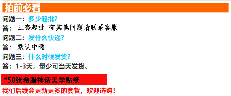 发货时间:每天下午4点统一发货,超过下午4点下的订单第二天发货。定制贴纸的发货时间请与客服人员沟通。