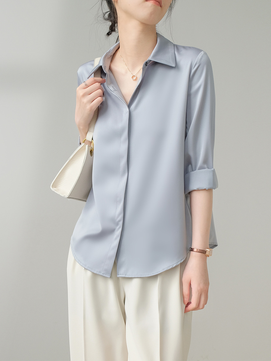 가벼운 성숙한 스타일 새틴 화이트 셔츠 여성용 긴팔 봄과 가을 새로운 한국식 올 매치 주름 방지 통근 OL 셔츠