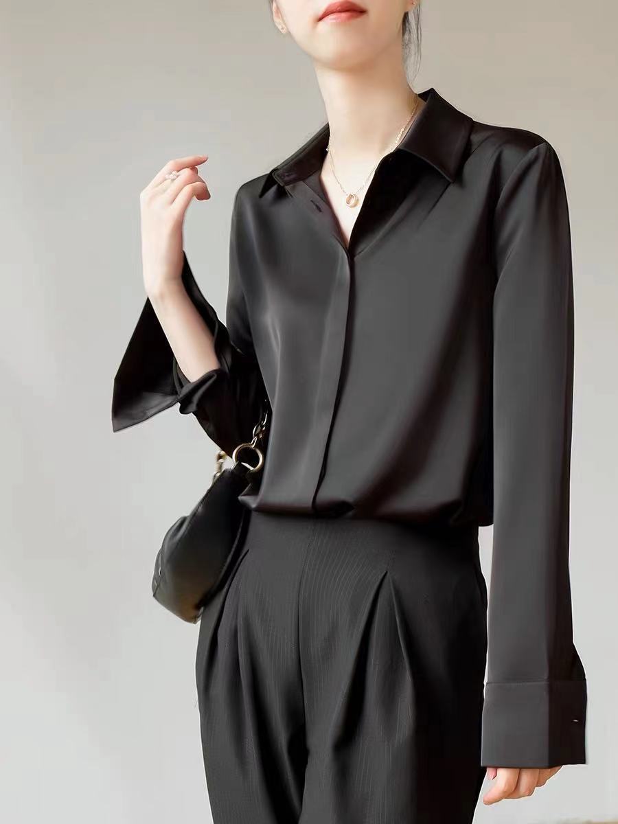 轻熟风缎面白色衬衫女长袖春秋季新款韩版百搭抗皱垂感通勤ol衬衣
