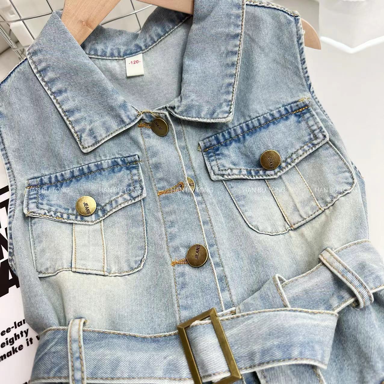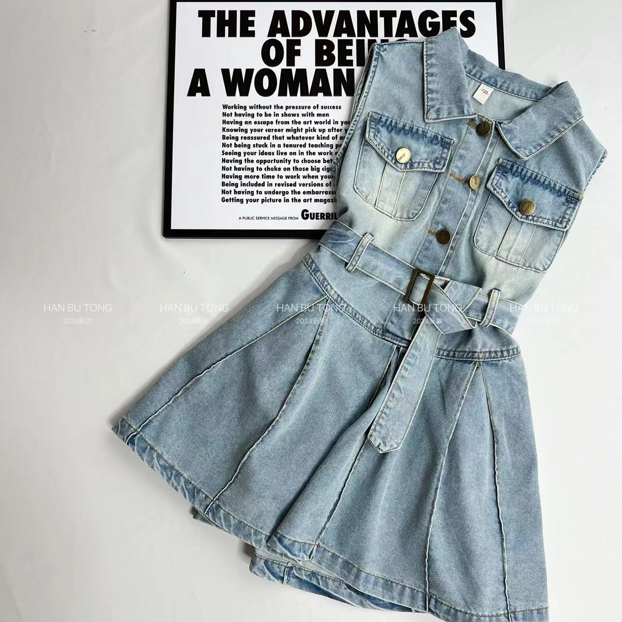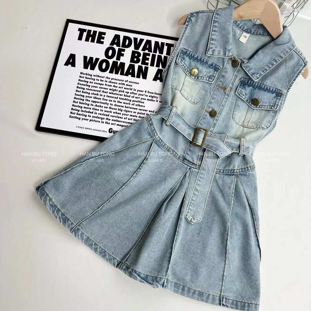 소녀 원피스 2024 년 여름 새로운 어린이 한국식 민소매 조끼 공주 원피스 서양식 여름 데님 원피스 트렌디