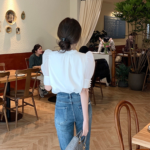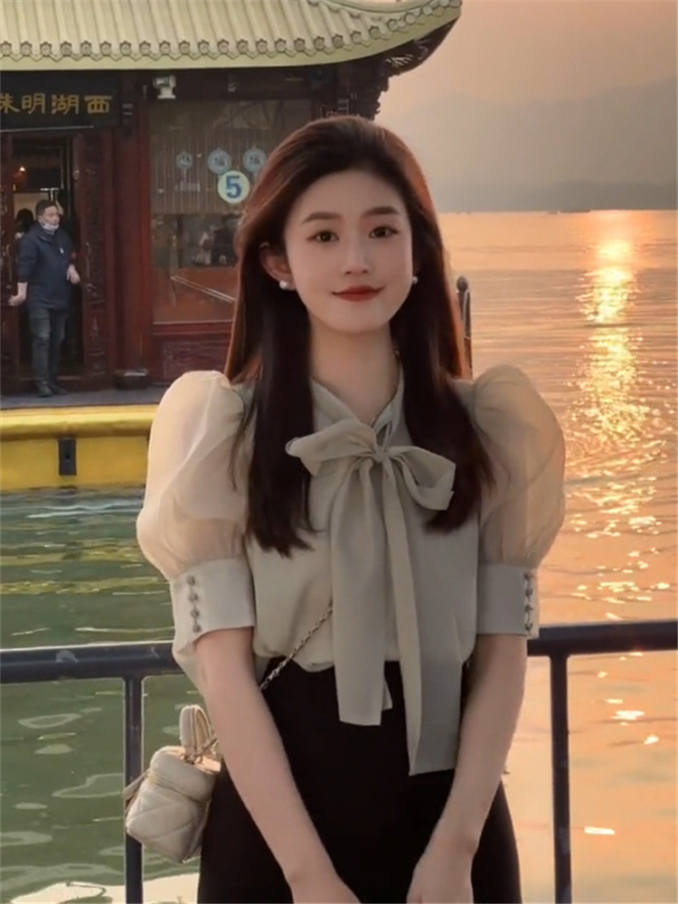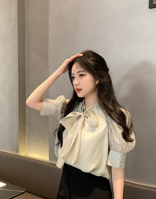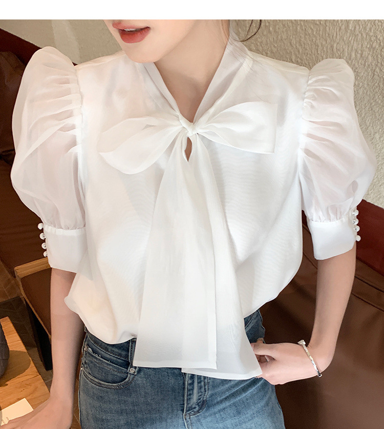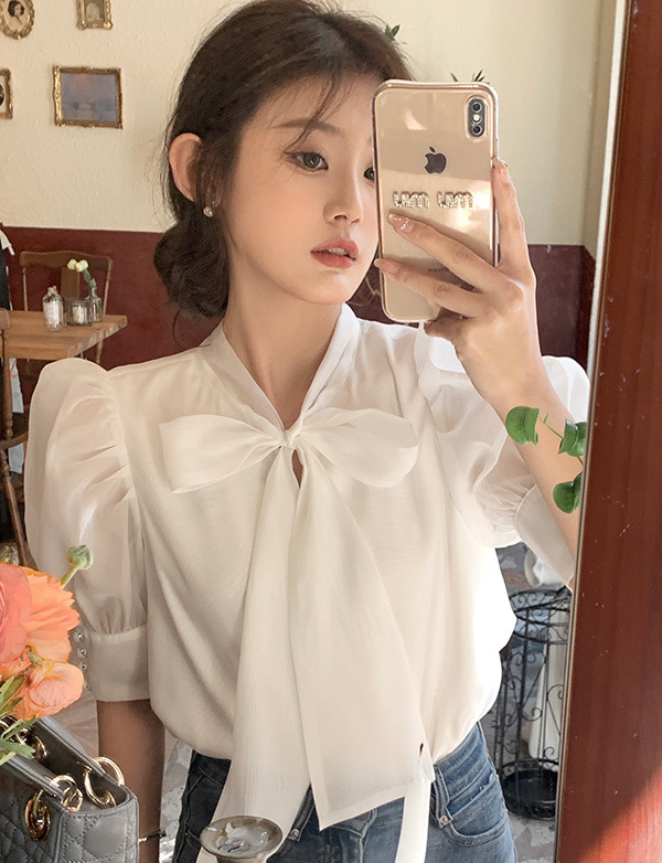 여성용 여름 신상 리본 퍼프 슬리브 탑, 작은 체형을 위한 디자인, 부드러운 기질의 여성용 쉬폰 셔츠, 달콤한 여성용 셔츠스토어 가기