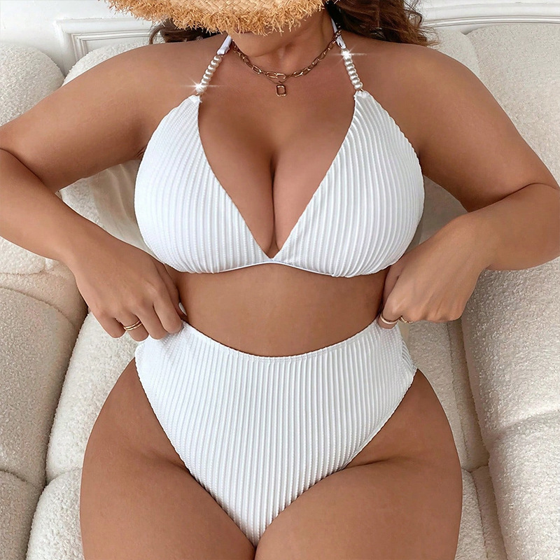 2024 새로운 유럽과 미국의 서스펜더 홀터넥 넥 대형 비치 수영복 여성용 아마존 솔리드 컬러 하이 웨이스트 섹시한 비키니