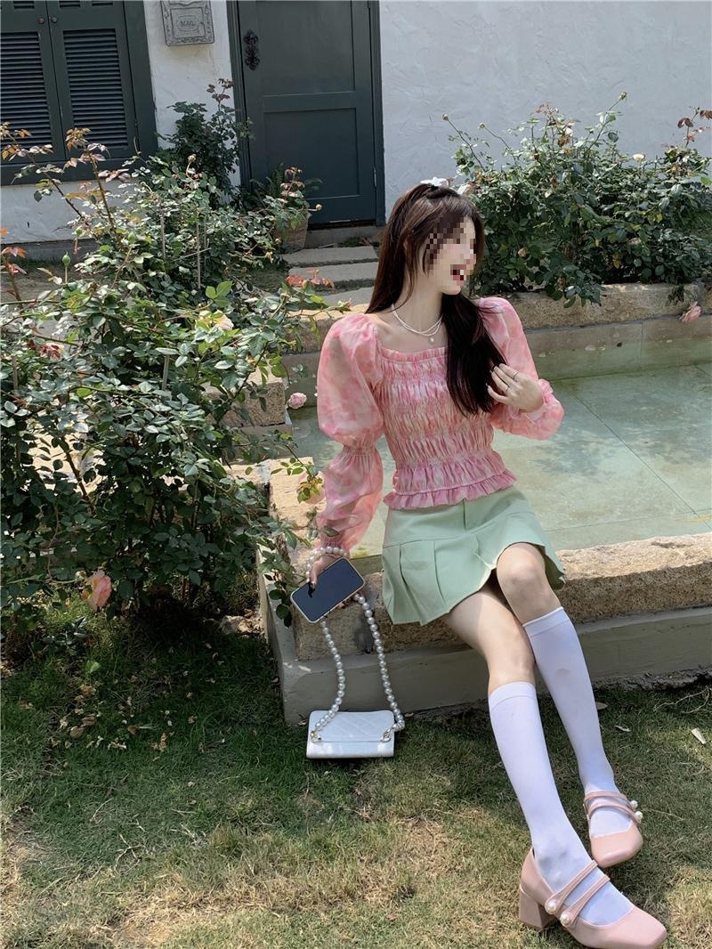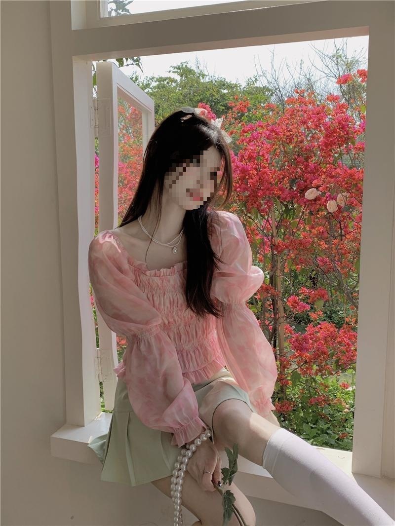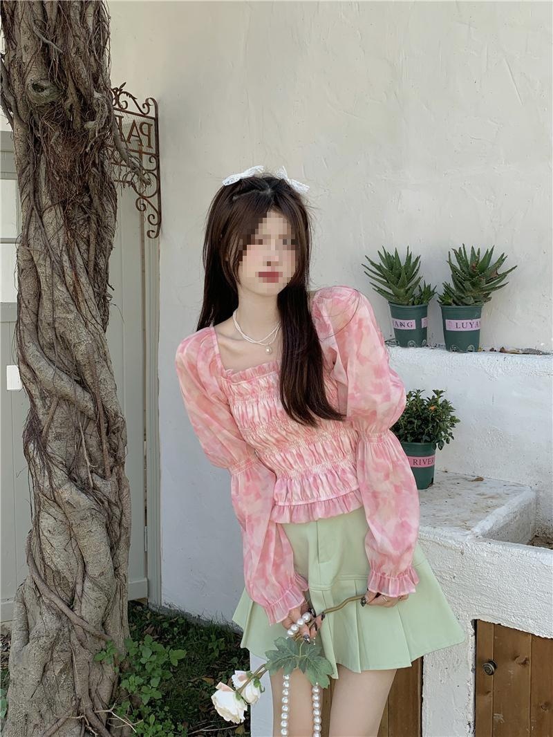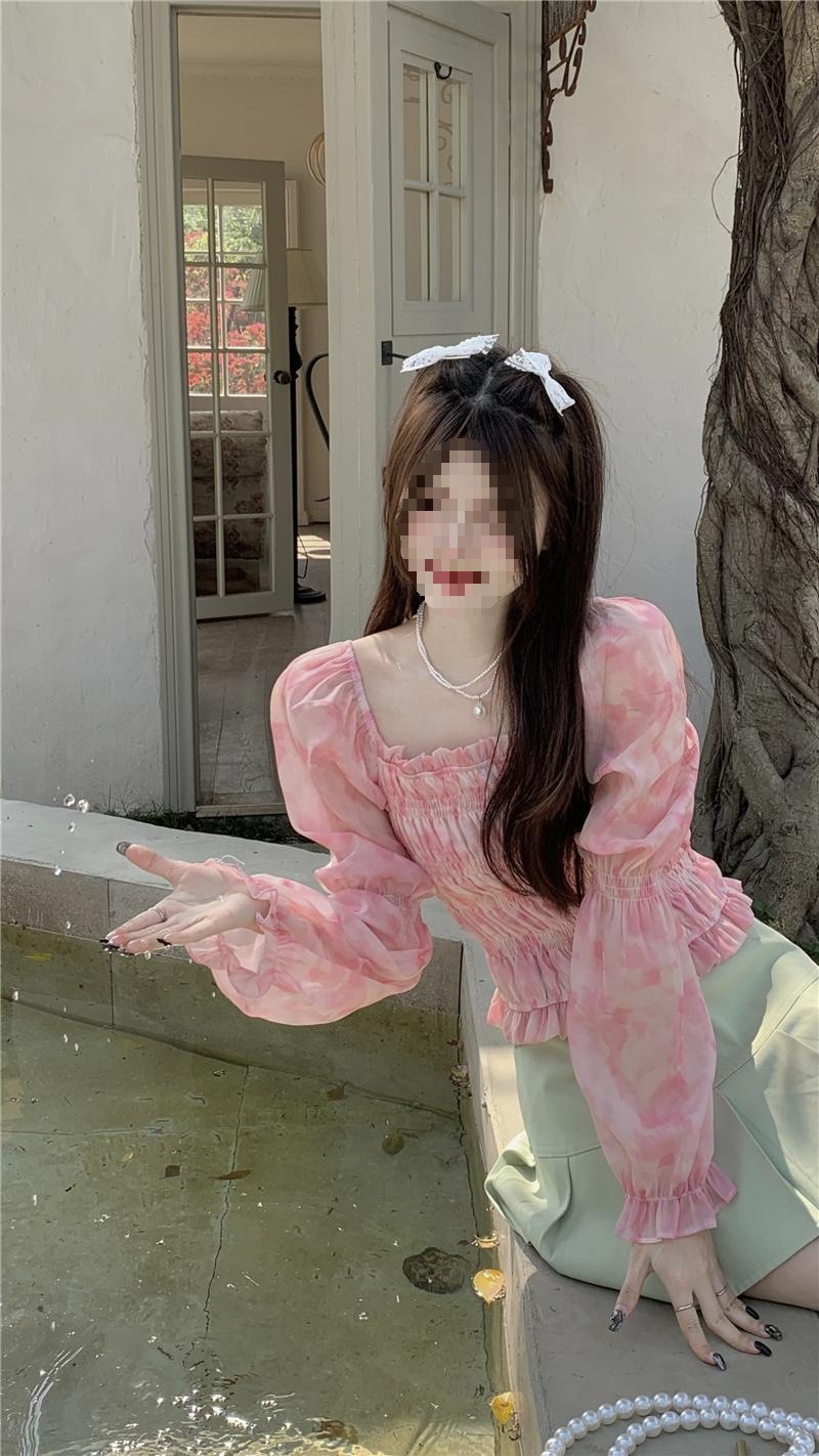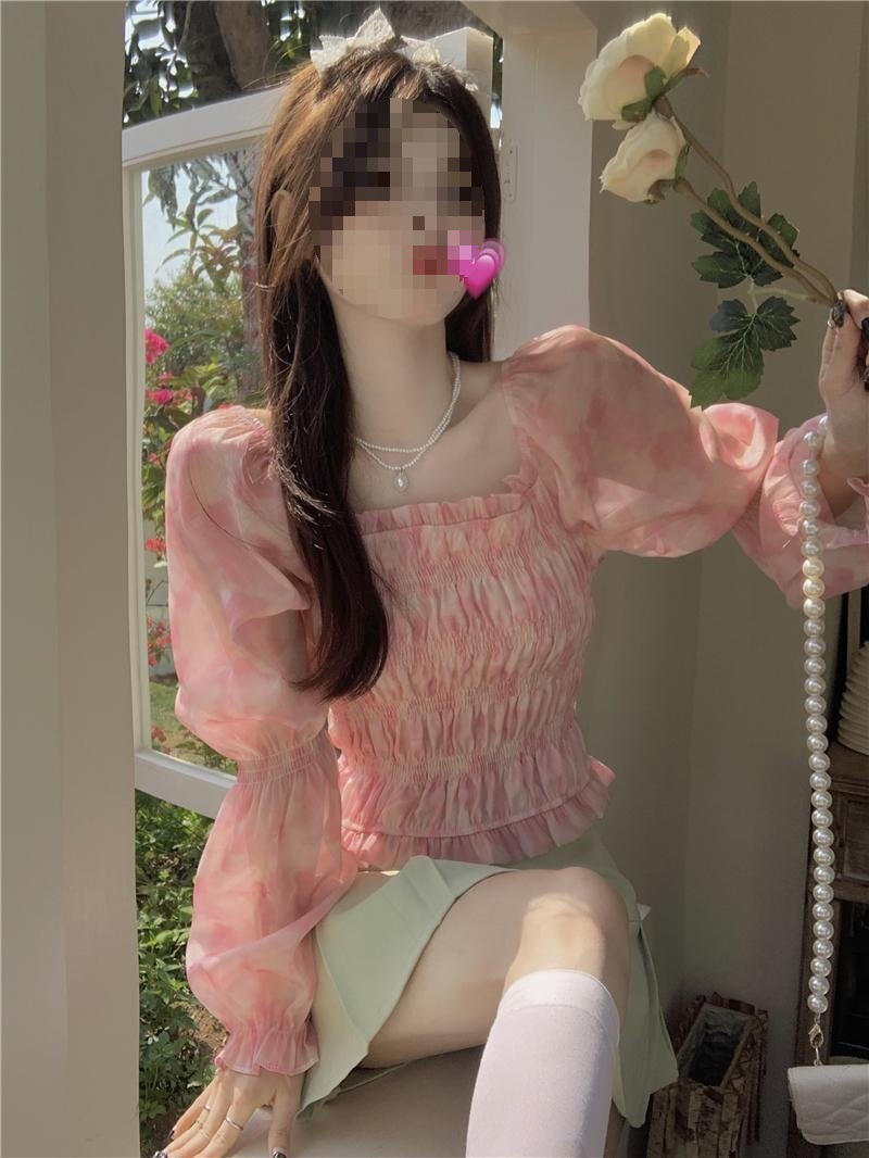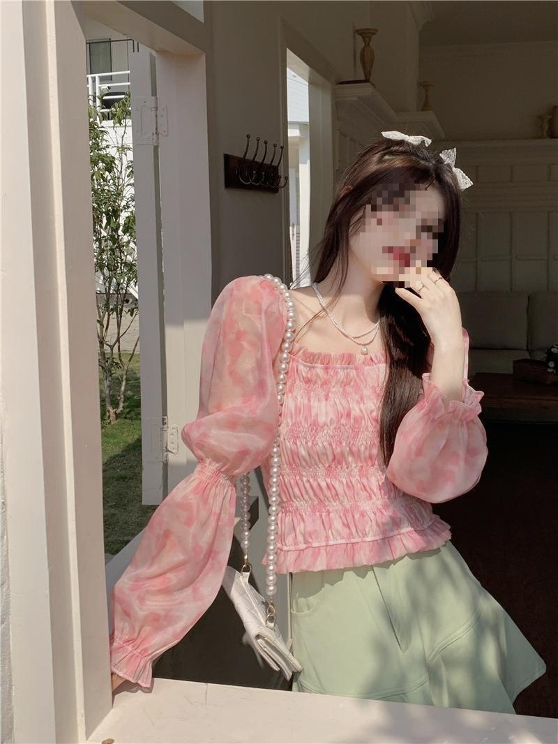 봄과 여름 퍼프 슬리브 틈새 타이트 허리 긴팔 탑 프랑스 스타일 세련된 귀 테두리 스퀘어 칼라 플로랄 시폰 셔츠