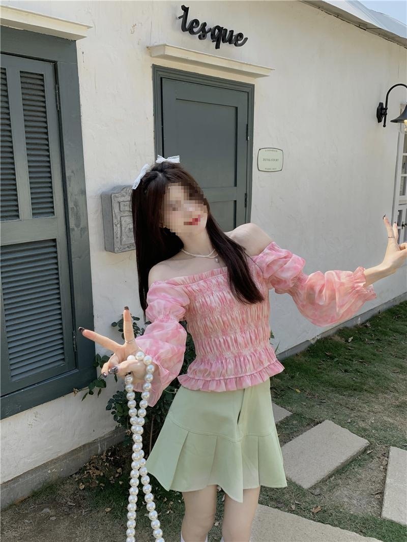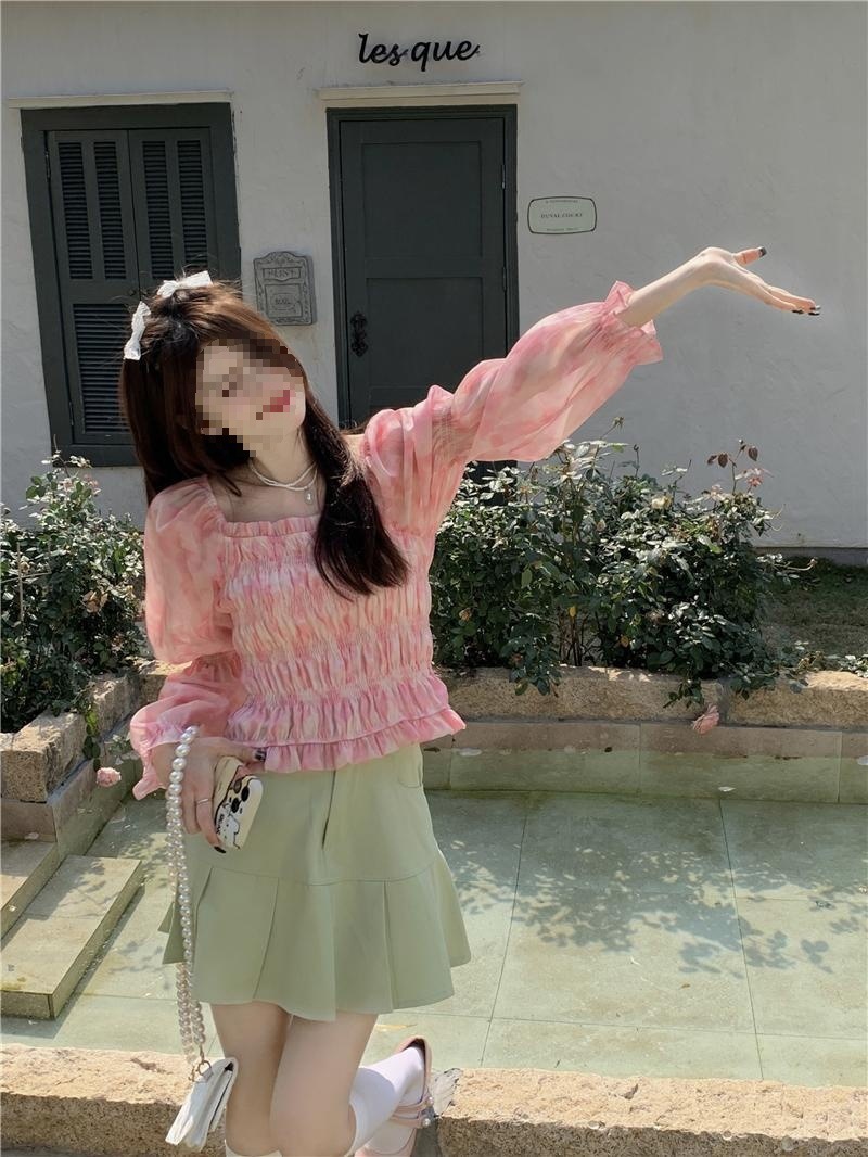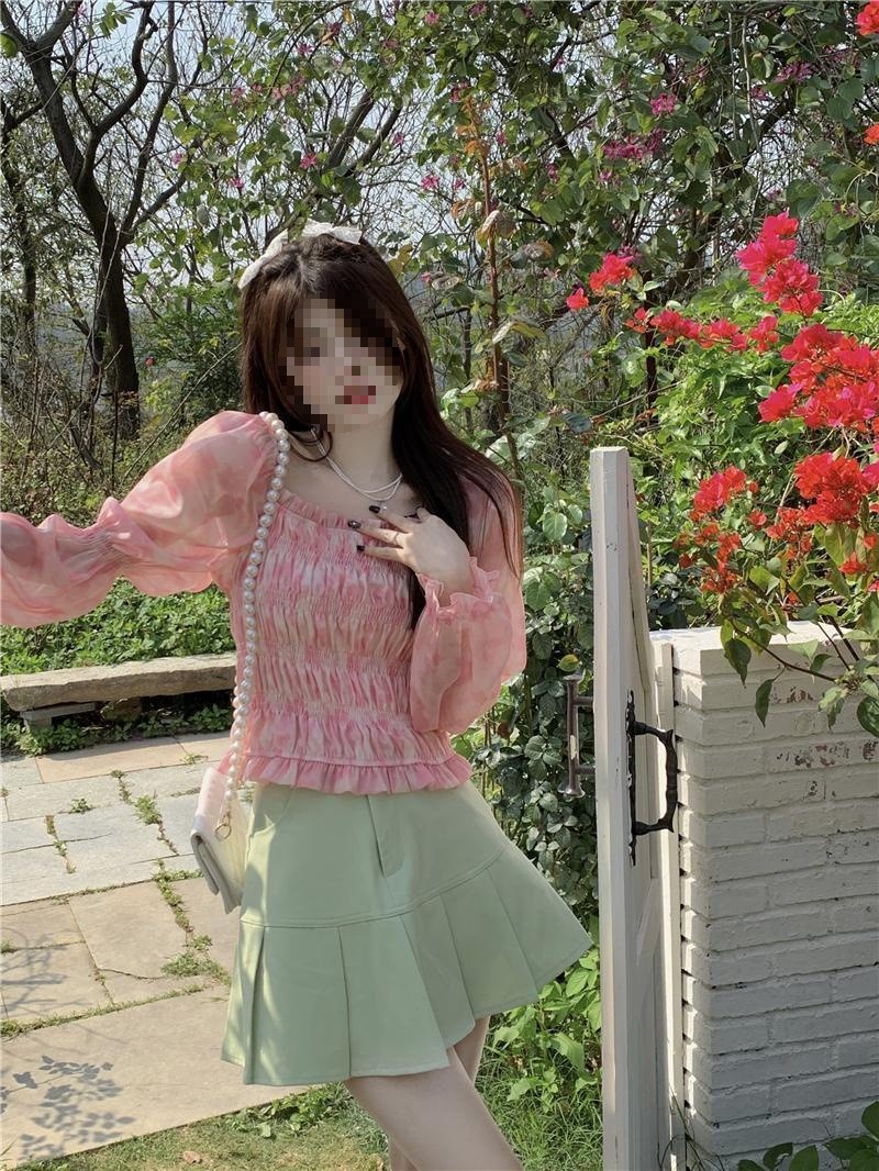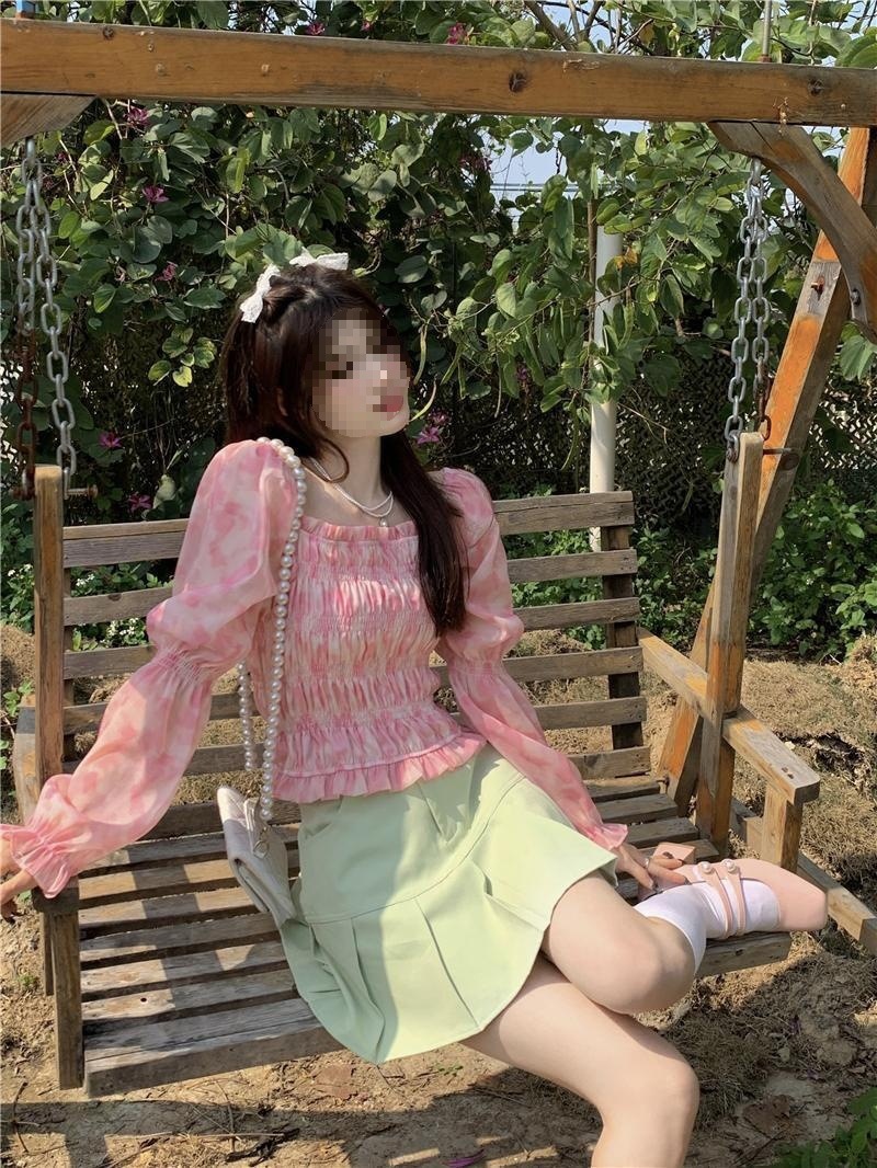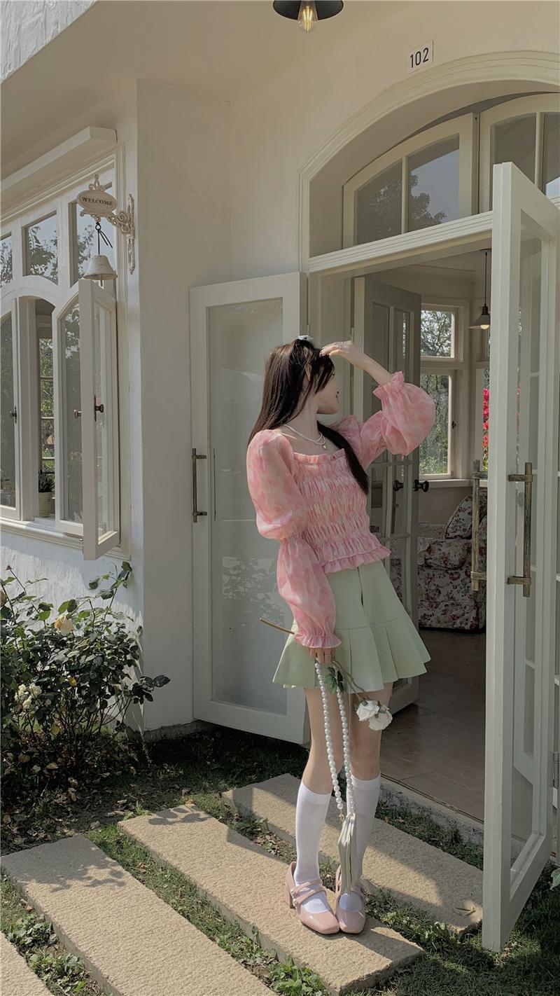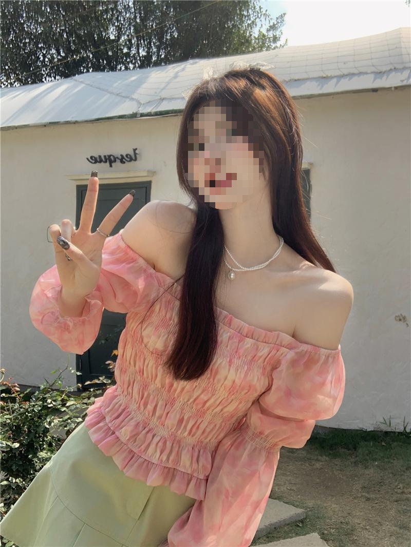 봄과 여름 퍼프 슬리브 틈새 타이트 허리 긴팔 탑 프랑스 스타일 세련된 귀 테두리 스퀘어 칼라 플로랄 시폰 셔츠