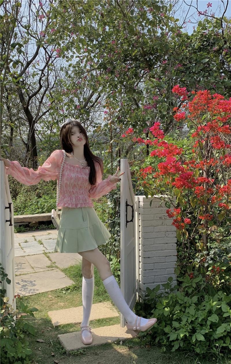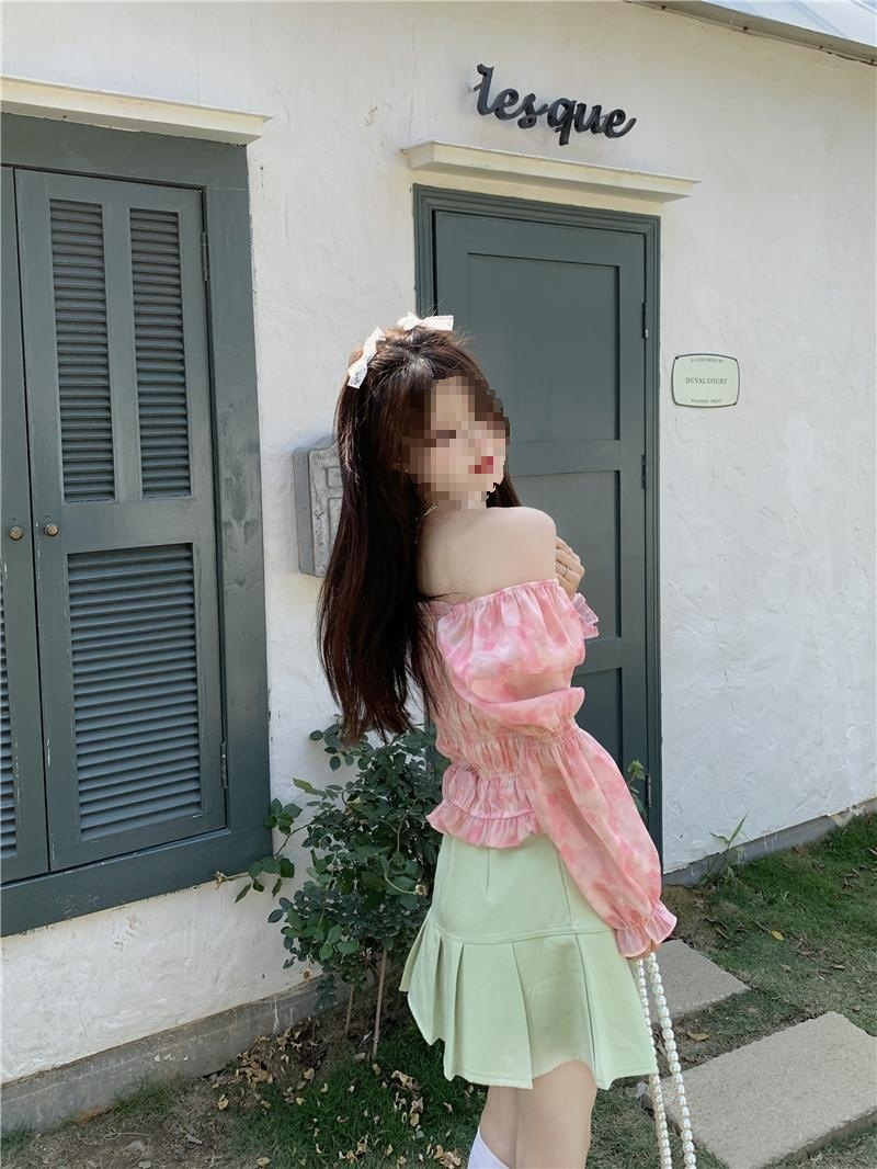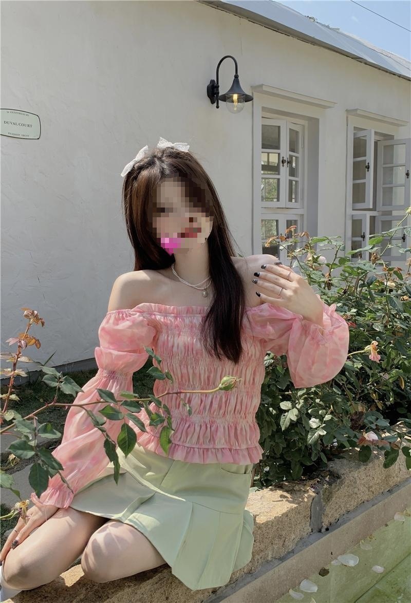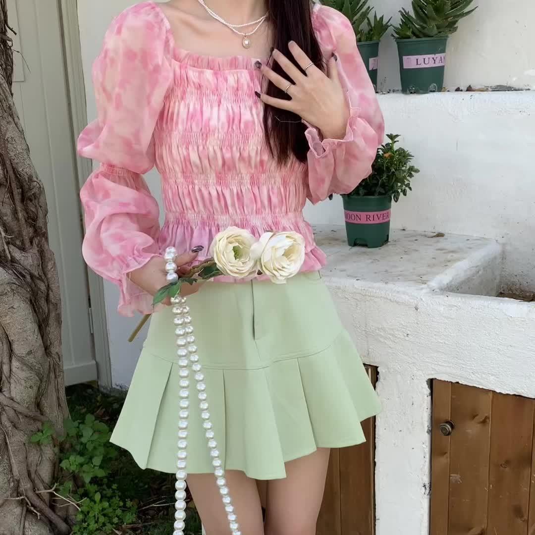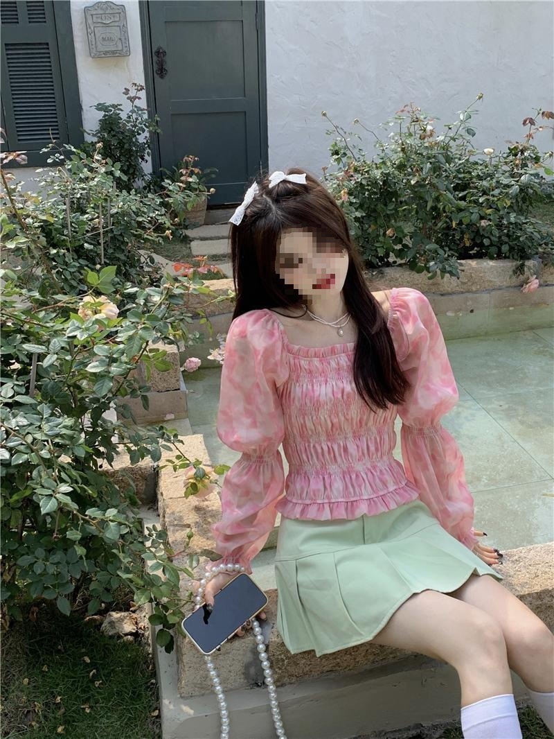 봄과 여름 퍼프 슬리브 틈새 타이트 허리 긴팔 탑 프랑스 스타일 세련된 귀 테두리 스퀘어 칼라 플로랄 시폰 셔츠스토어 가기
