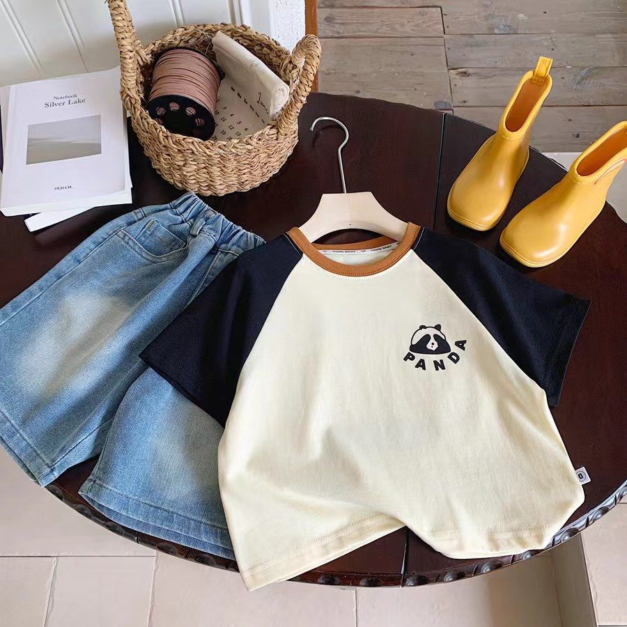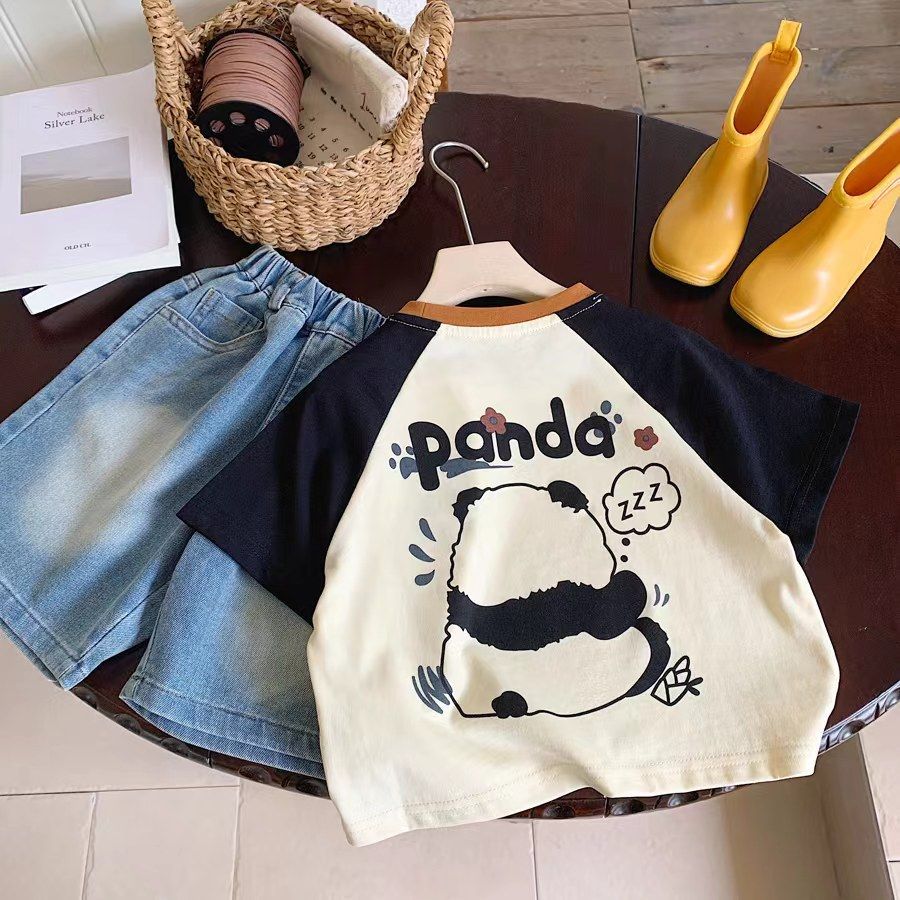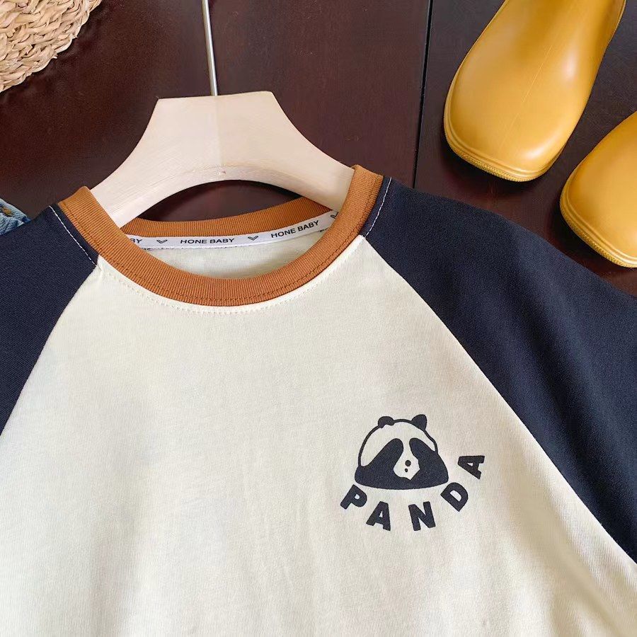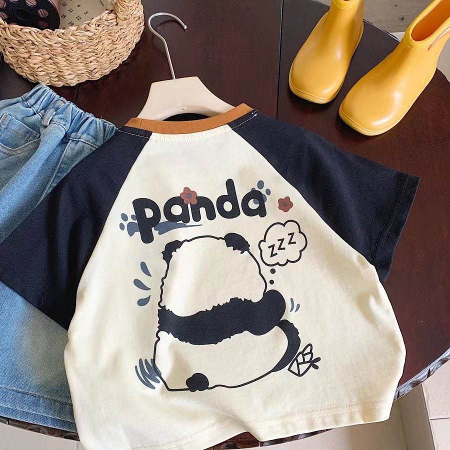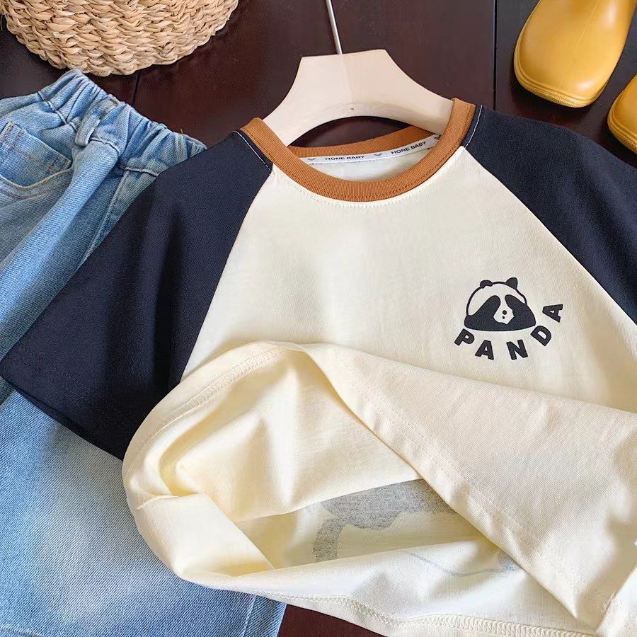 소년 반팔 티셔츠 여름 새로운 어린이 라글란 슬리브 만화 팬더 대비 색상 캐주얼 반소매 풀오버스토어 가기