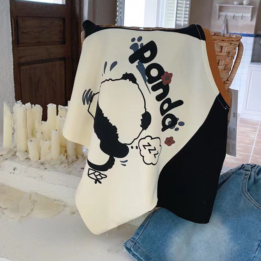 소년 반팔 티셔츠 여름 새로운 어린이 라글란 슬리브 만화 팬더 대비 색상 캐주얼 반소매 풀오버