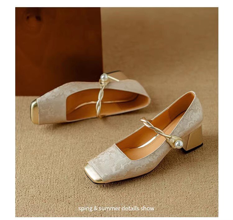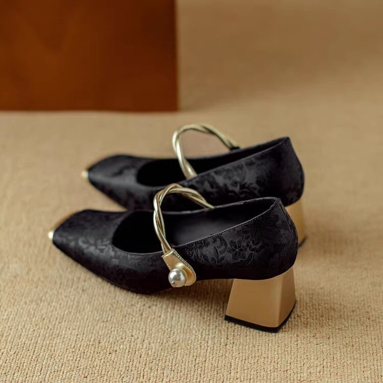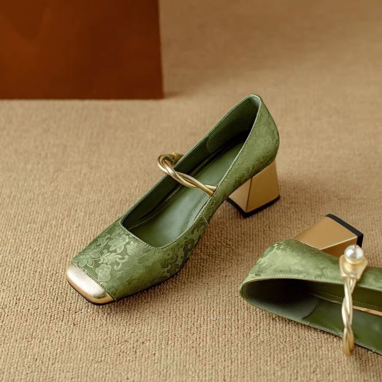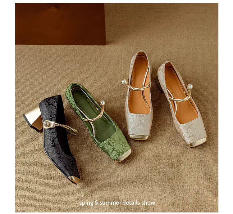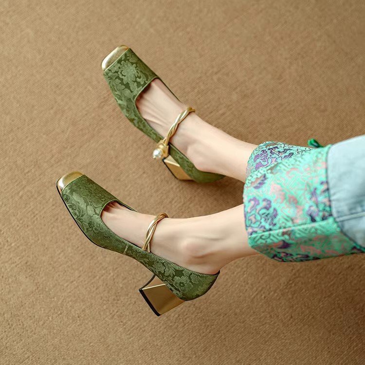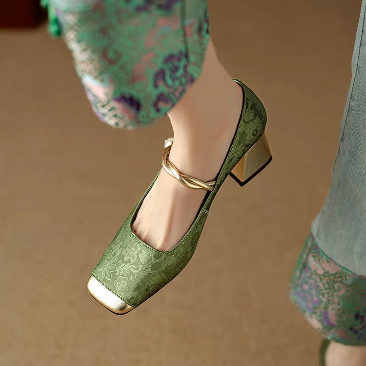 새로운 중국 스타일 싱글 신발 여성 컬러 스플릿 스퀘어 헤드 레트로 두꺼운 힐 메리 제인 신발 내셔널 스타일 하이힐 2024 년 봄