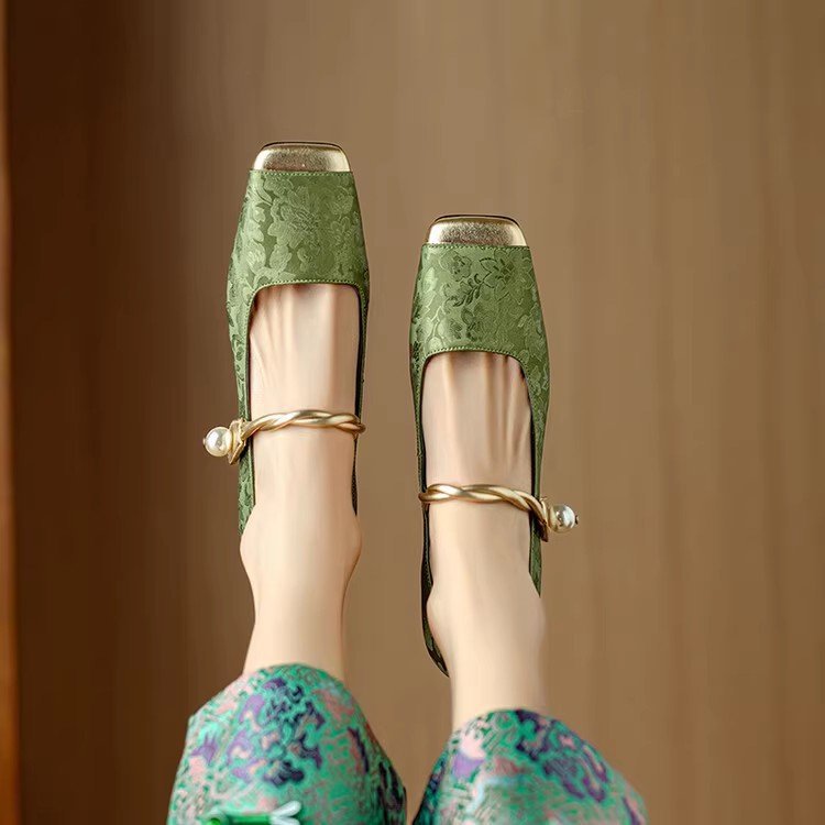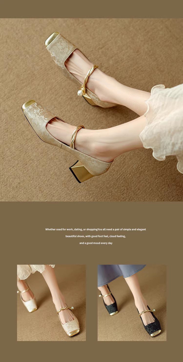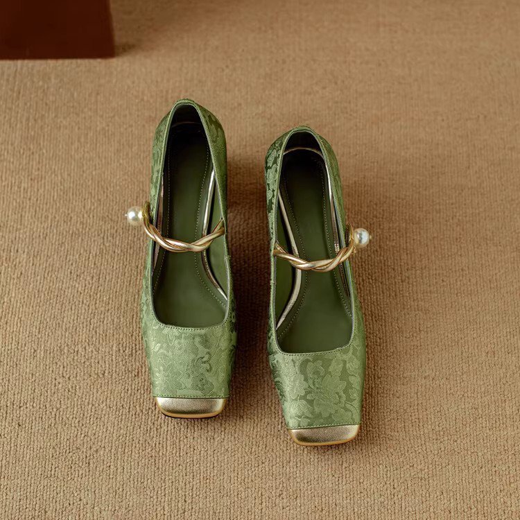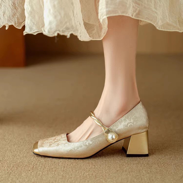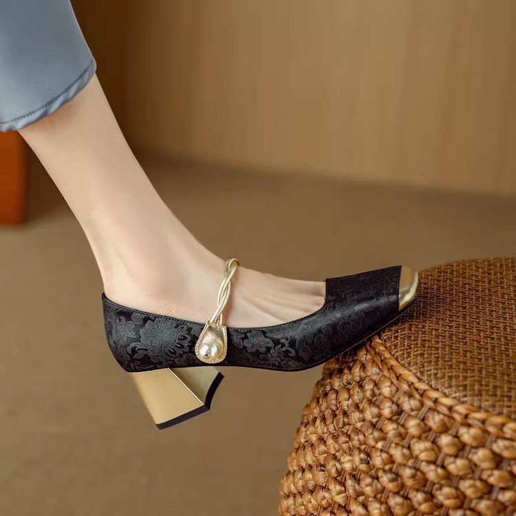 새로운 중국 스타일 싱글 신발 여성 컬러 스플릿 스퀘어 헤드 레트로 두꺼운 힐 메리 제인 신발 내셔널 스타일 하이힐 2024 년 봄