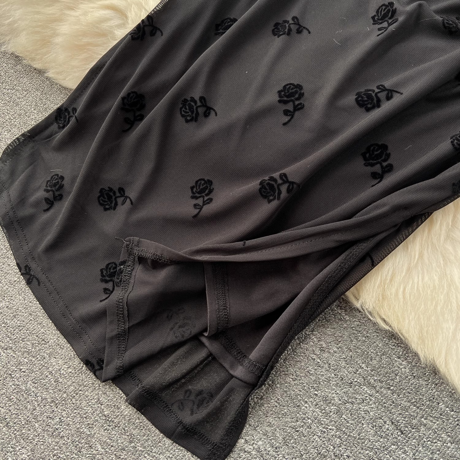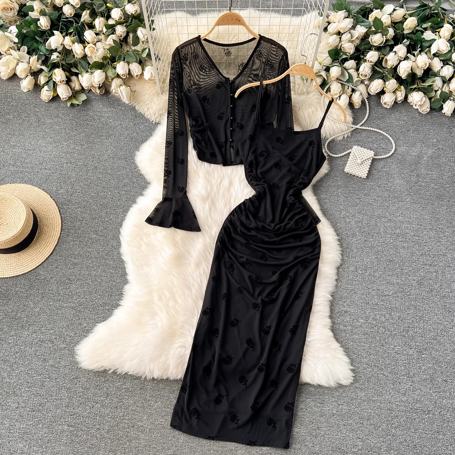 국경 간 빛 성숙한 장미 인쇄 메쉬 슬링 원피스 투피스 여성용 스타일 나이 감소 카디건 쇼트 코트스토어 가기