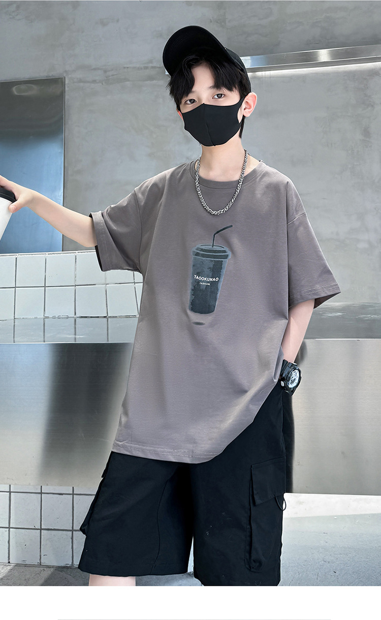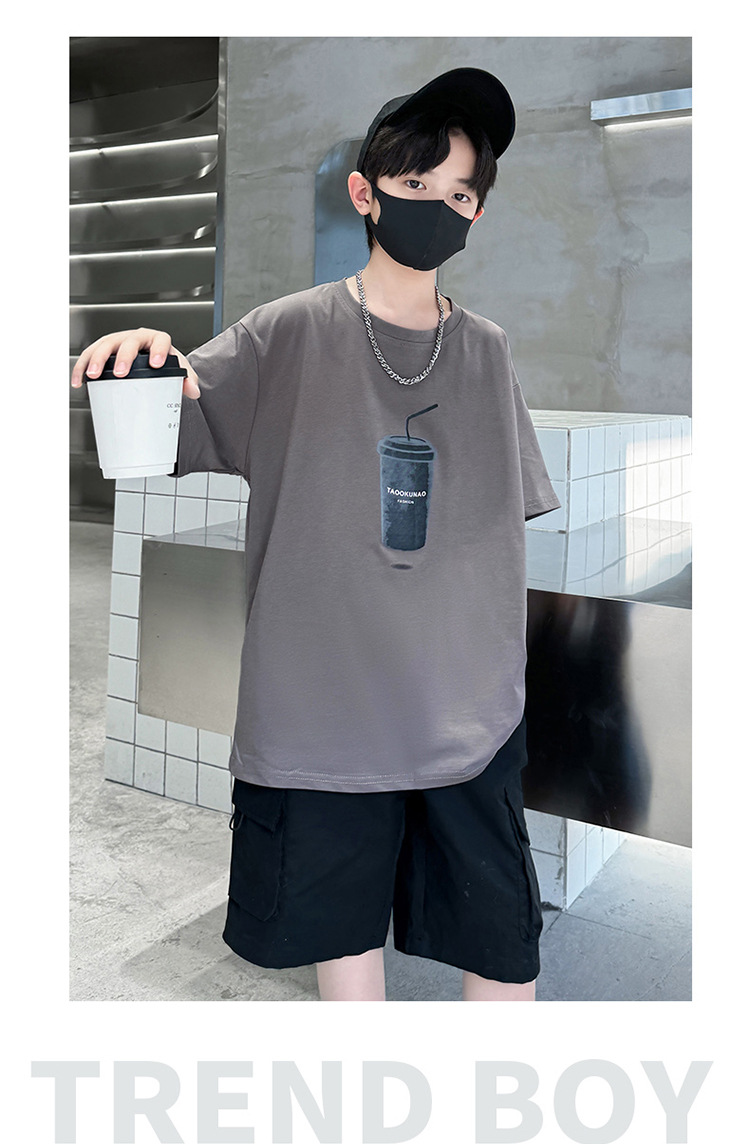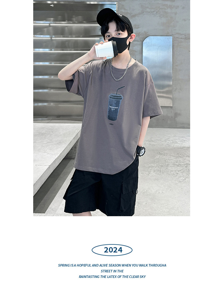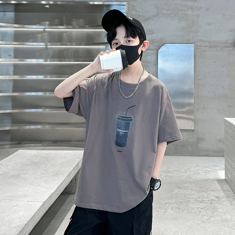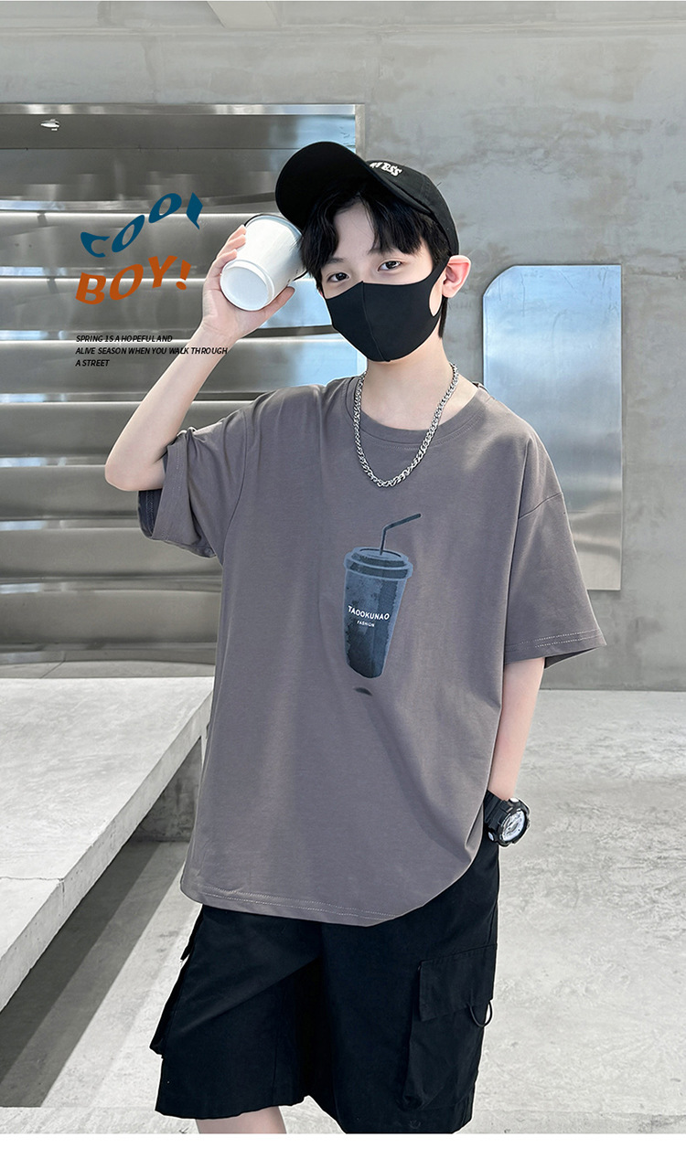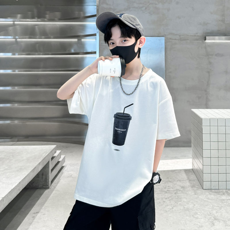 남자들의 여름 반소매 티셔츠 2024 새로운 탑 큰 어린이 여름 패션 브랜드 찻잔 인쇄 소년의 반소매스토어 가기