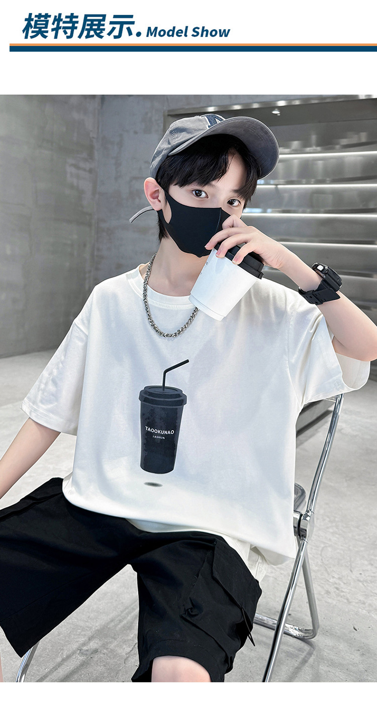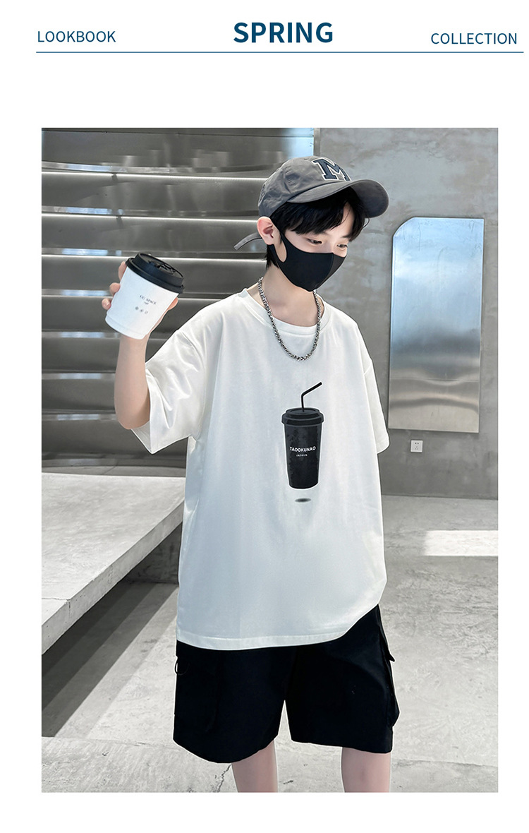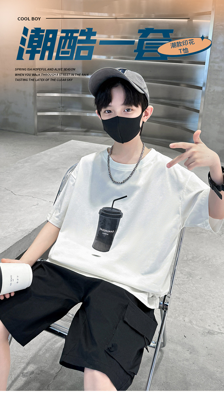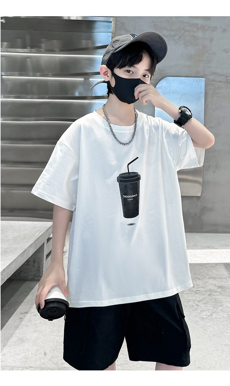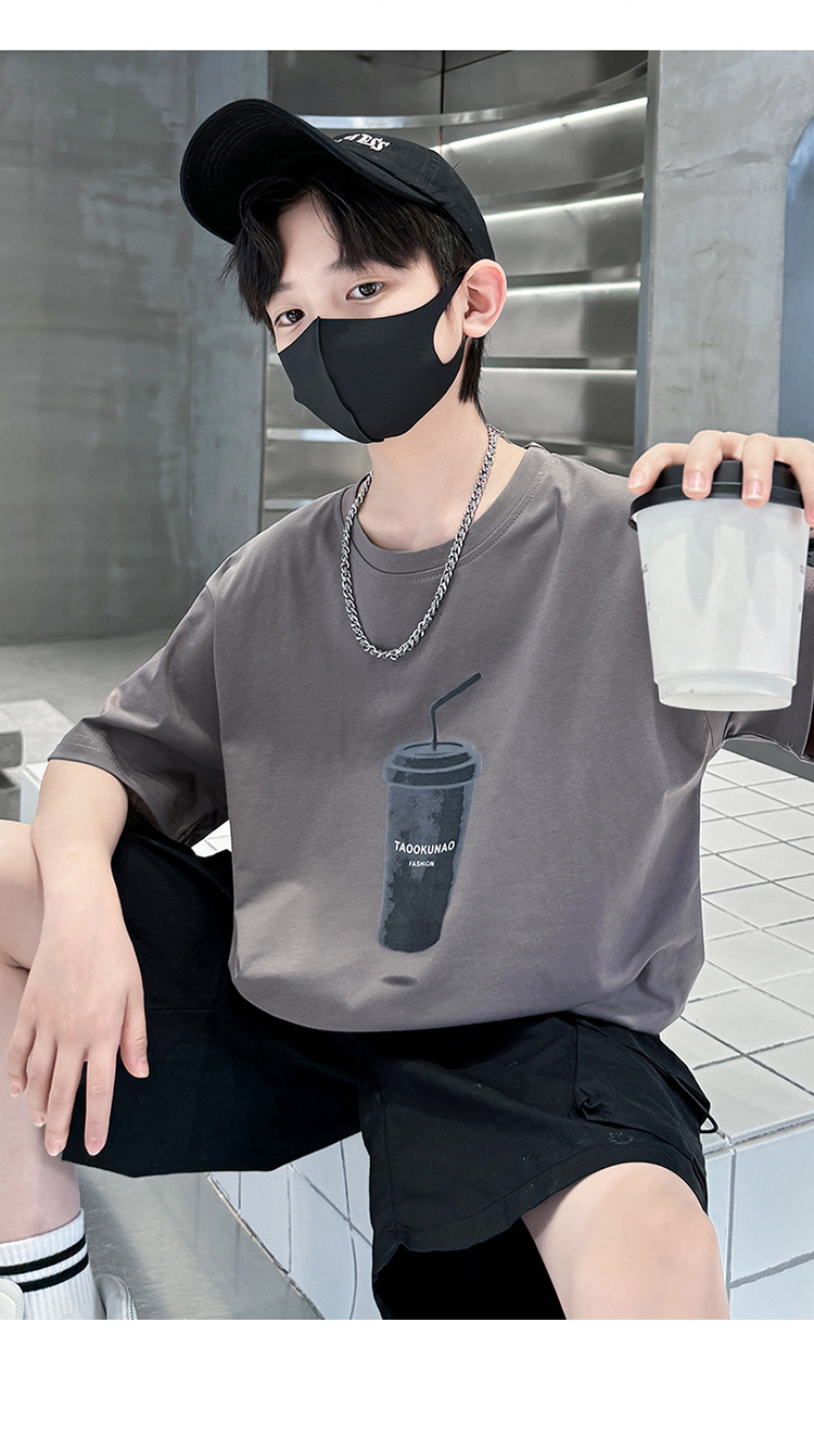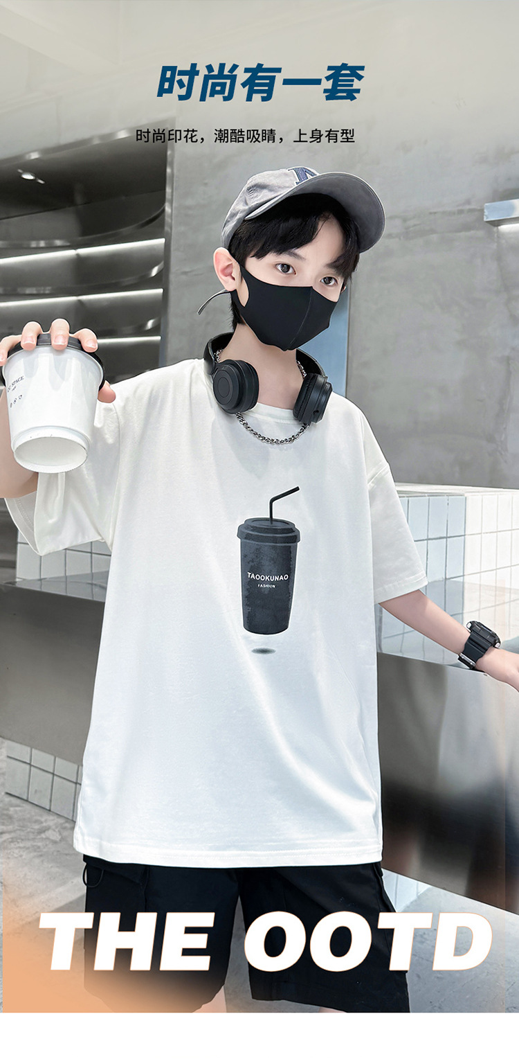 남자들의 여름 반소매 티셔츠 2024 새로운 탑 큰 어린이 여름 패션 브랜드 찻잔 인쇄 소년의 반소매스토어 가기