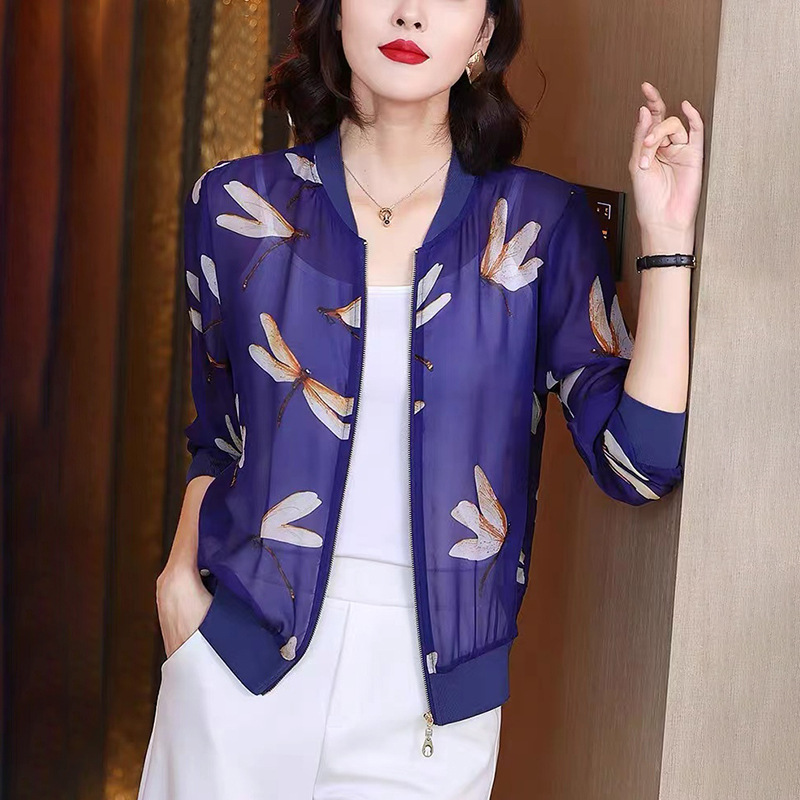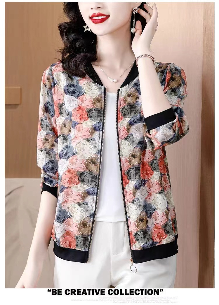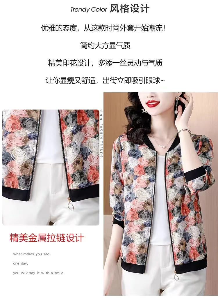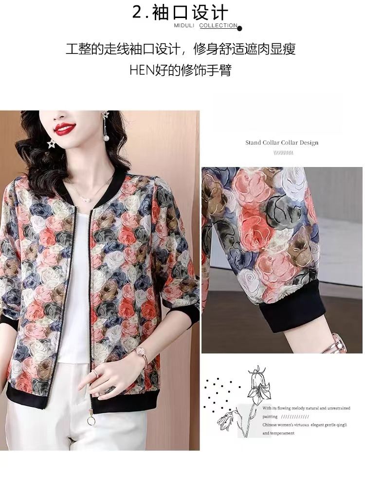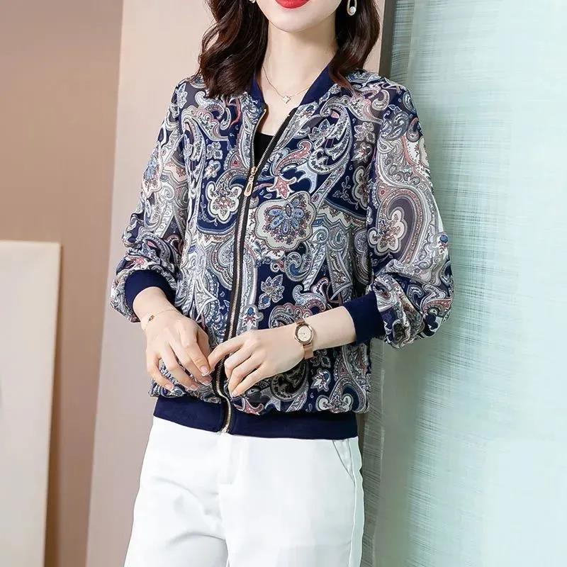 2024 년 여름 새로운 중년 어머니 야구 세트 코트 여성 인쇄 지퍼 재킷 유행 쉬폰 선스크린 셔츠스토어 가기