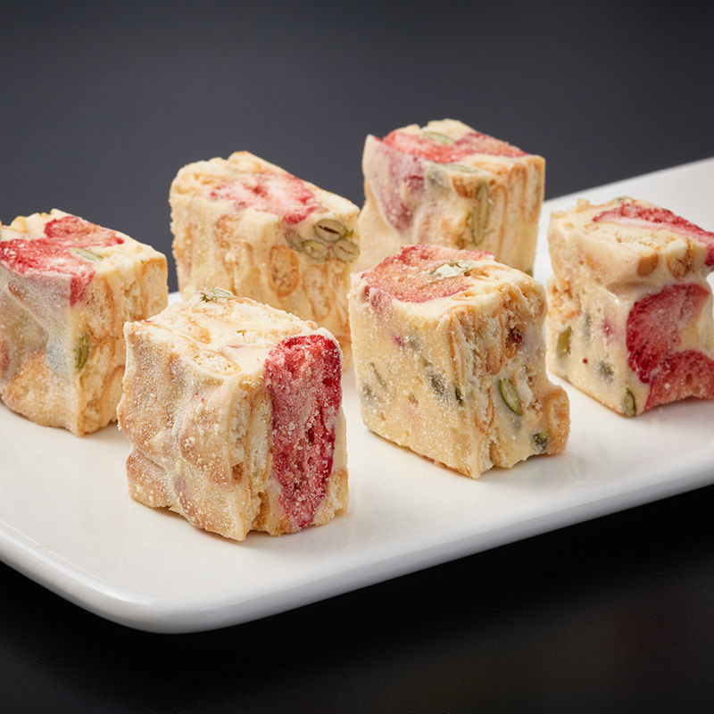 그물 빨간 딸기 우유 푸 냉동 건조 딸기 눈송이 선명한 전통 케이크 눈송이 바삭 바삭한 염소 우유 푸 머리카락 한 세대