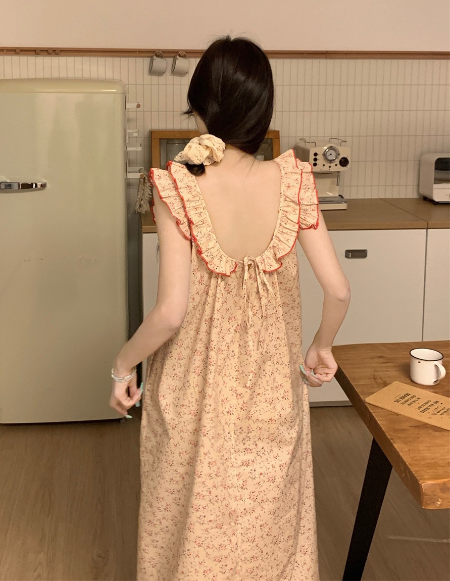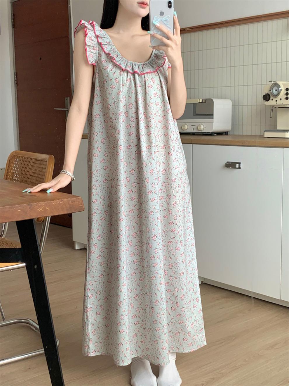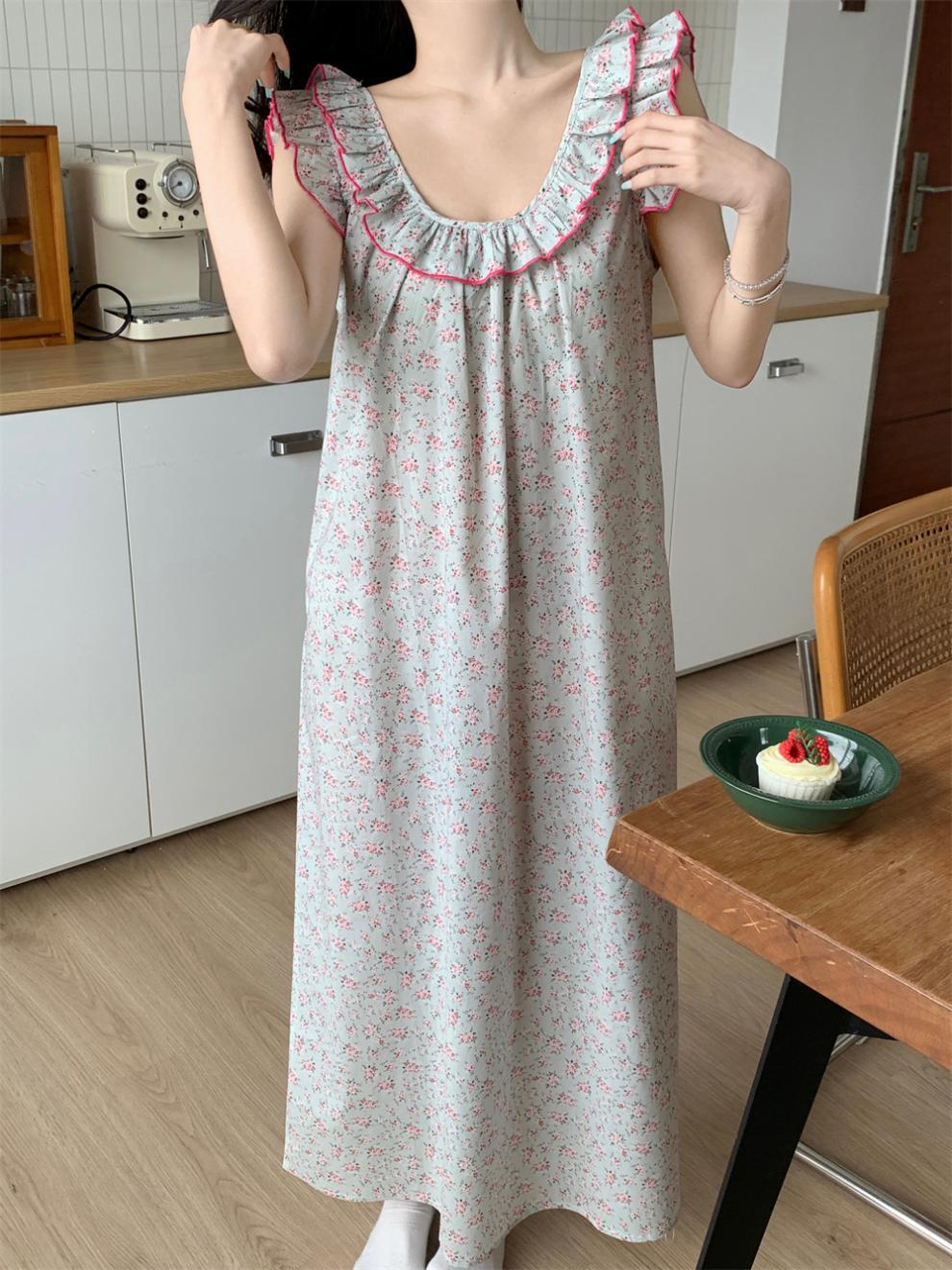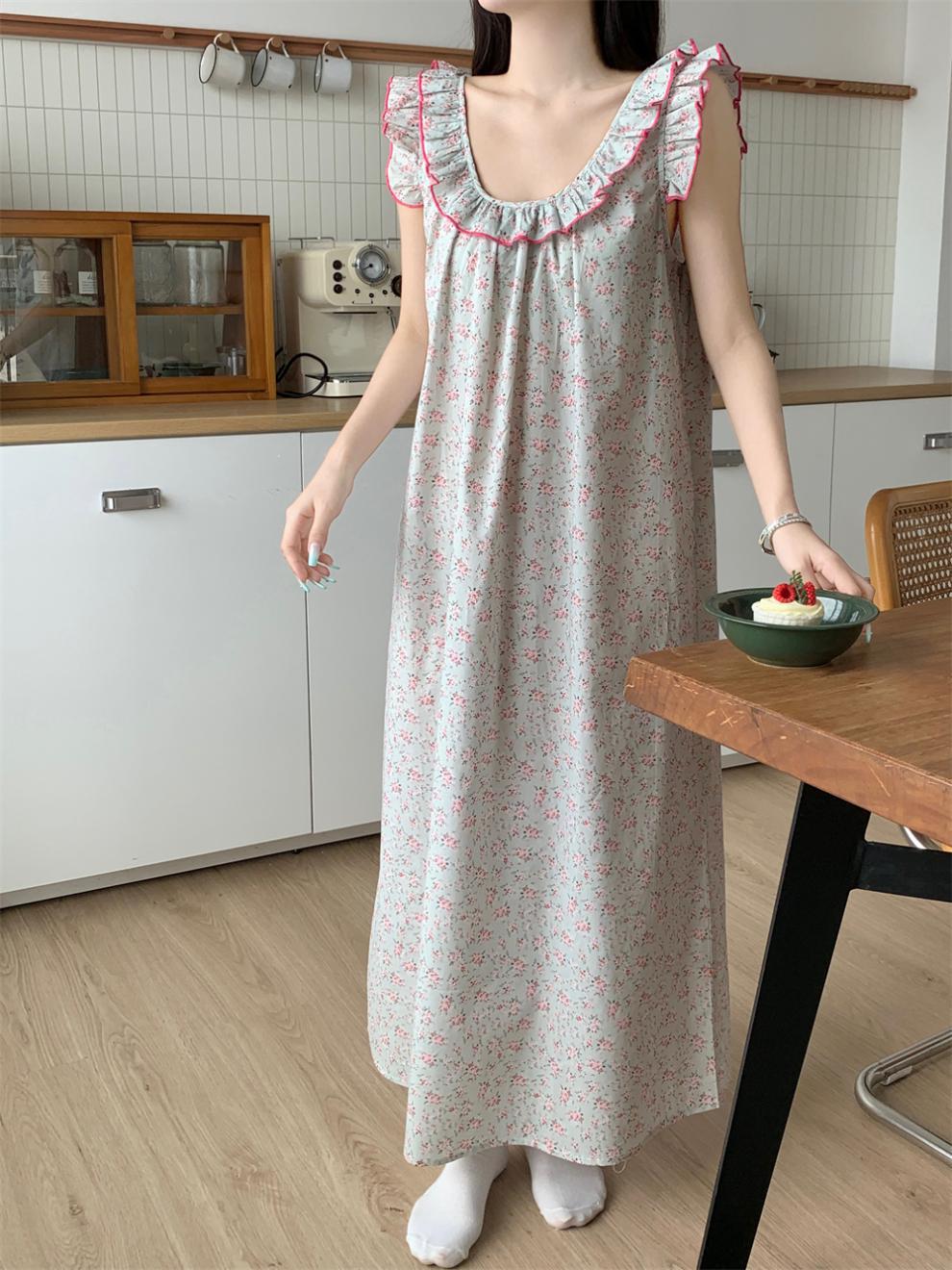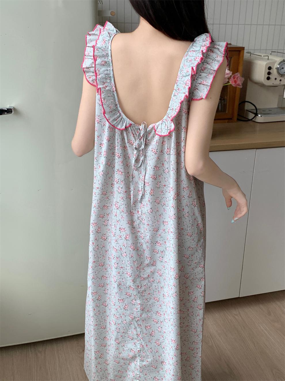 2024 한국 스타일 빈티지 플로랄 코튼 러플 슬링 백리스 파자마 홈 옷 나이트 드레스 여성의 여름 새로운스토어 가기