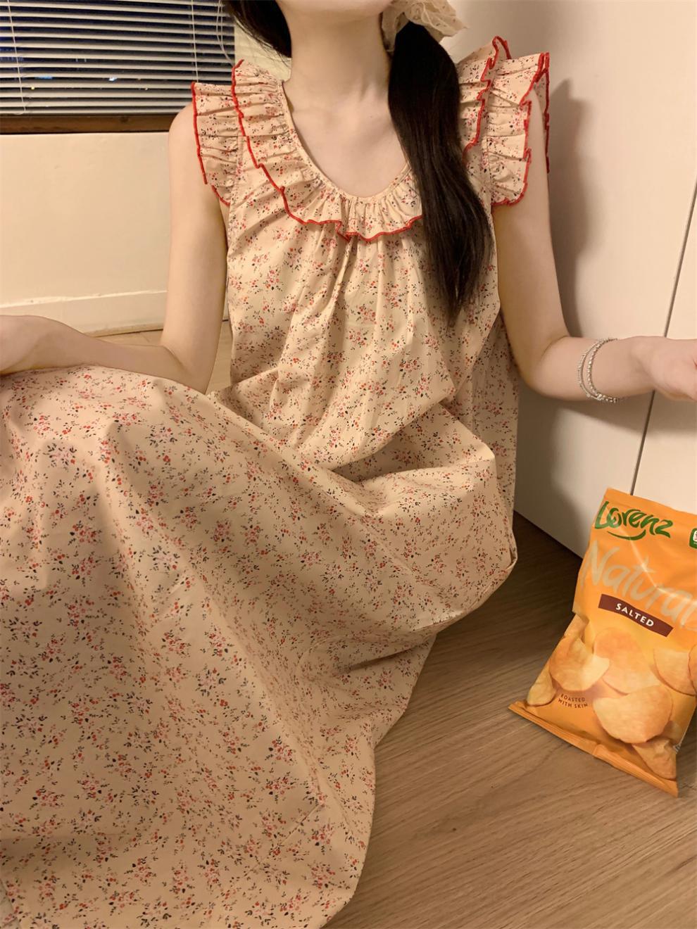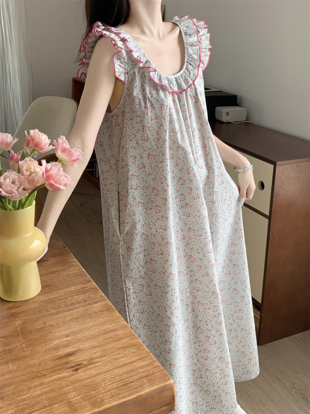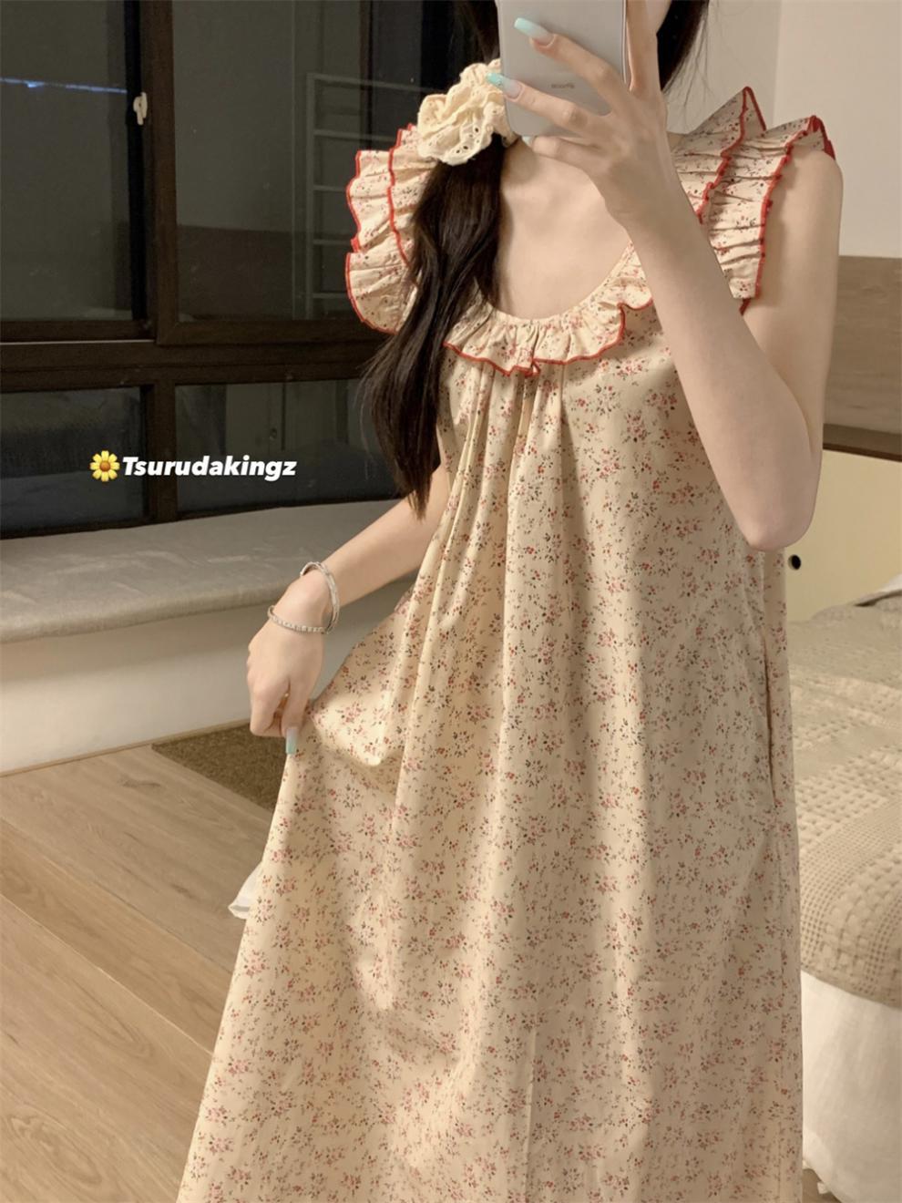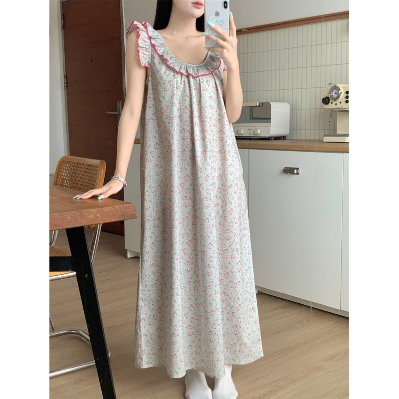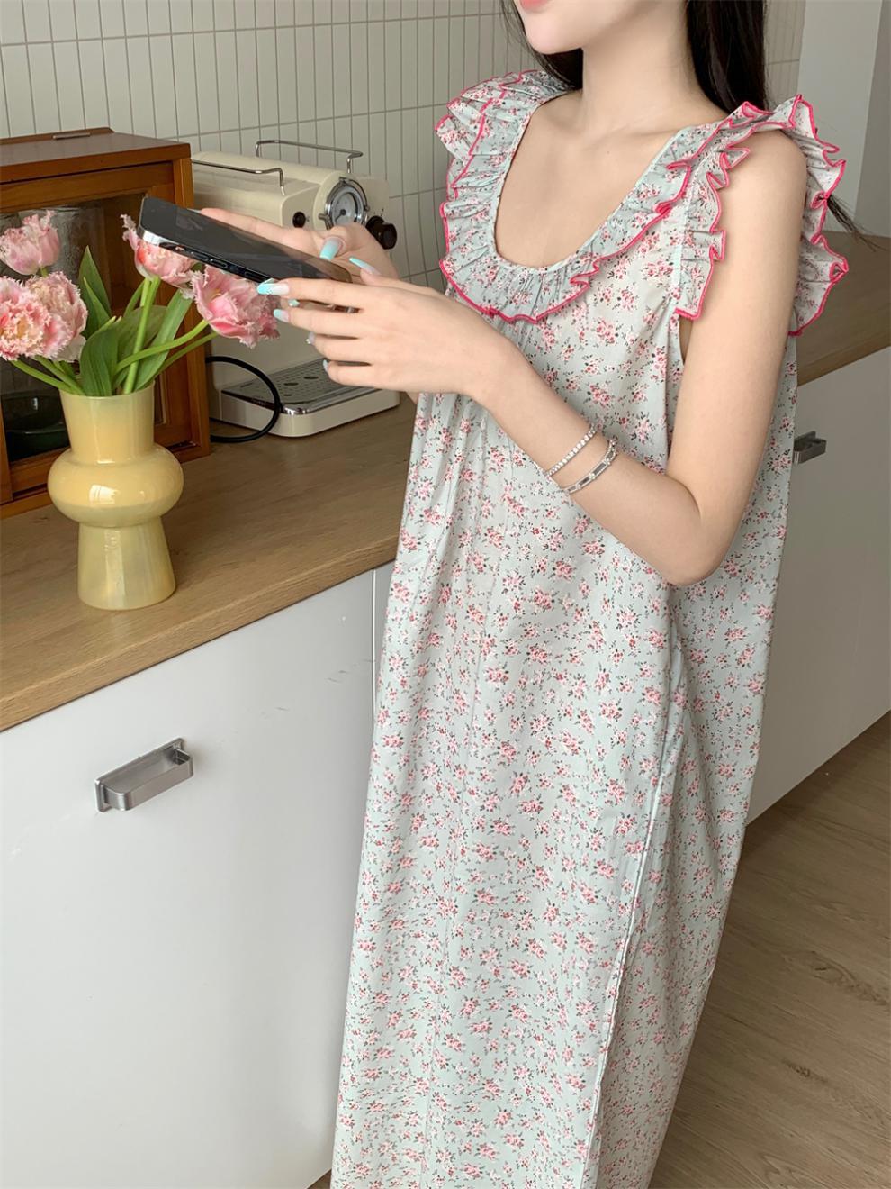 2024 한국 스타일 빈티지 플로랄 코튼 러플 슬링 백리스 파자마 홈 옷 나이트 드레스 여성의 여름 새로운스토어 가기