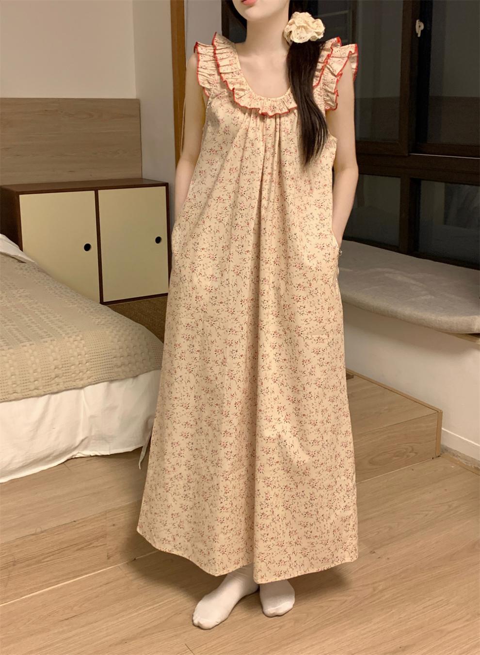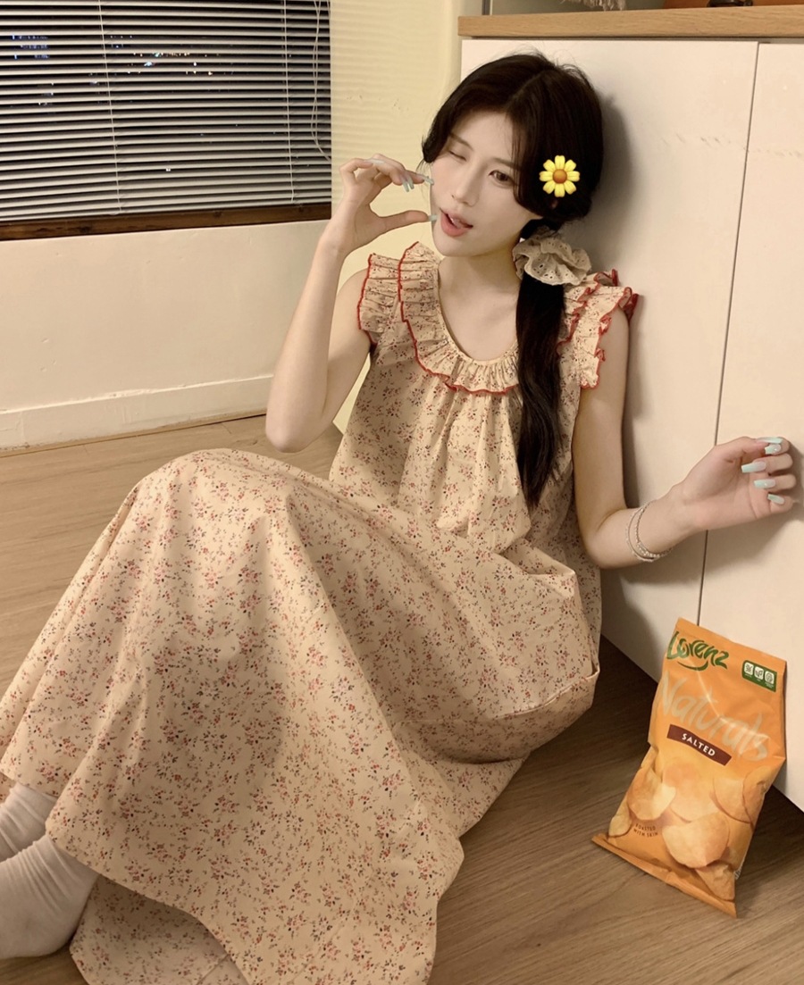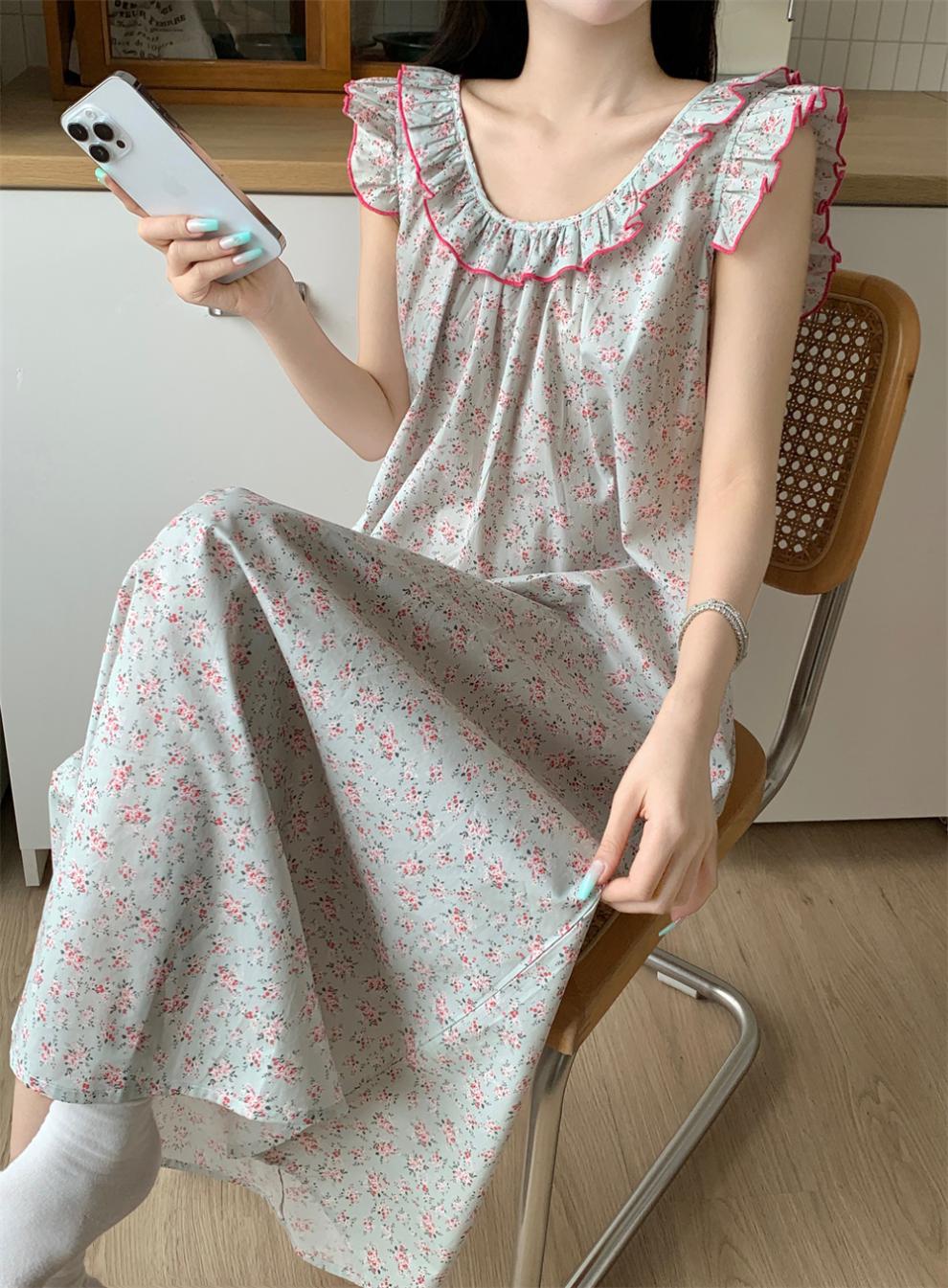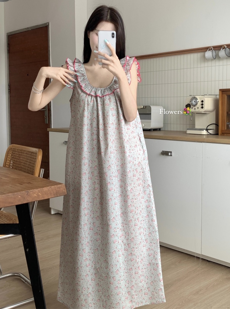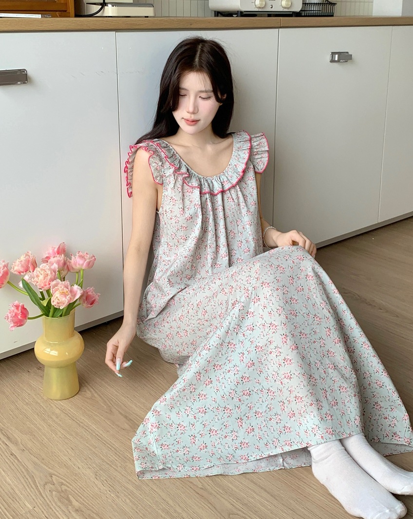 2024 한국 스타일 빈티지 플로랄 코튼 러플 슬링 백리스 파자마 홈 옷 나이트 드레스 여성의 여름 새로운스토어 가기