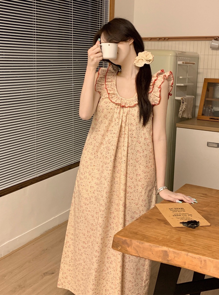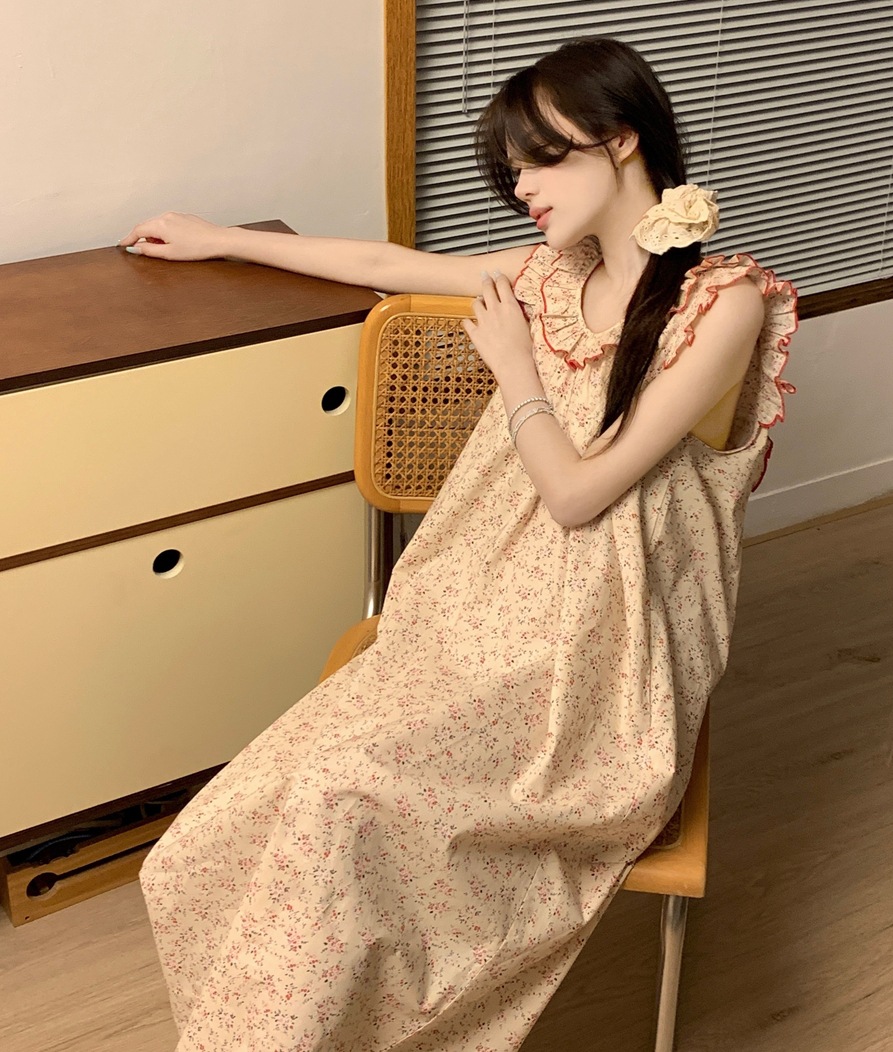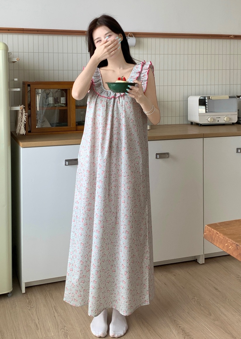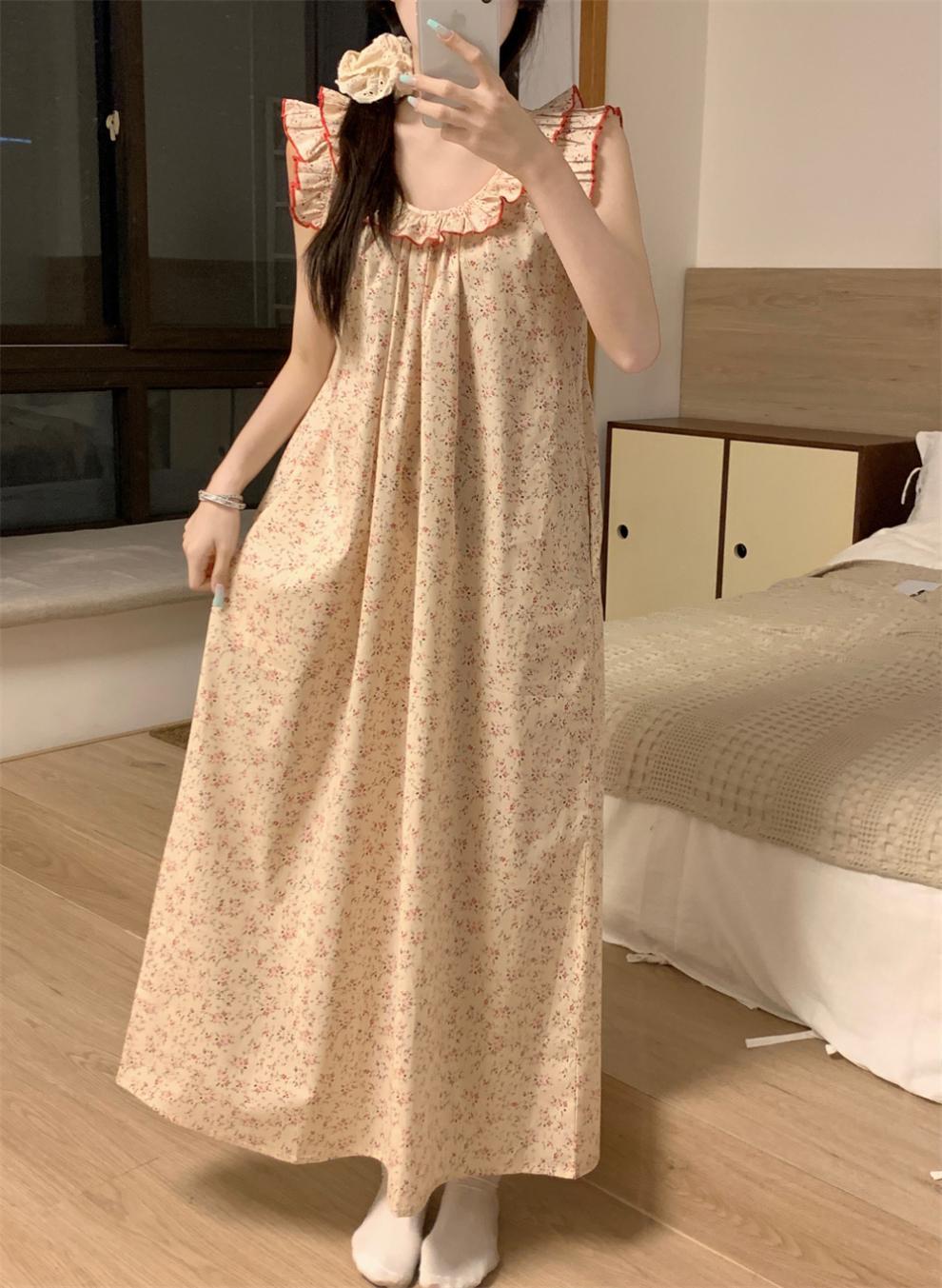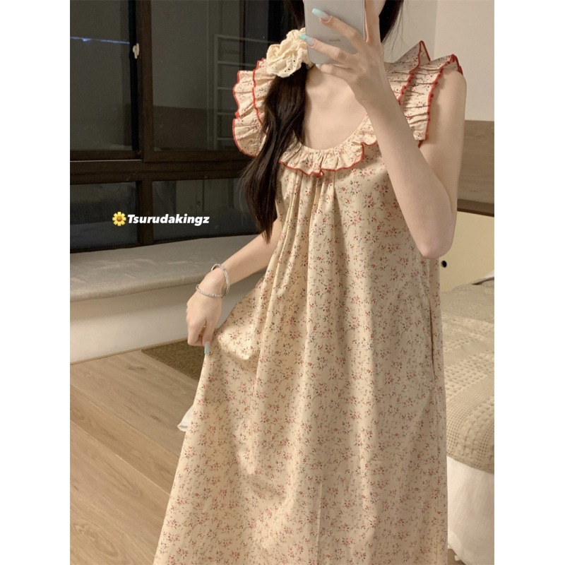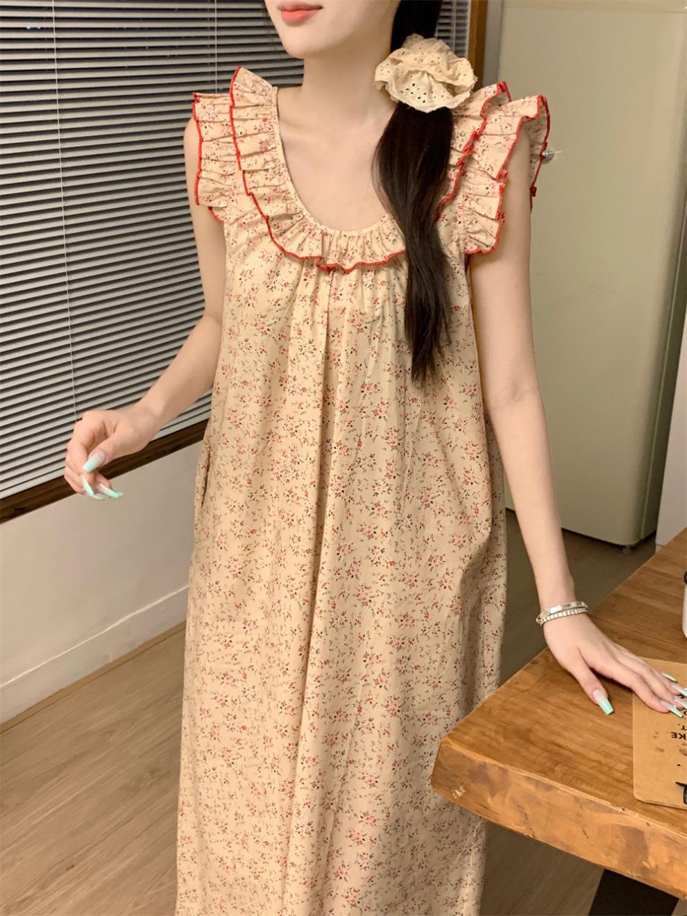 2024 한국 스타일 빈티지 플로랄 코튼 러플 슬링 백리스 파자마 홈 옷 나이트 드레스 여성의 여름 새로운스토어 가기