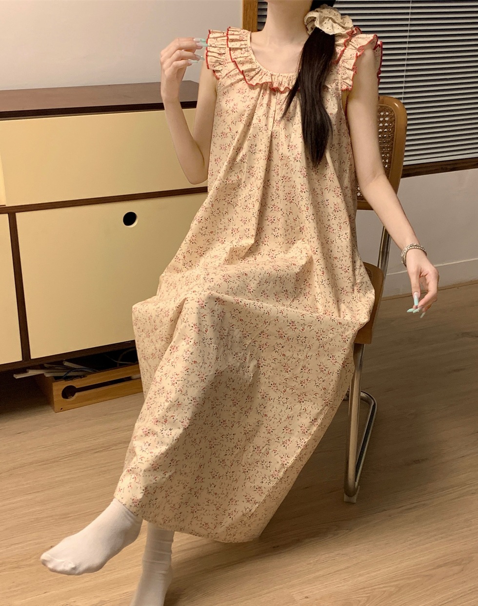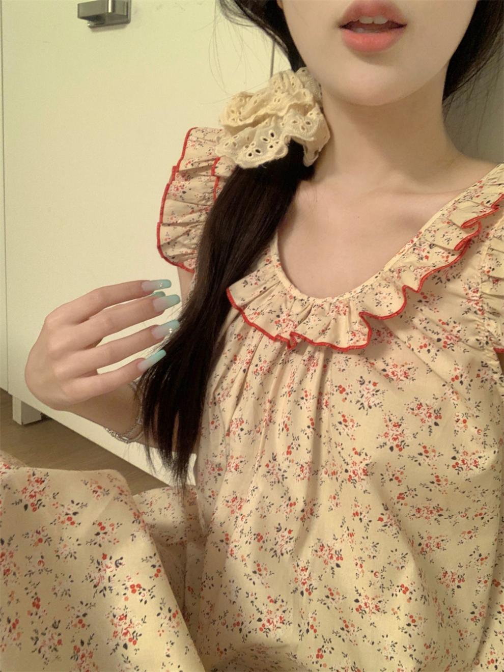 2024 한국 스타일 빈티지 플로랄 코튼 러플 슬링 백리스 파자마 홈 옷 나이트 드레스 여성의 여름 새로운